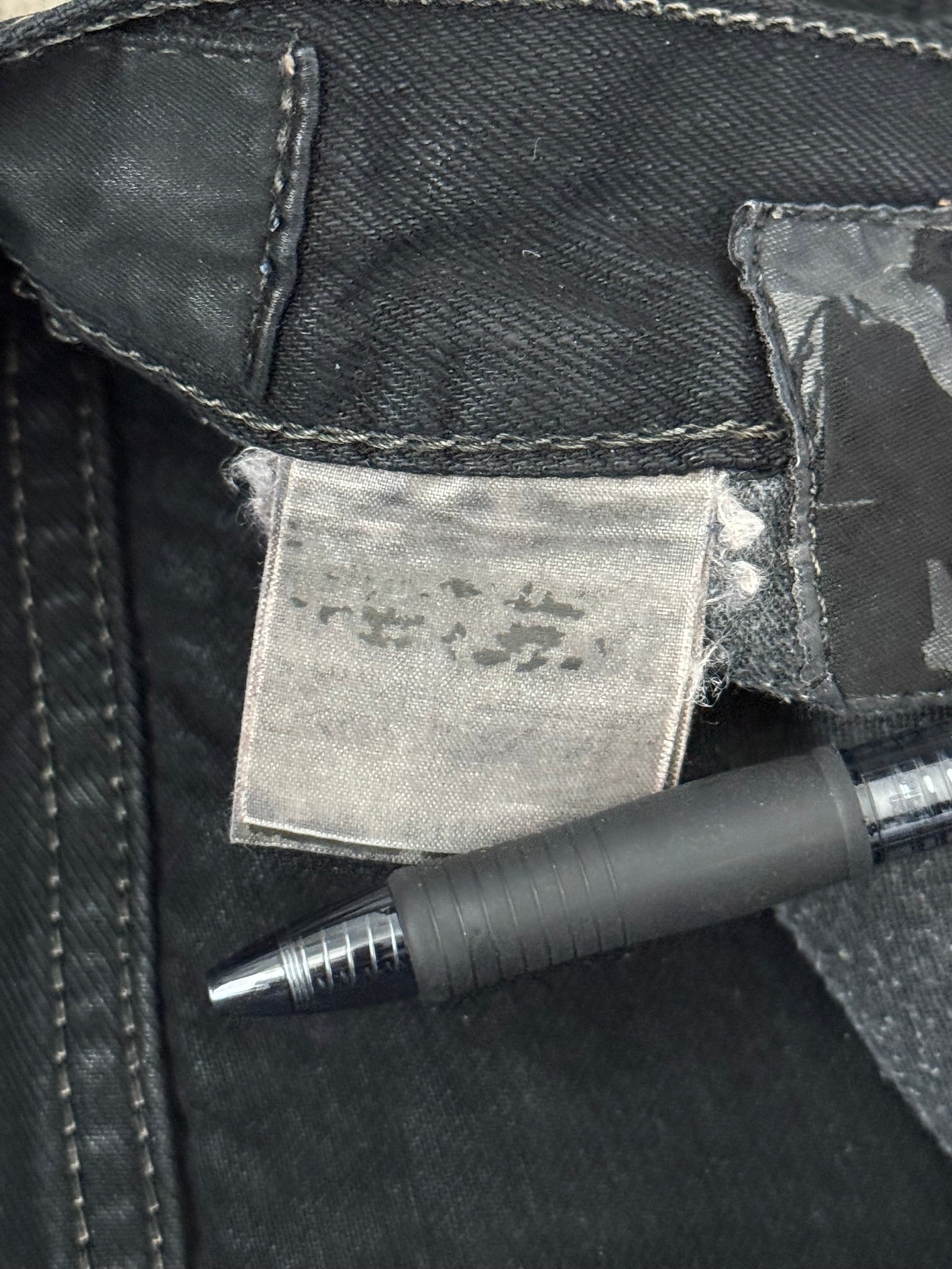 From Rick Owens’s DRKSHDW line. These slim "Detroit" cut pants made from a black denim, made around the early 2000s with the old Olmar & Mirta tags, features a very light wax coating throughout, six pocket construction, a button fly, raw hems, and the classic DRKSHDW tail (was cut in half by previous owner). Beautifully worn in with distressing throughout, specifically at the waist. In good condition, holes at back pockets; no other real flaws. Everything as pictured. Made in Italy. Tagged a size 30, fits bigger.
