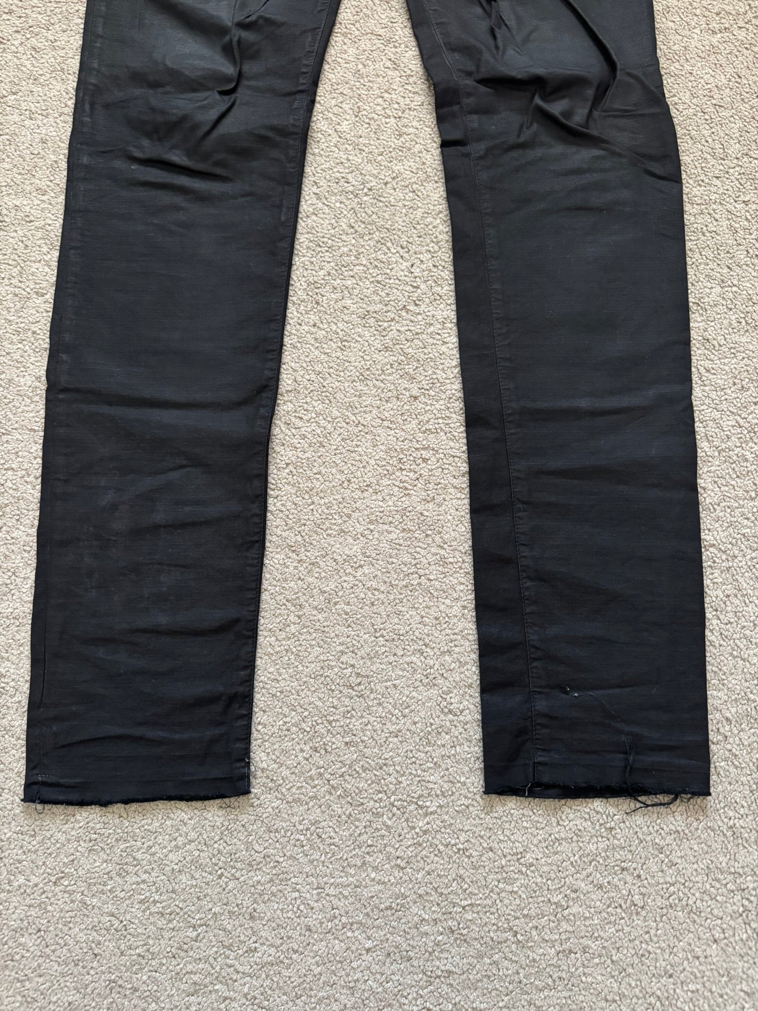 From Rick Owens’s DRKSHDW line. These slim "Detroit" cut pants made from a black cotton ripstop, made around 2010-2013 with the old Olmar & Mirta tags, features a slight wax coating throughout, six pocket construction, a button fly, raw hems, and the classic DRKSHDW tail. In good condition, minor wear throughout with one front dart slightly unstitched; no other real flaws. Everything as pictured. Made in Italy. Tagged a size 31.