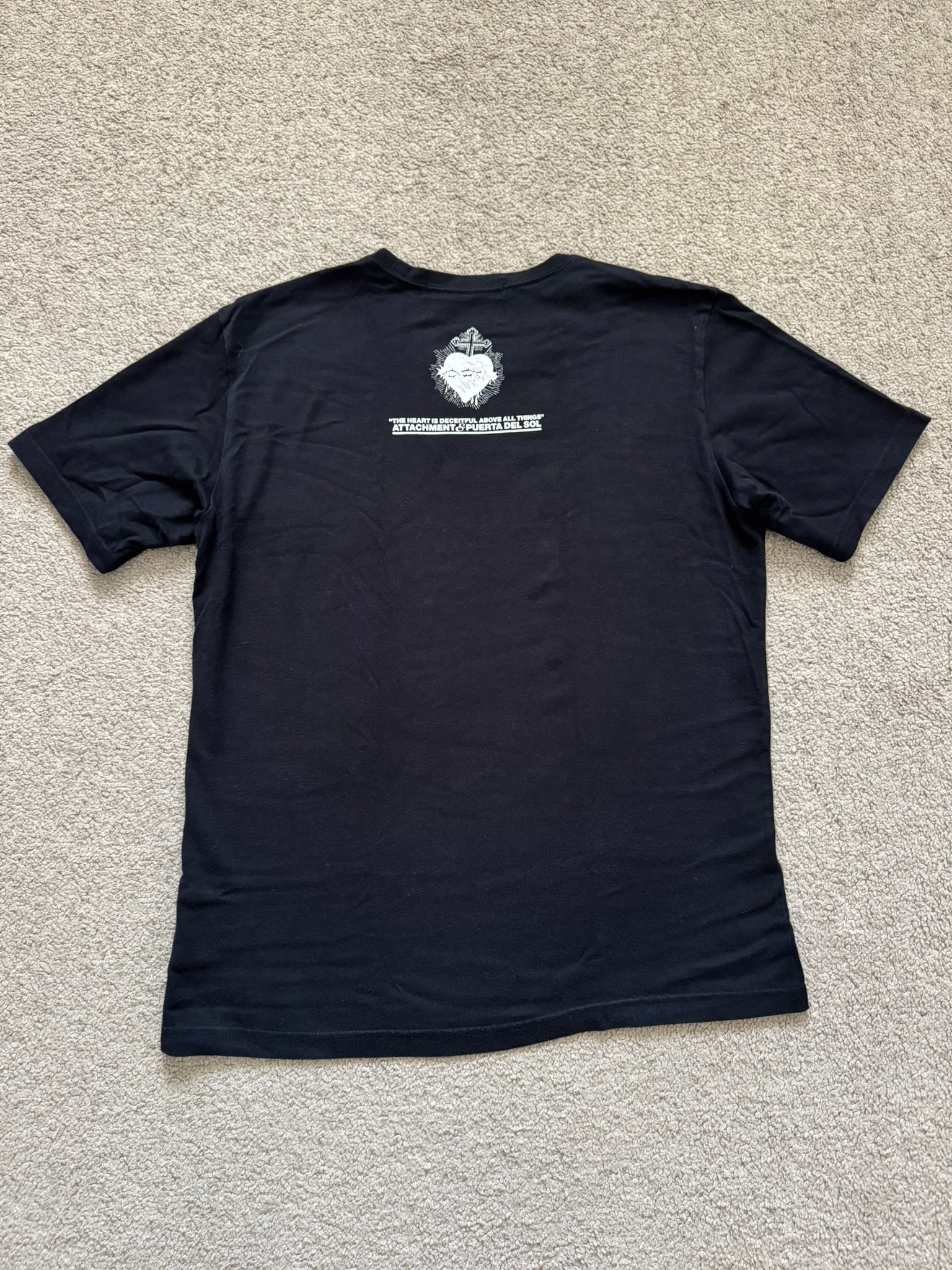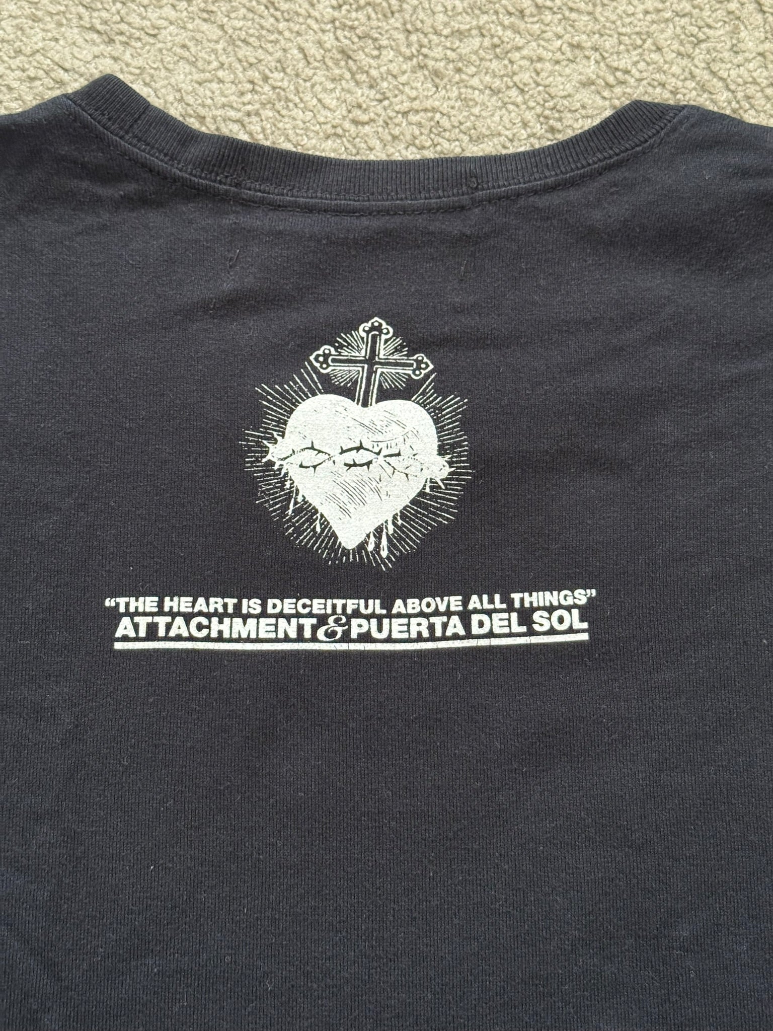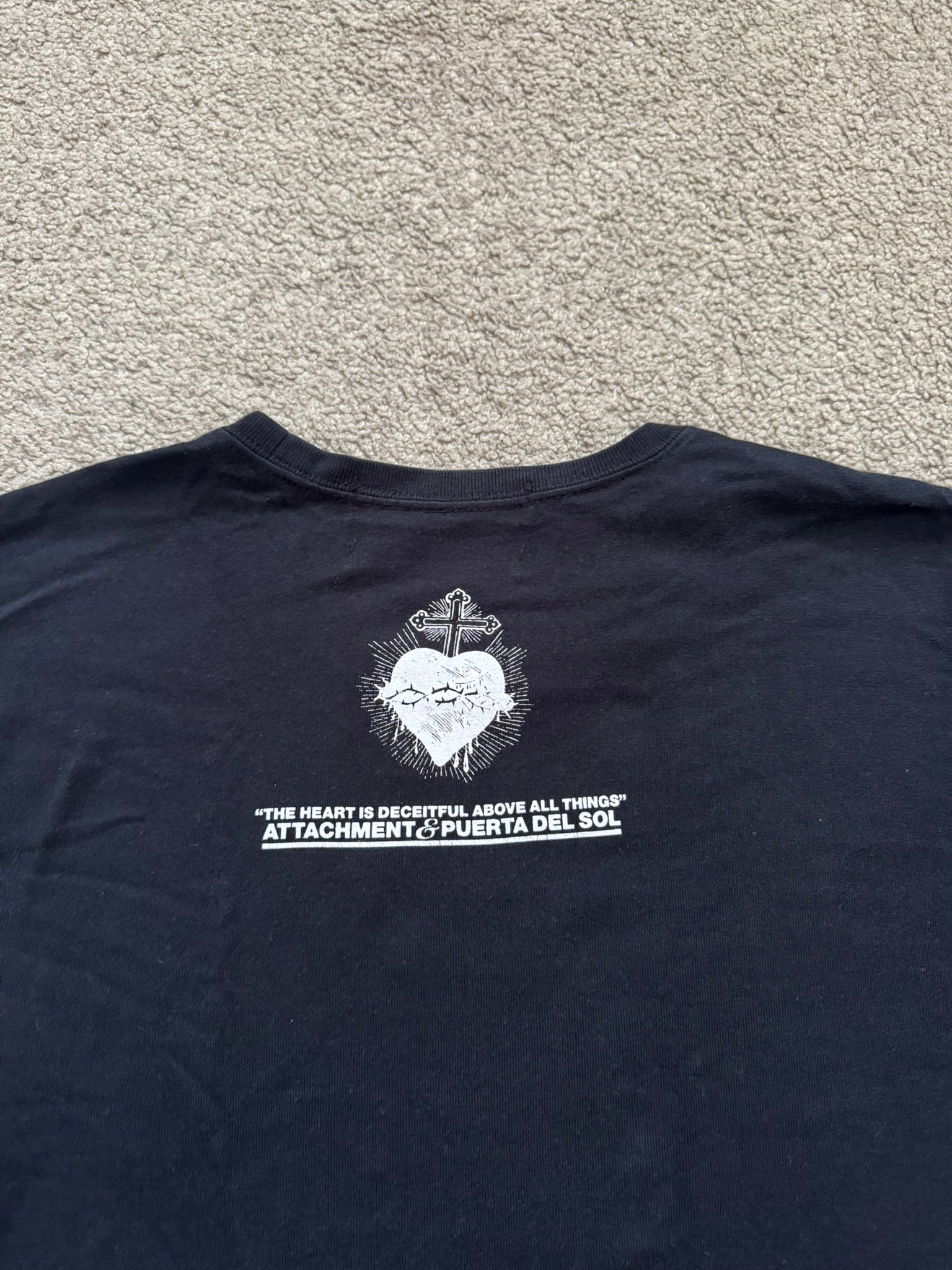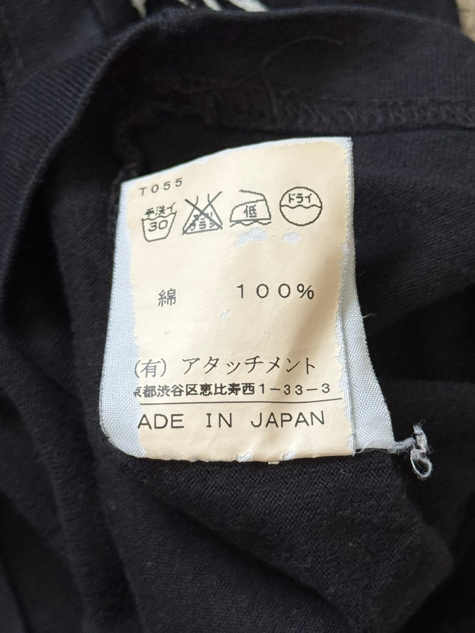 From the Japanese label Attachment made by Kazuyuki Kumagai in collaboration with another Japanese brand Puerta Del Sol. This black tee features abstract stick figure like faces on the front with a heart + cross graphic on the back with text logos. In good condition, some tiny pinholes on the front; no other real flaws. Made in Japan. Tagged a size JP 2.