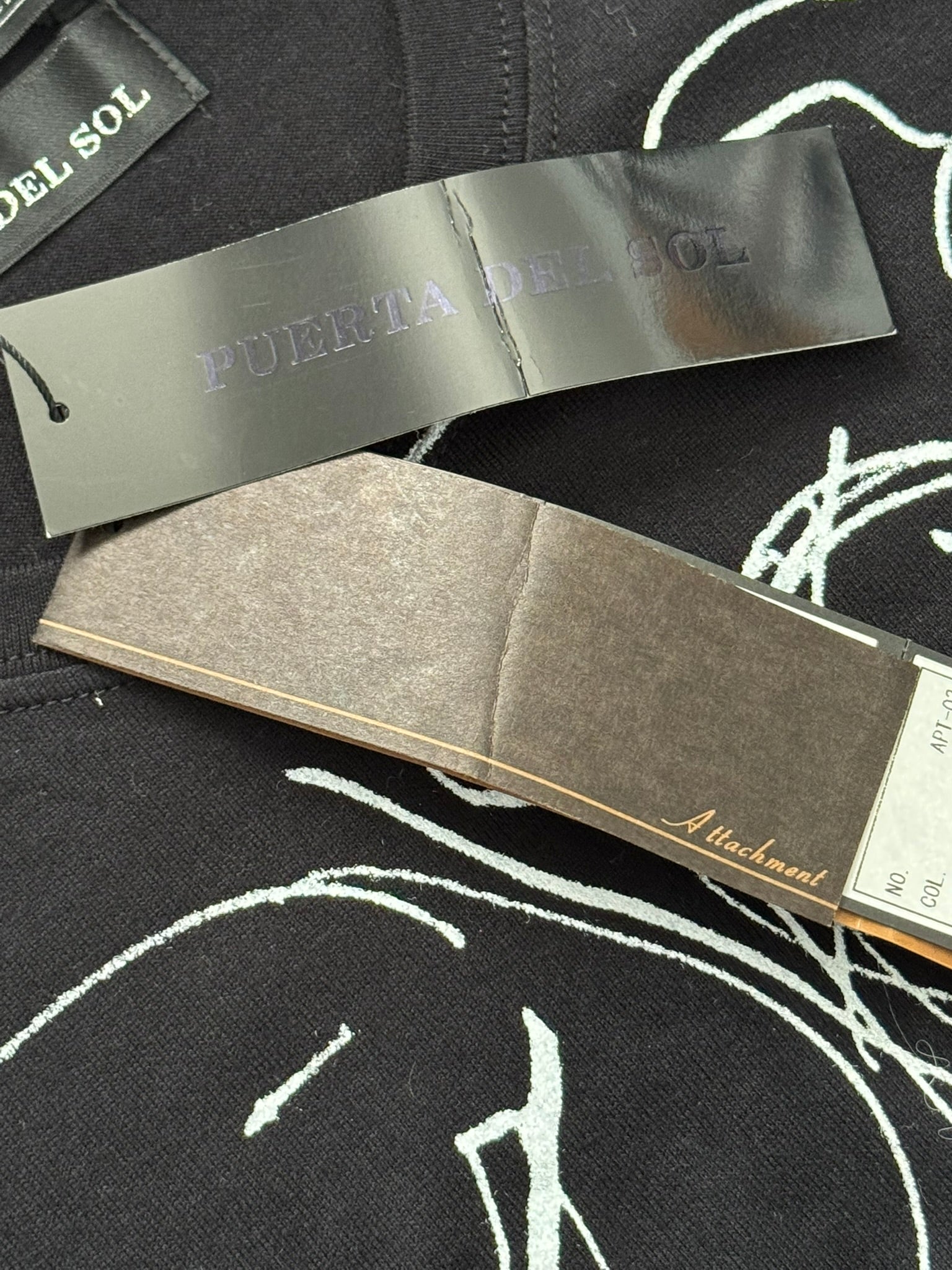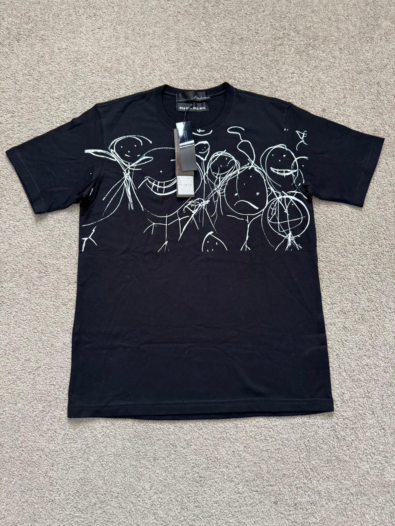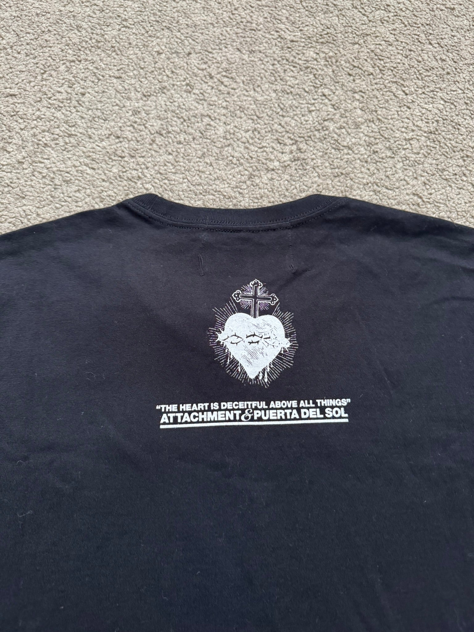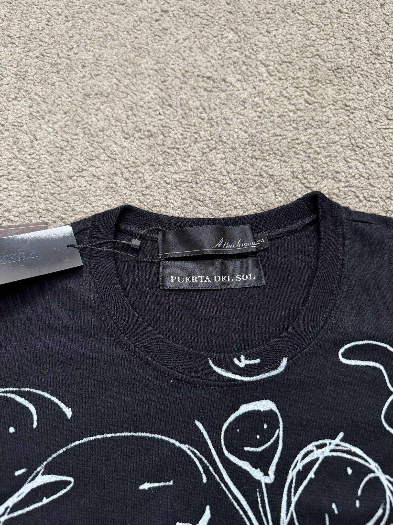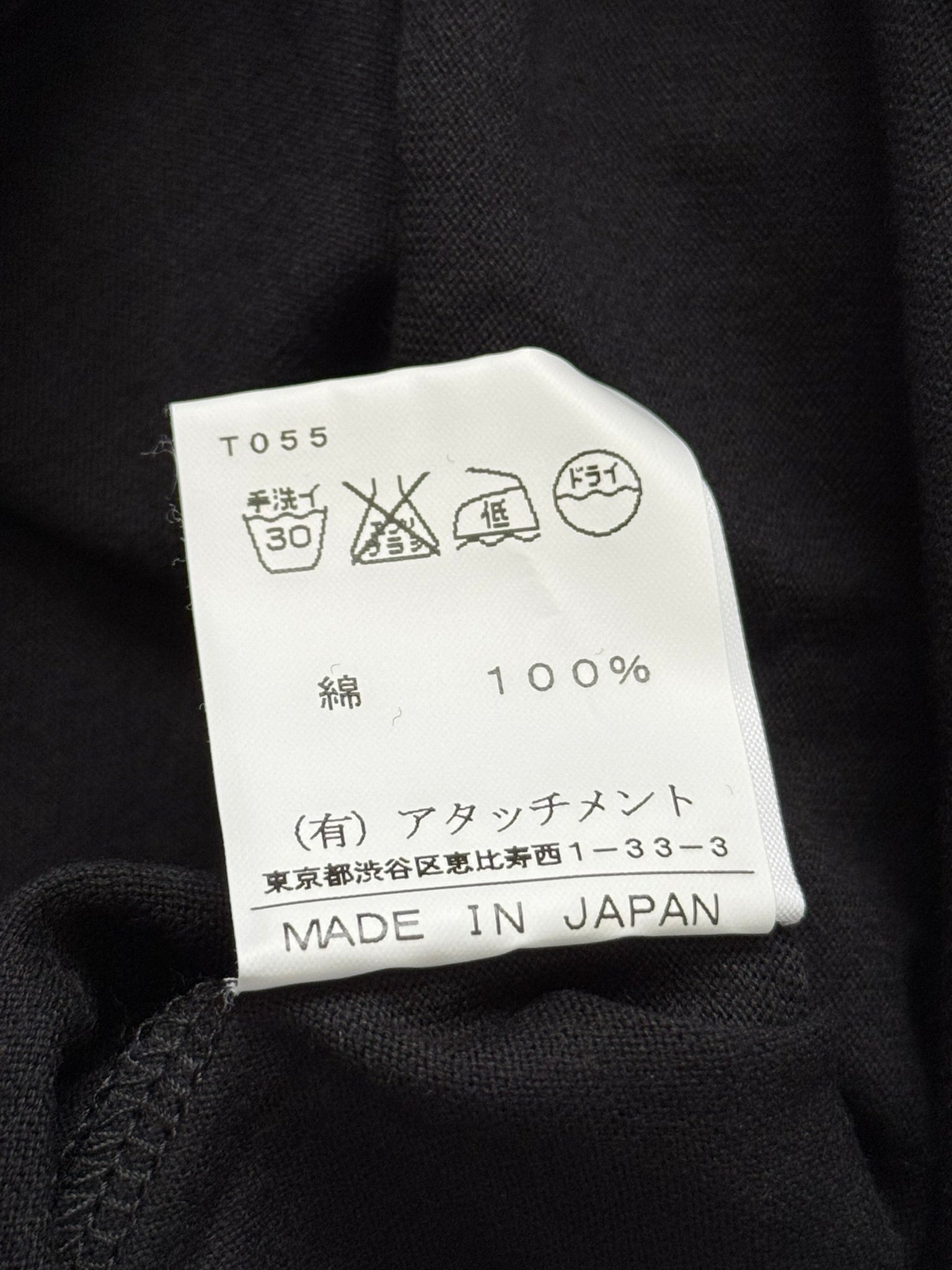 From the Japanese label Attachment made by Kazuyuki Kumagai in collaboration with another Japanese brand Puerta Del Sol. This black tee features abstract stick figure like faces on the front with a heart + cross graphic on the back with text logos. Brand new with tags, never worn. Made in Japan. Tagged a size JP 2.