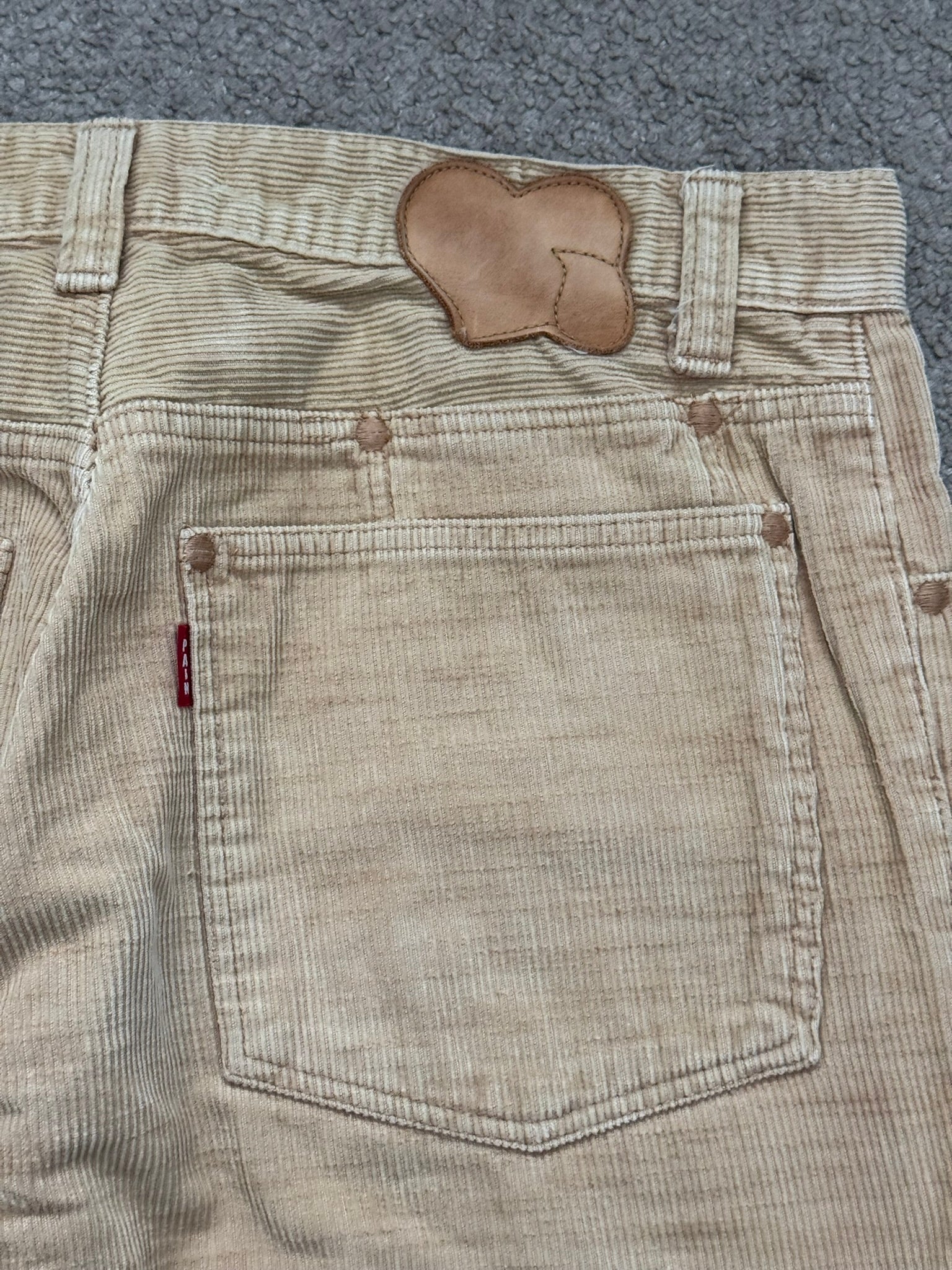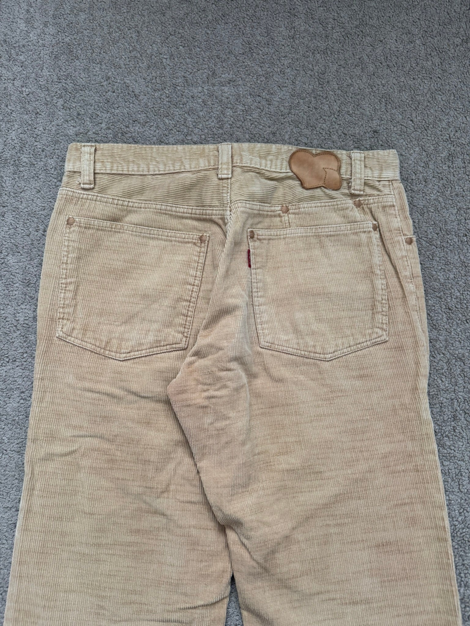 From Takahiro Miyashita's Number (N)ine and their SS03/AW03 collection titled "Touch Me I'm Sick." These pair of beige/tan corduroys feature braided cable knit details on the thigh areas, the iconic PAIN text tab, the crying heart leather patch, and detailed button + RiRi zipper closure. In great condition, no real flaws. Made in Japan. Tagged size JP 2.