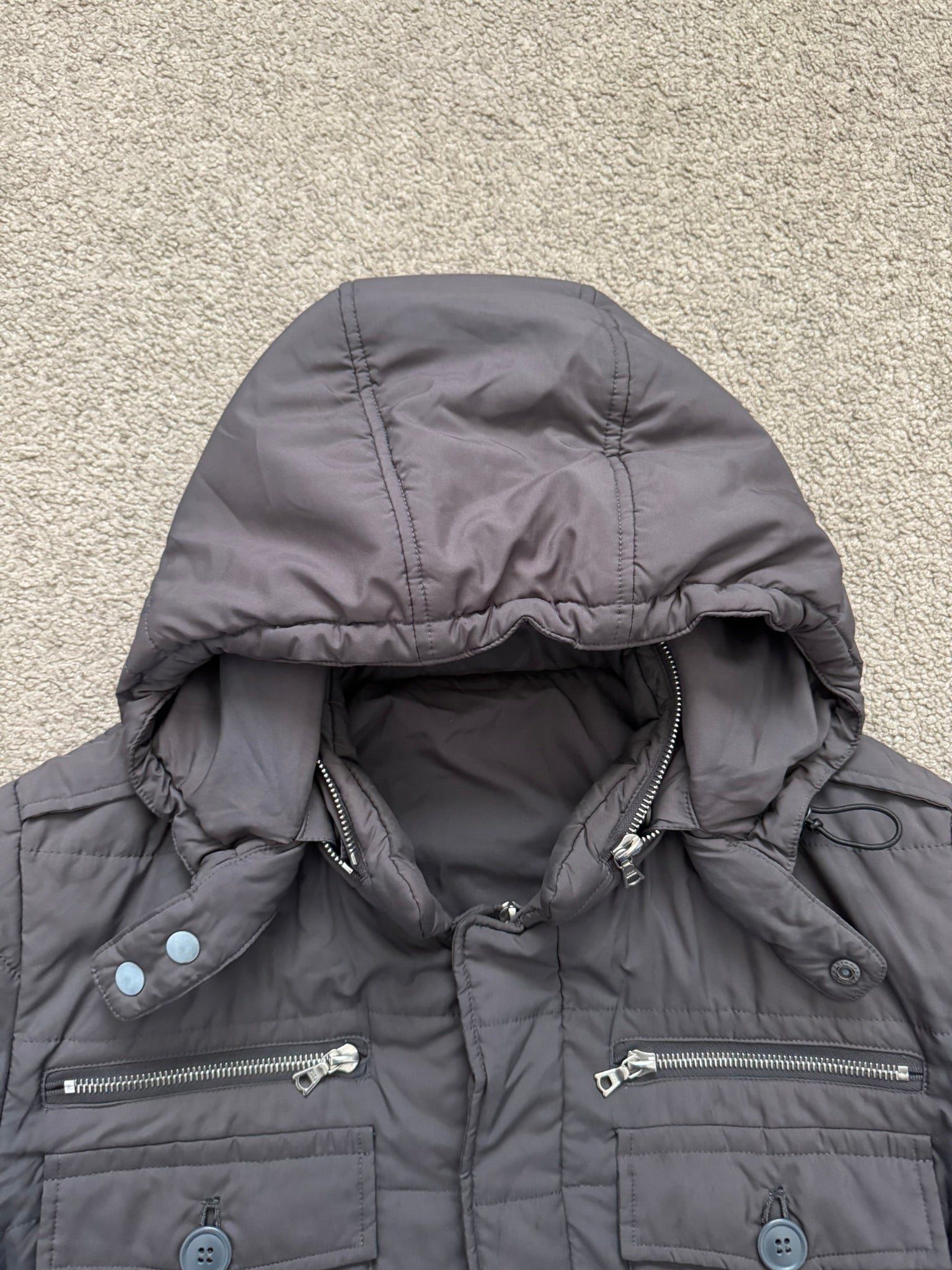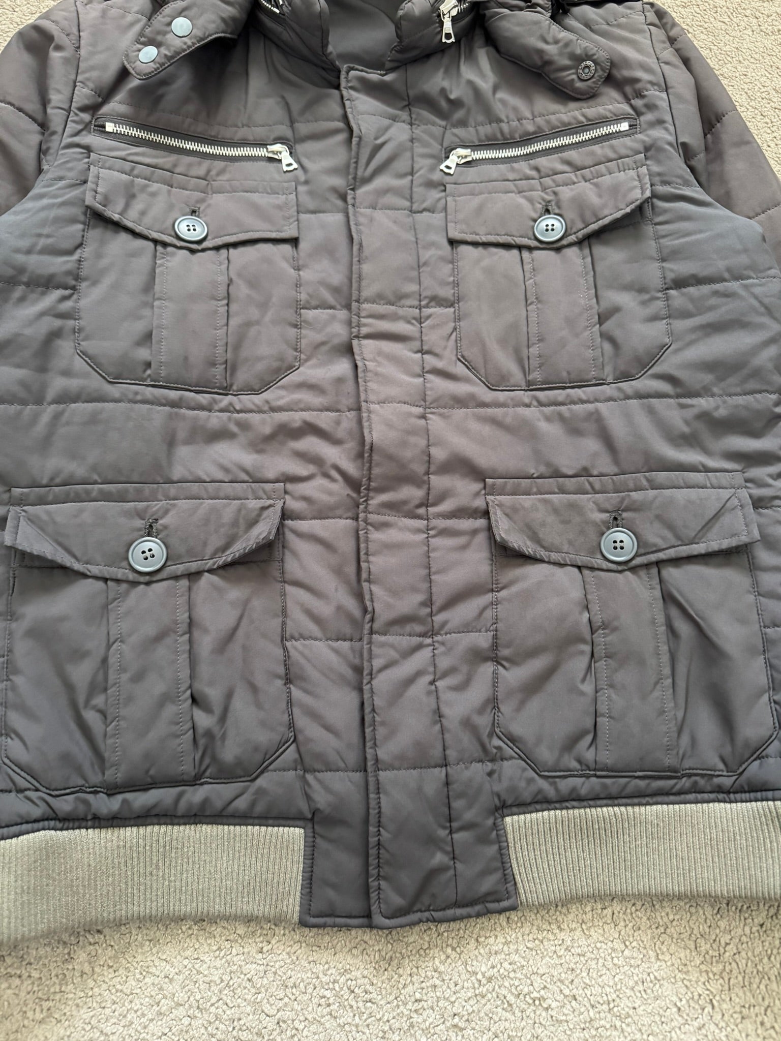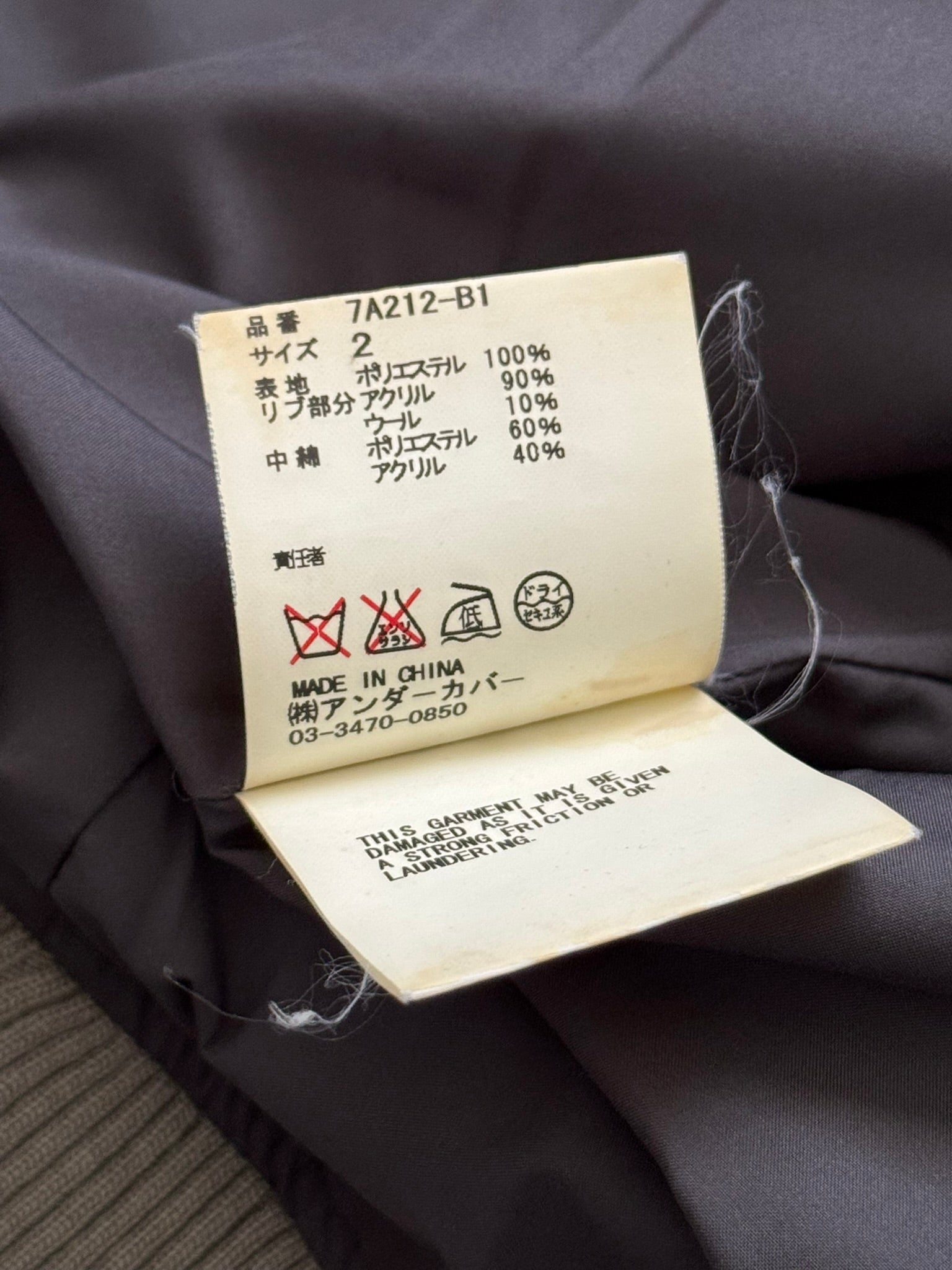 From Jun Takahashi's Undercover and their AW07 collection titled "Knit." This beautiful plum puffer jacket with grey ribbing features button epaulets on the shoulders, two zipper pockets at the top front, four cargo flap pockets, a zipper closure, two inner pockets, and a detachable zipper hood with button fasteners + adjuster at back. All zipper hardware is RiRi. In great condition, minor fading/discoloration throughout that is apart of the coloring process; no real flaws. Everything as pictured. Tagged a size JP 2.
