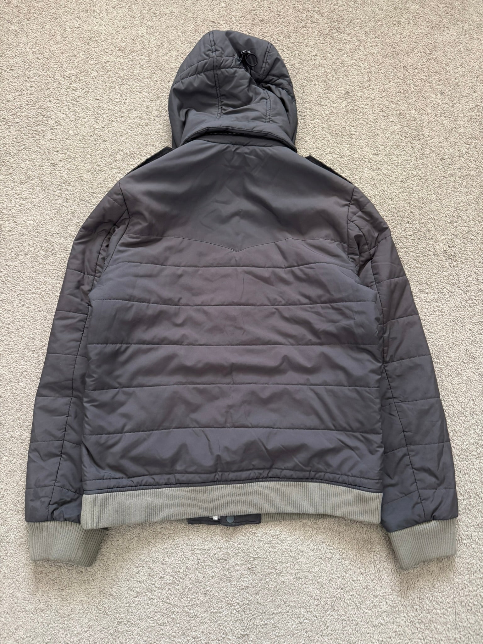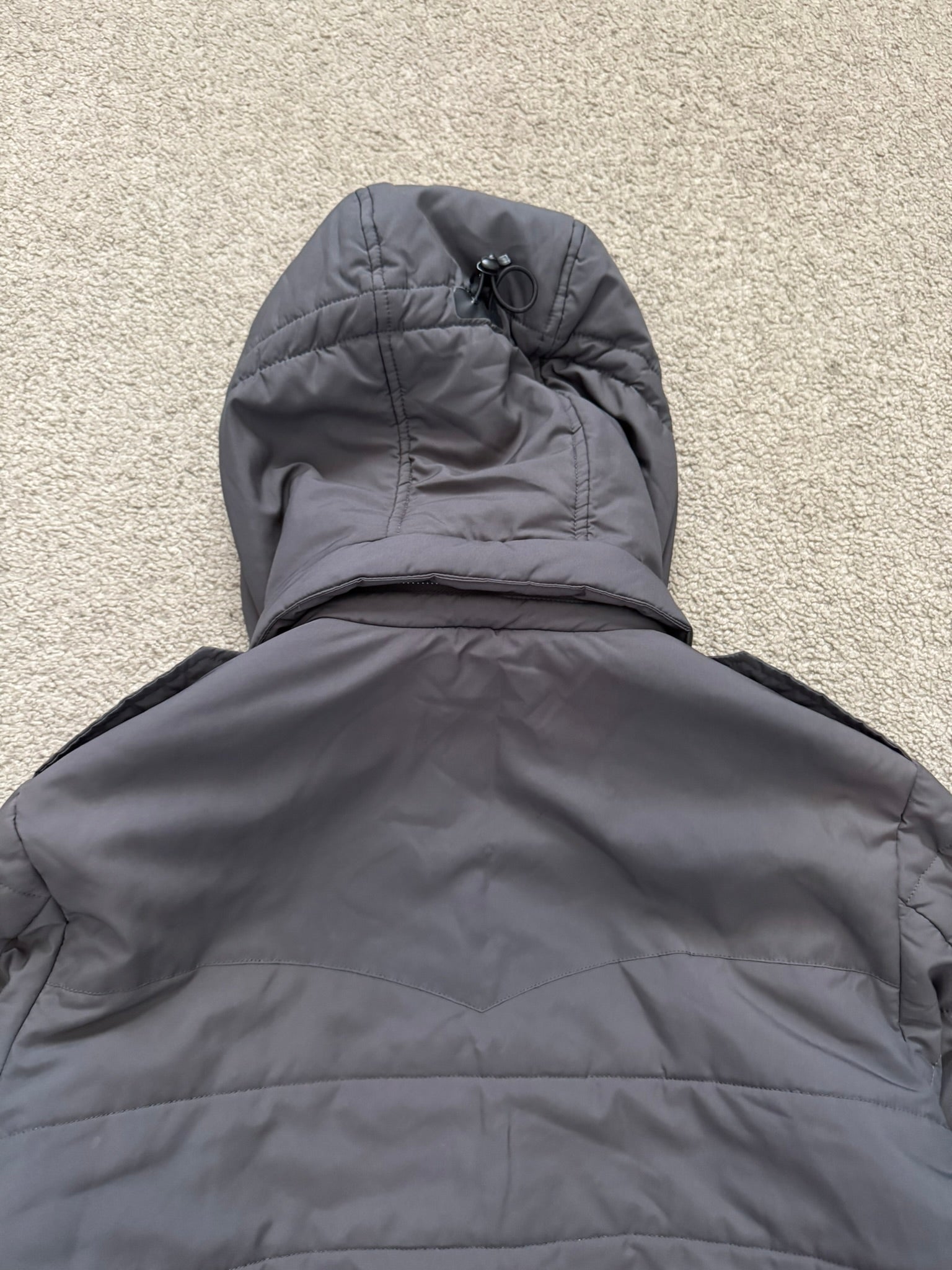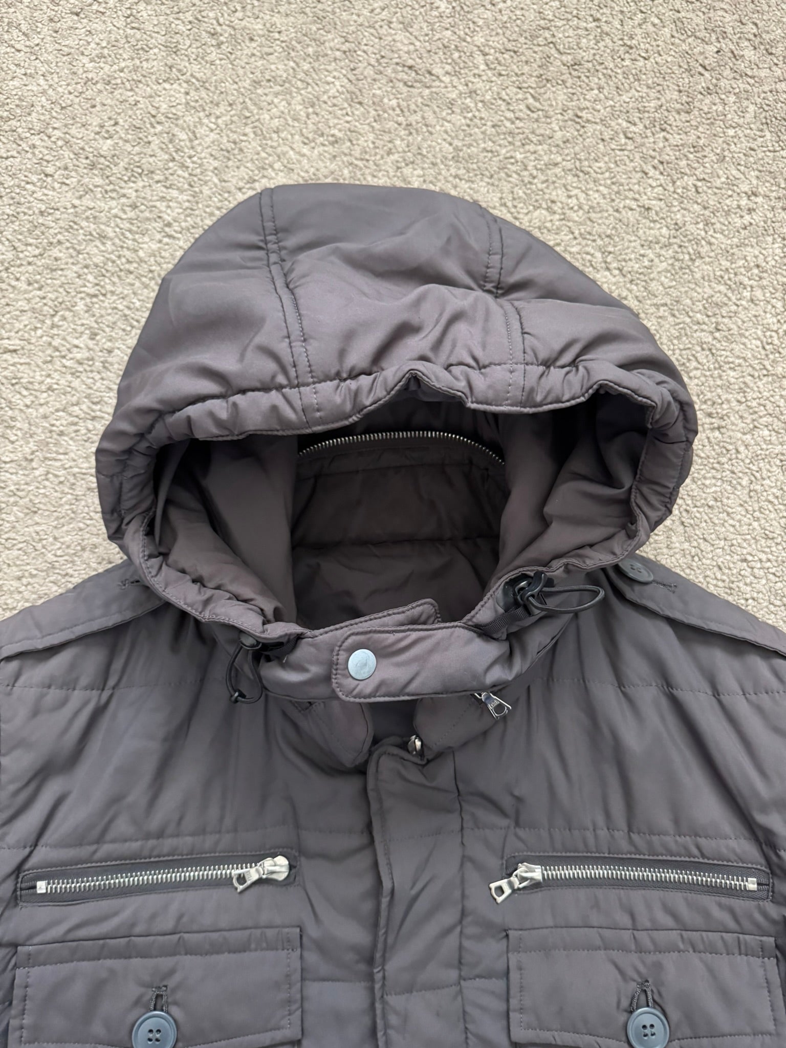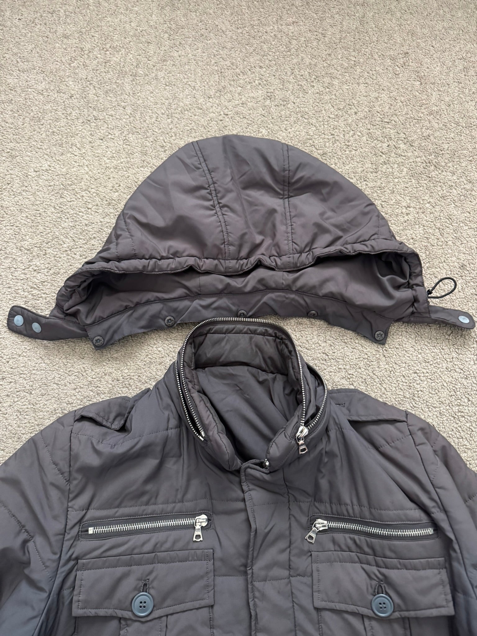 From Jun Takahashi's Undercover and their AW07 collection titled "Knit." This beautiful plum puffer jacket with grey ribbing features button epaulets on the shoulders, two zipper pockets at the top front, four cargo flap pockets, a zipper closure, two inner pockets, and a detachable zipper hood with button fasteners + adjuster at back. All zipper hardware is RiRi. In great condition, minor fading/discoloration throughout that is apart of the coloring process; no real flaws. Everything as pictured. Tagged a size JP 2.