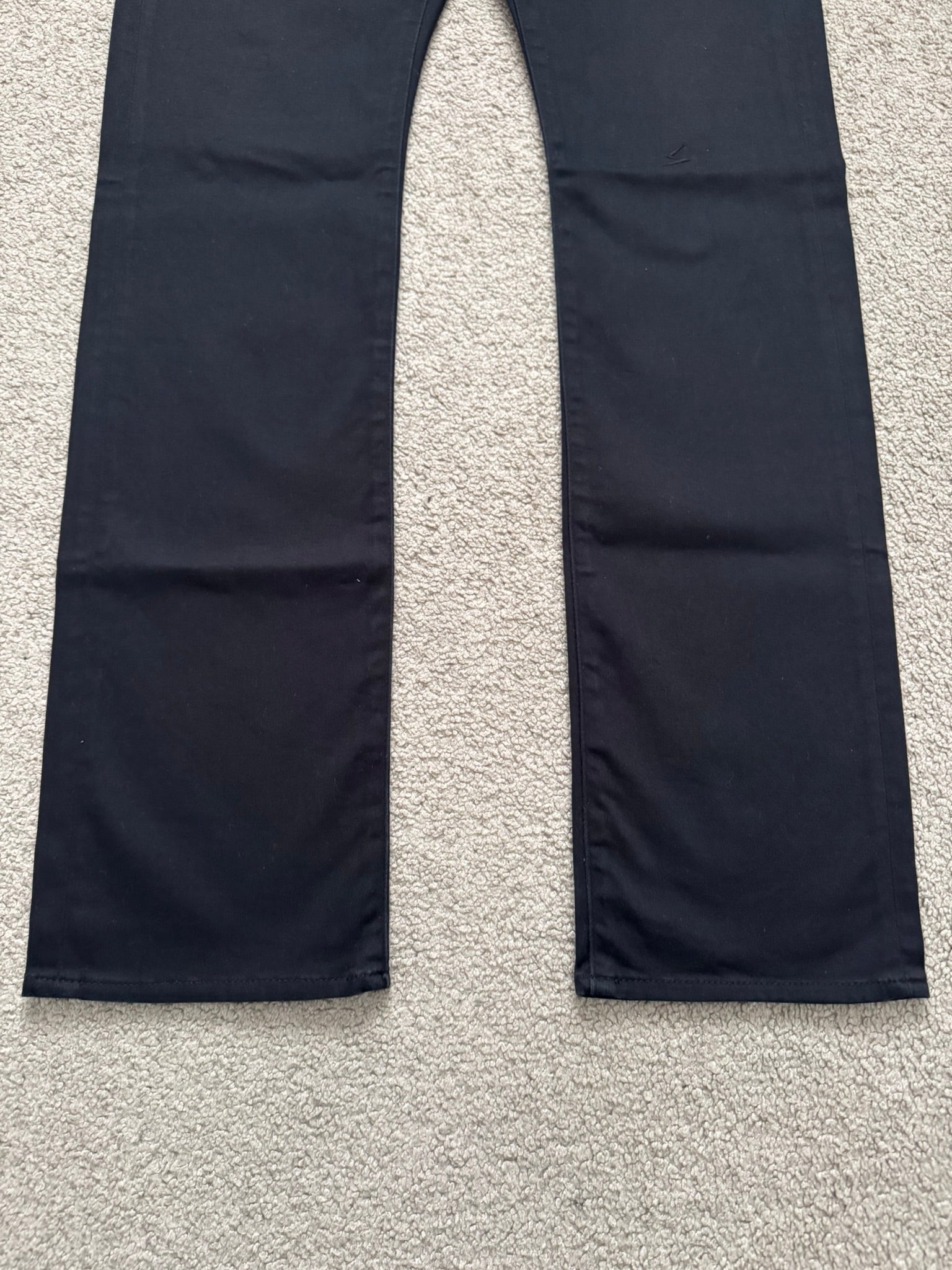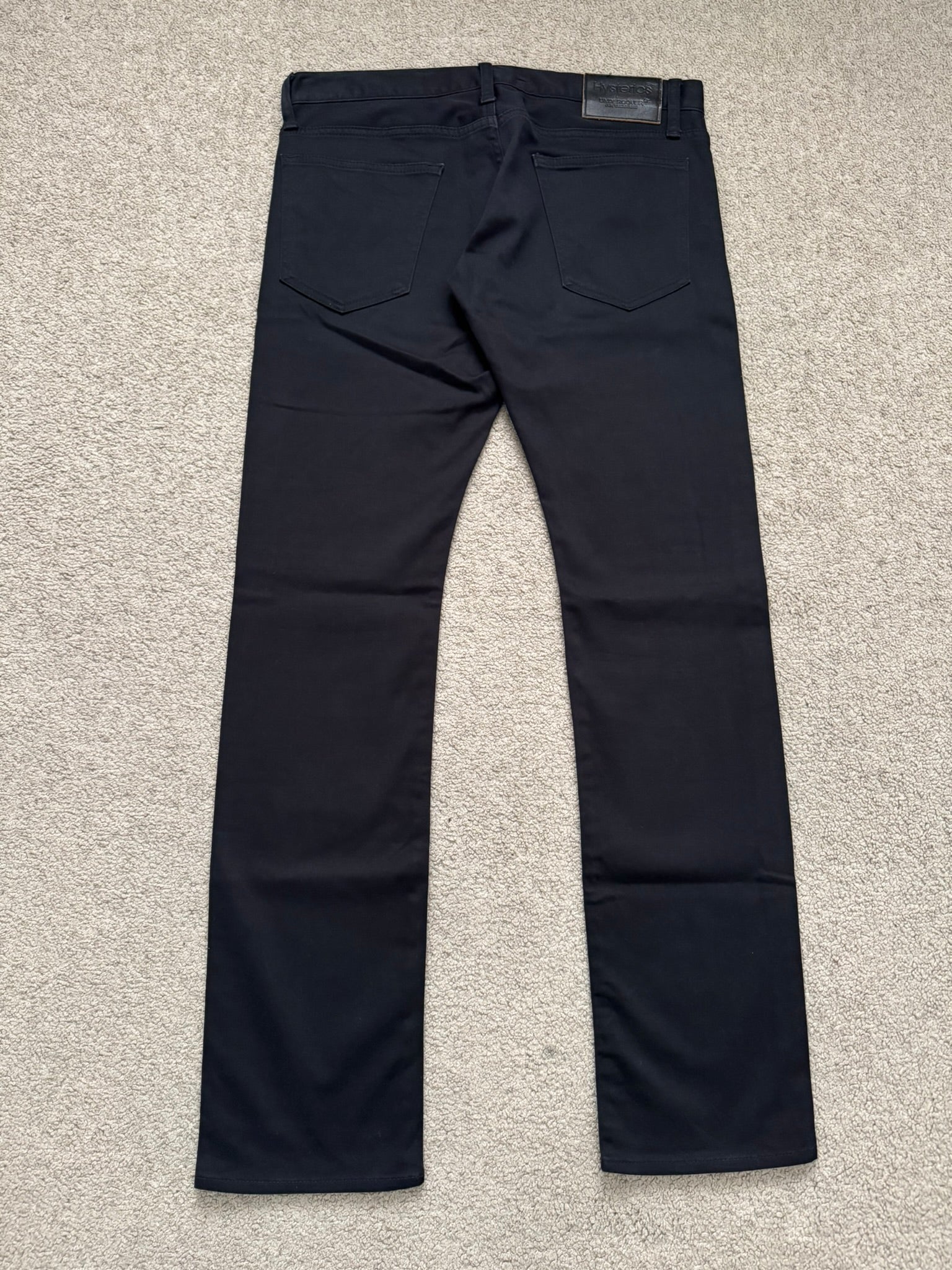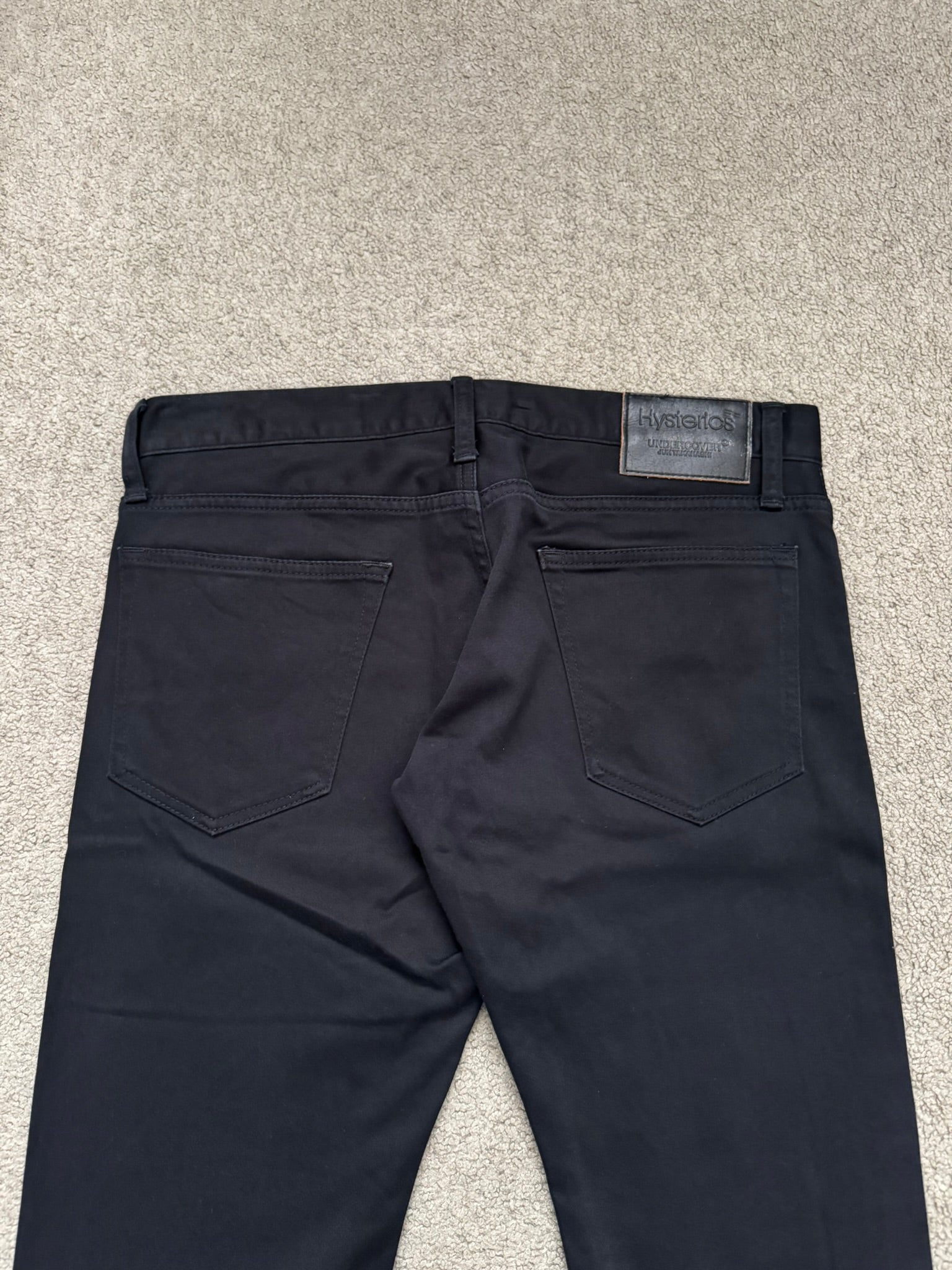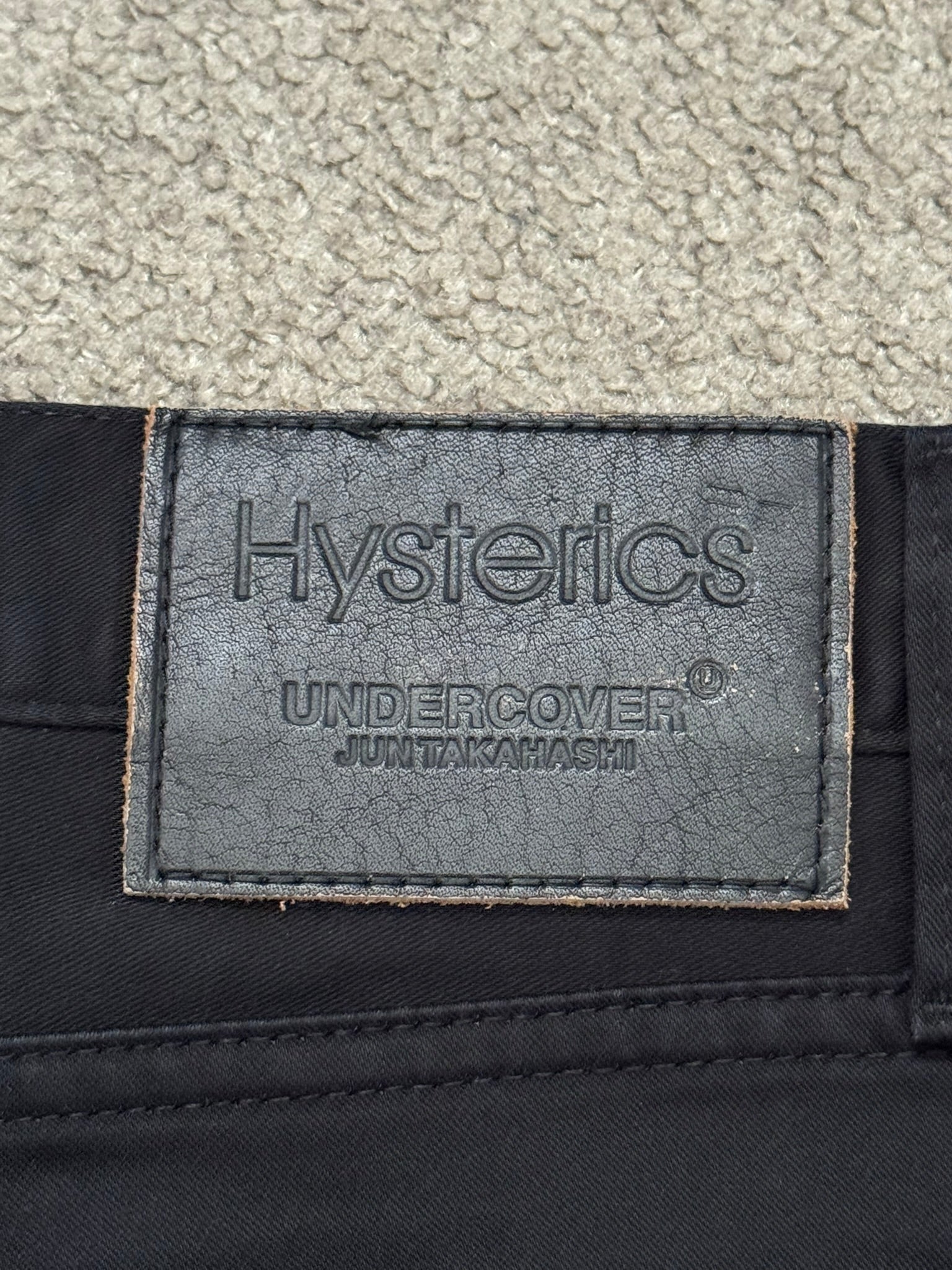 From Jun Takahashi’s Undercover and their FW08 collection titled “Unrealrealclothes” in collaboration with Nobuhiko Kitamura's Hysteric Glamour. These black stretch denim jeans feature the iconic Patti Smith lightning bolt on the knee, a five pocket layout, black leather patch with debossed logos of both brands, and a button fly. In good condition, no real flaws. Made in Japan. Tagged a size 32.