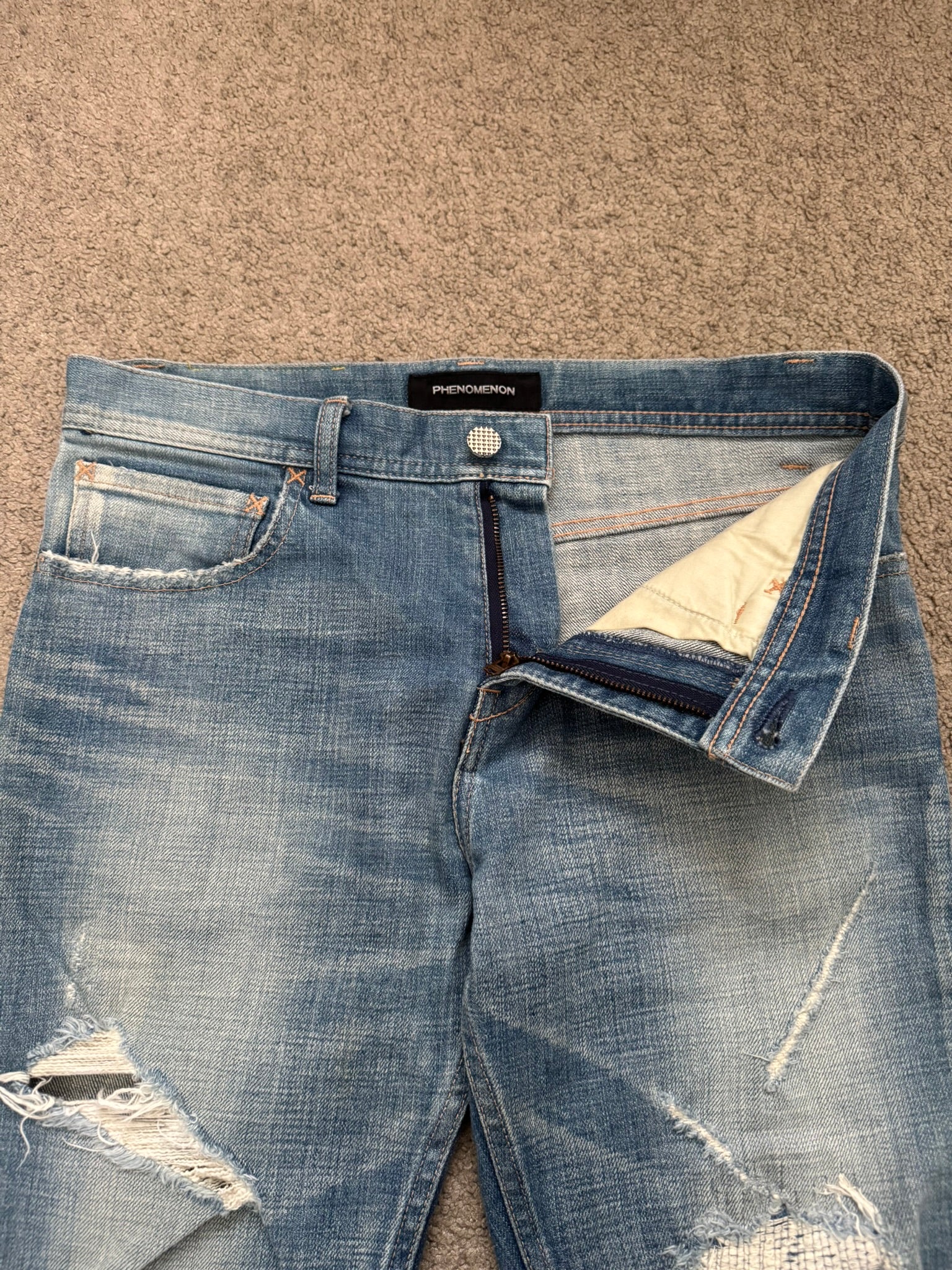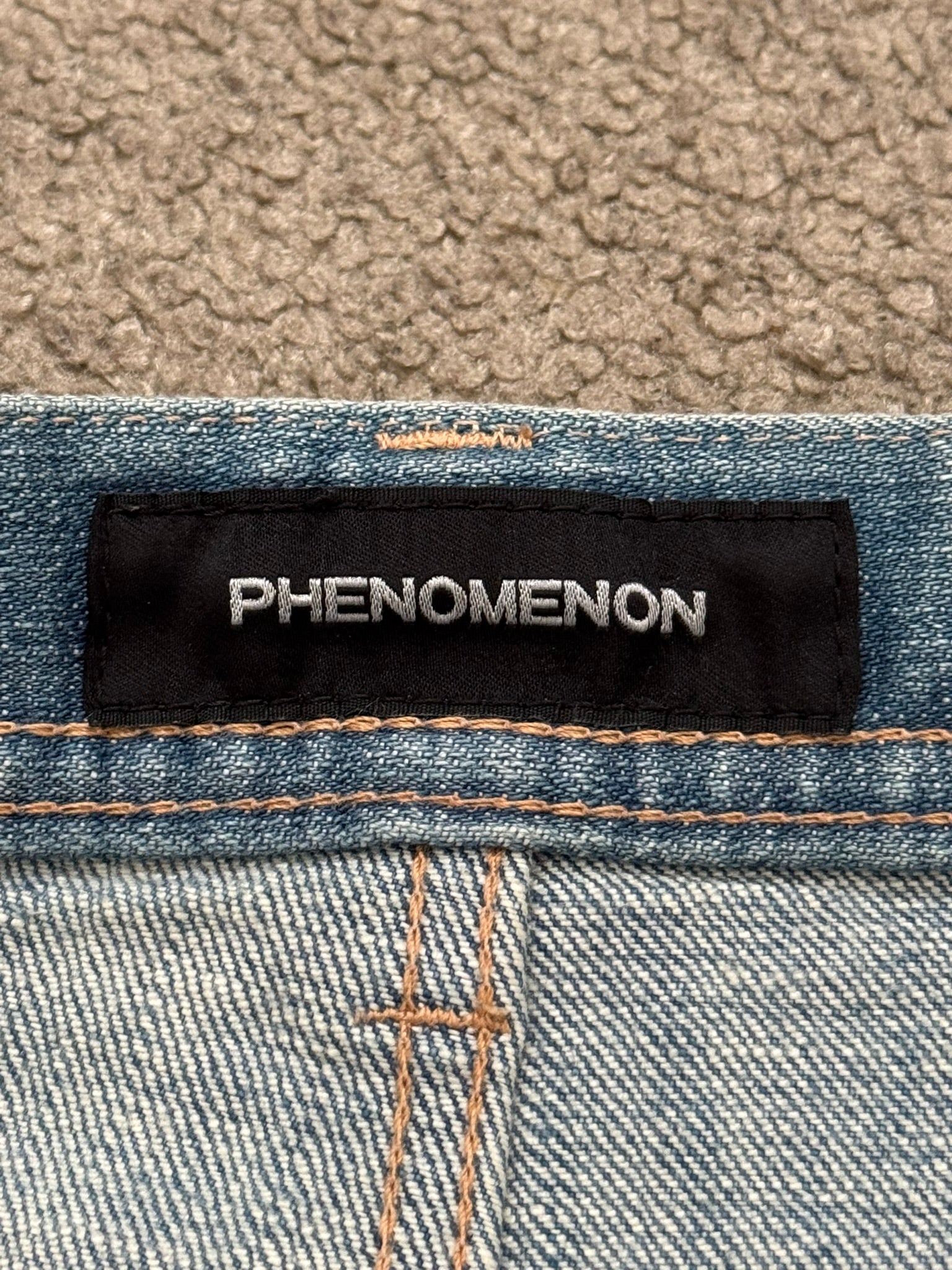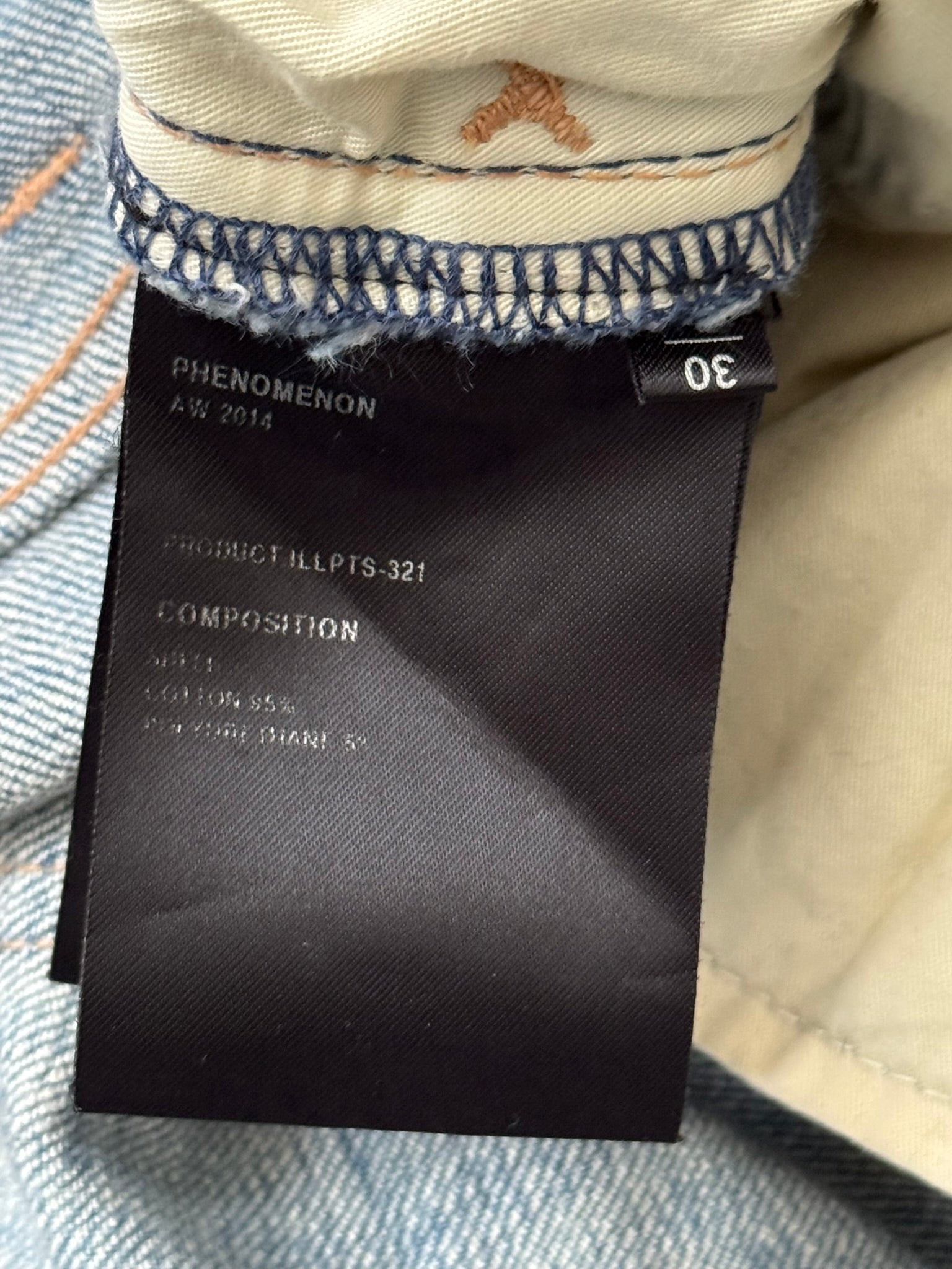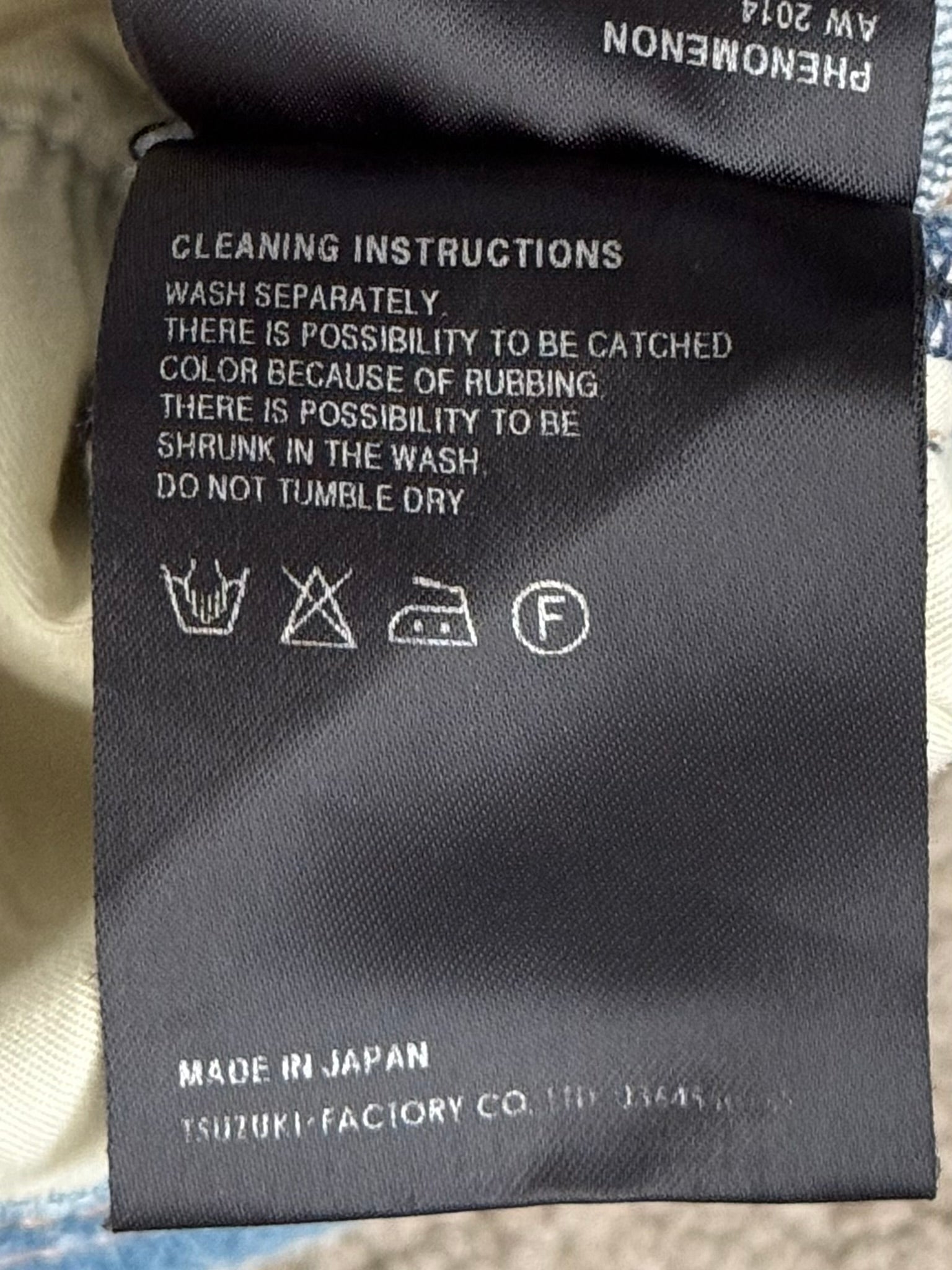 From Takeshi “Big O” Osumi's Japanese fashion label Phenomenon and their AW14 collection. These faded and washed light colored denims feature crash style distressing with holes and repairs done on the front and a yellow leather tab on the back. In great condition, no real flaws as all wear, fading, and rips are intentional. Made in Japan. Tagged a size 30.