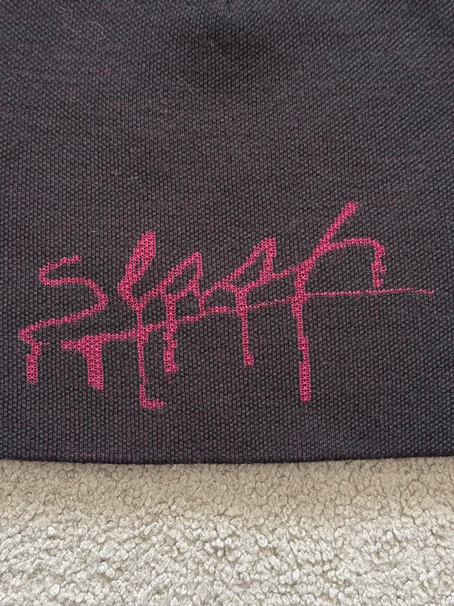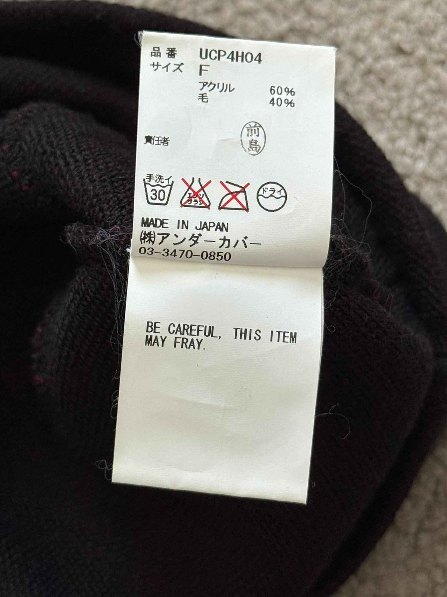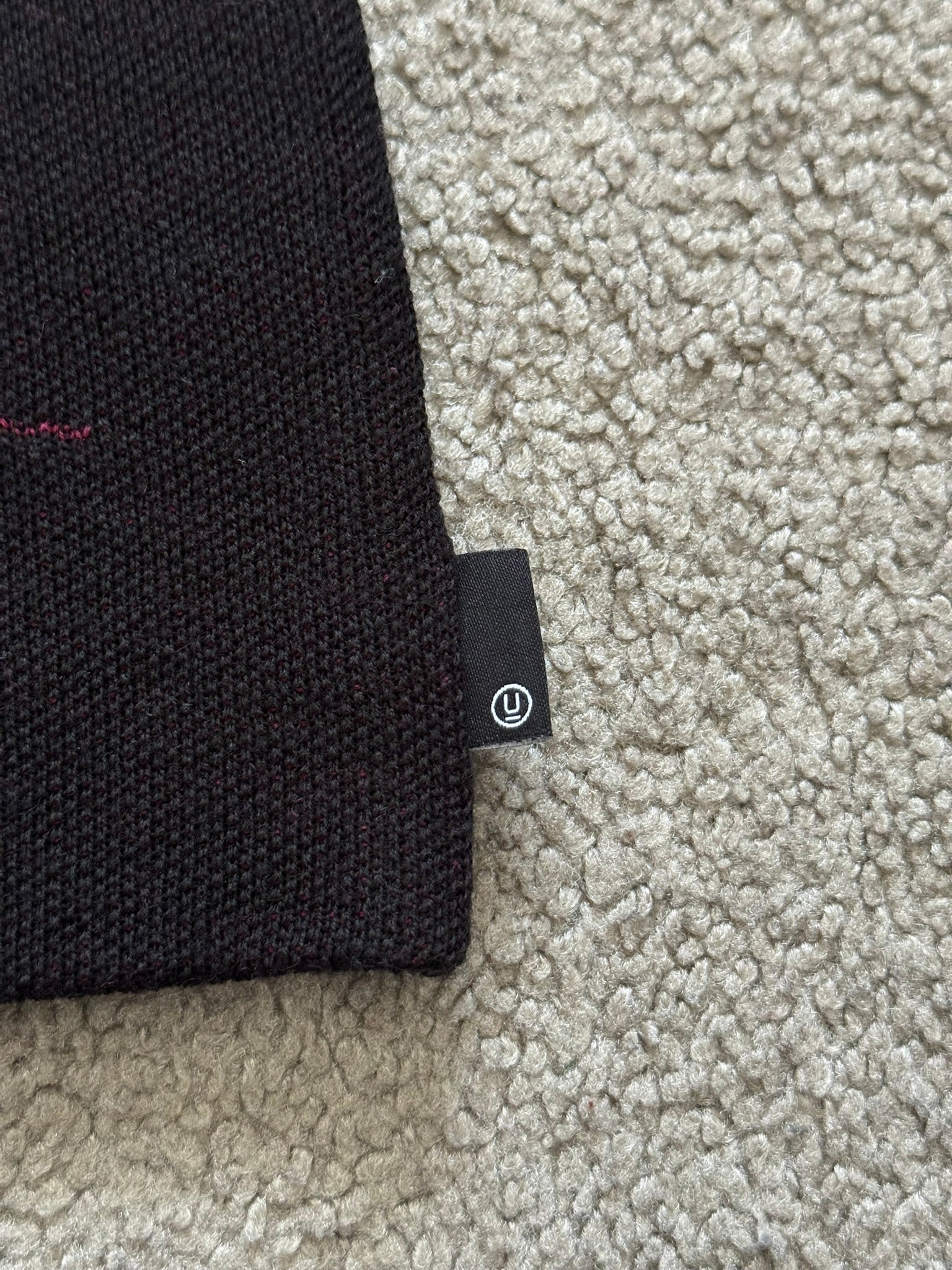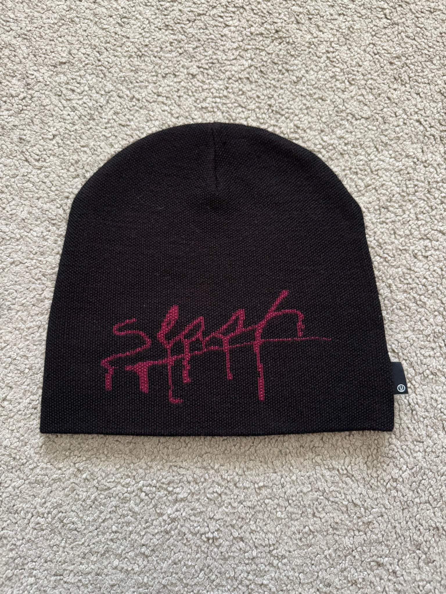 From Jun Takahashi's Undercover and his AW15 collection titled "No (B)orders." This black wool knit beanie features the logo of legendary punk rock magazine "Slash" on the front (which served as inspiration for Playboi Carti's Whole Lotta Red album cover) and a little Undercover "U" logo tab on the side. In great condition, no real flaws. Made in Japan. Measures to around 8.5 inches in length and 9 inches in width.