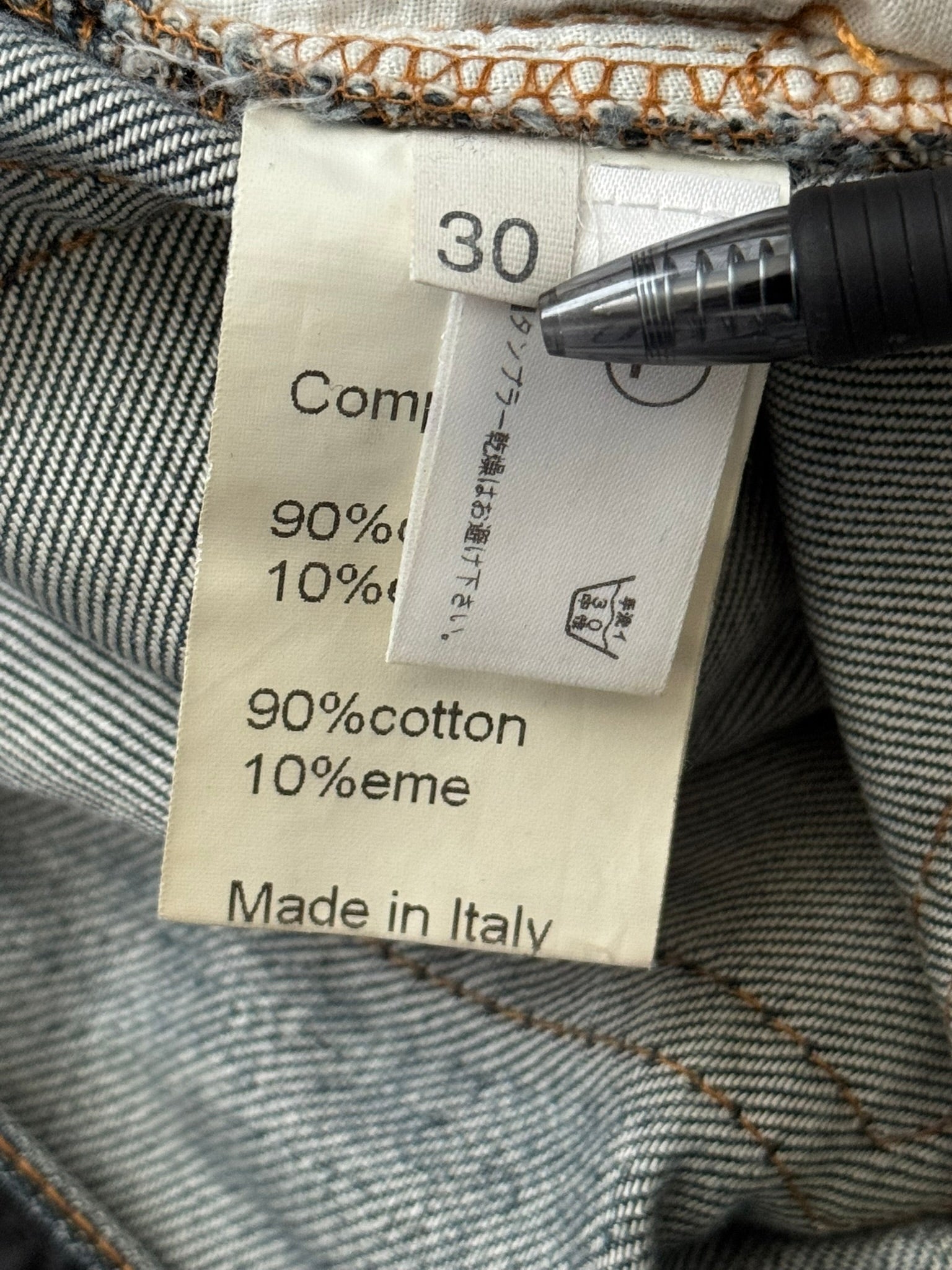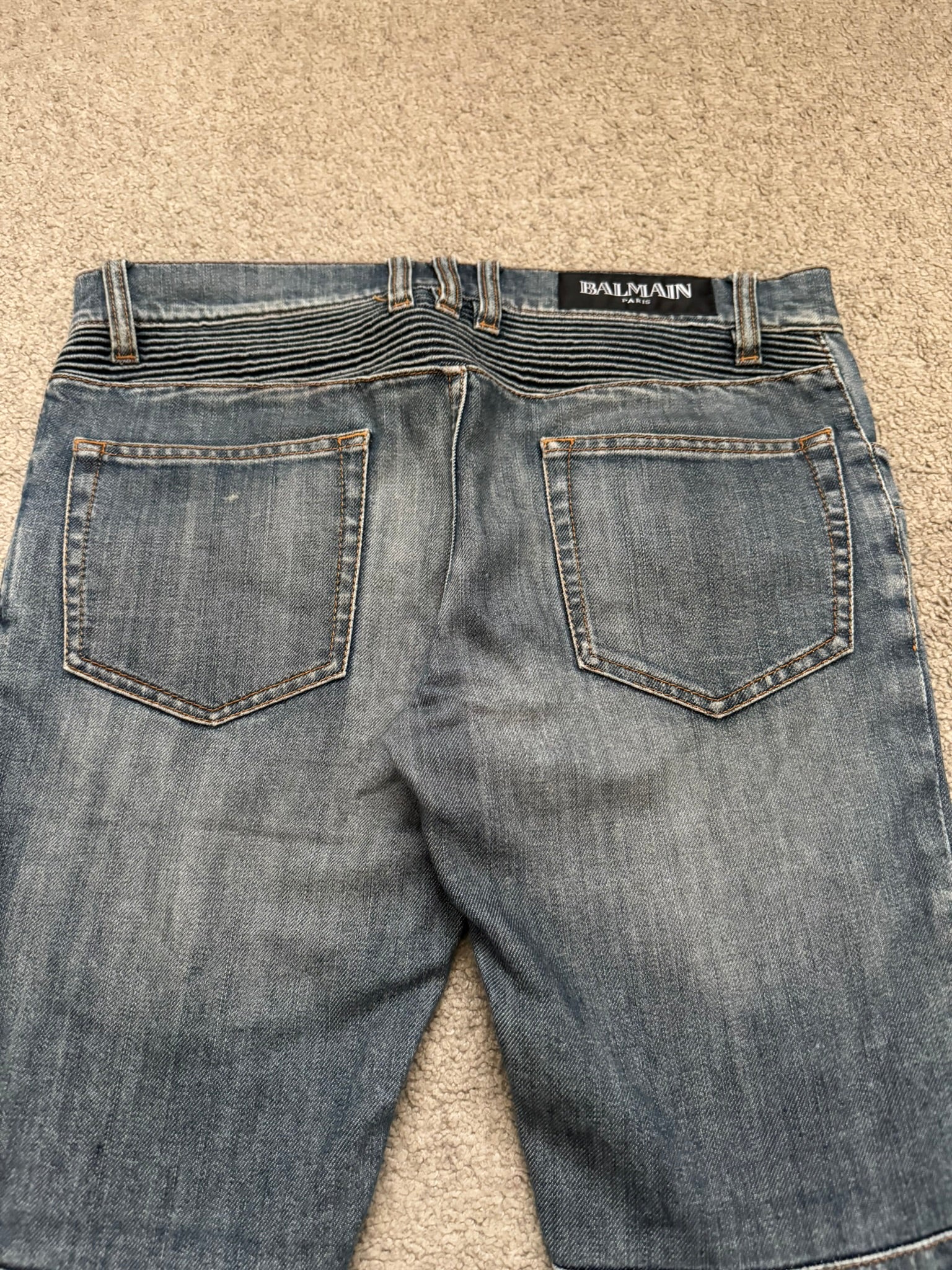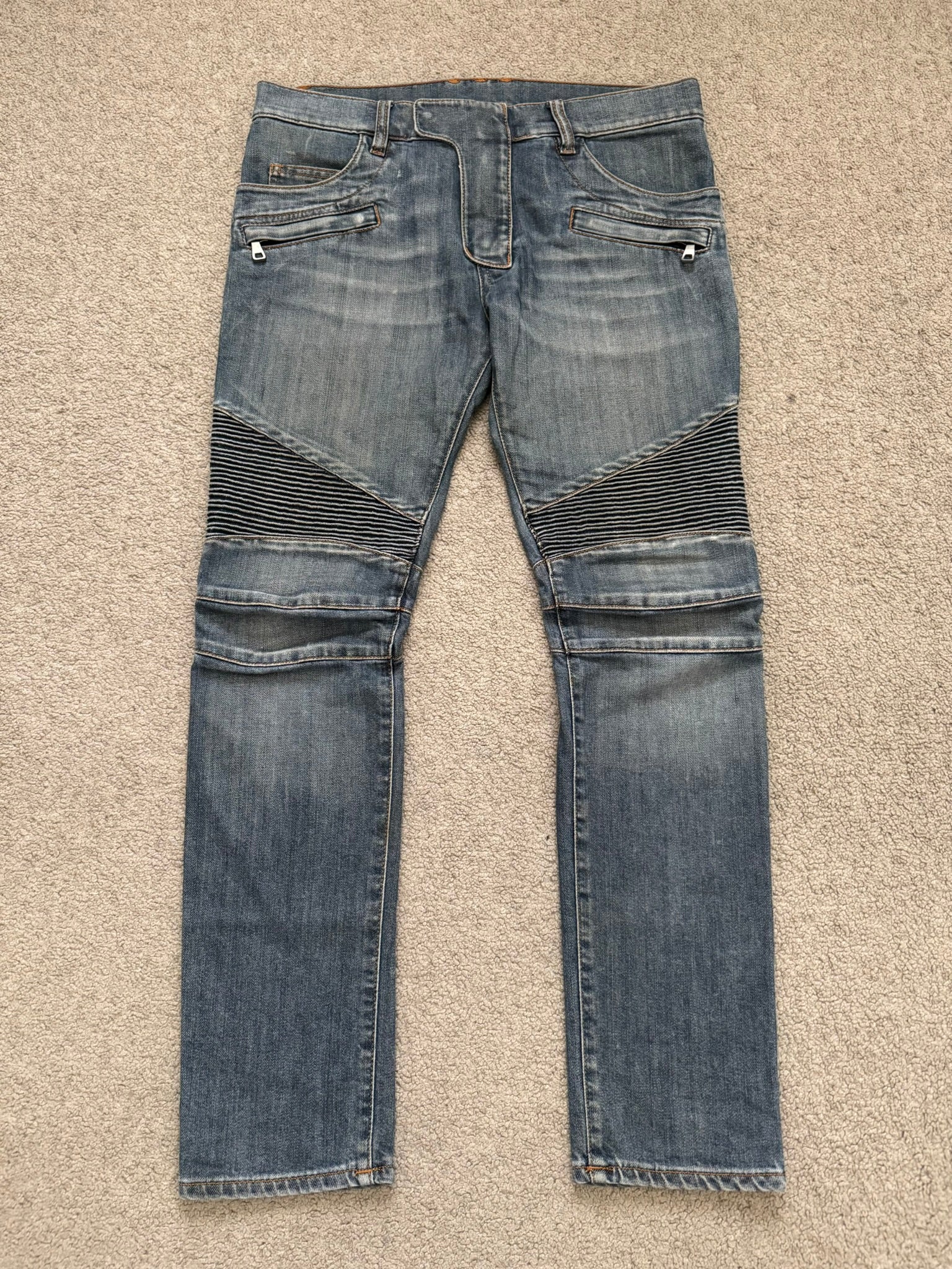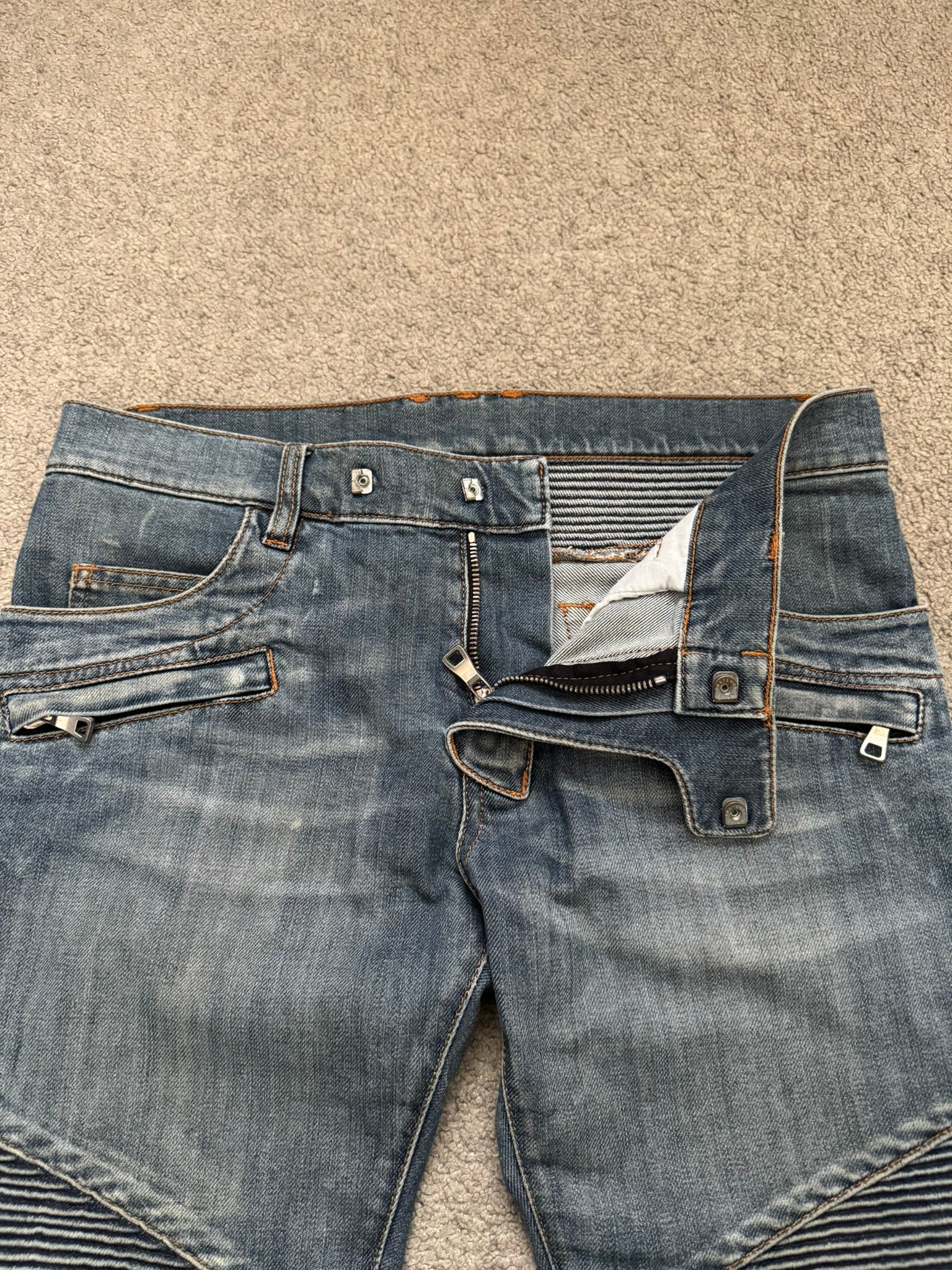 From Christophe Decarnin's tenure at luxury French fashion house Balmain. These classic biker style denim jeans in a faded light washed blue color features two front zipper pockets with two more at the back, back text logo patch, ribbing at the knee areas, and a zipper fly + double clasp closure. All zippers are quality silver Lampo zips. In great condition, all fading and wear is intentional; no real flaws. Everything as pictured. Made in Italy. Tagged a size 30.
