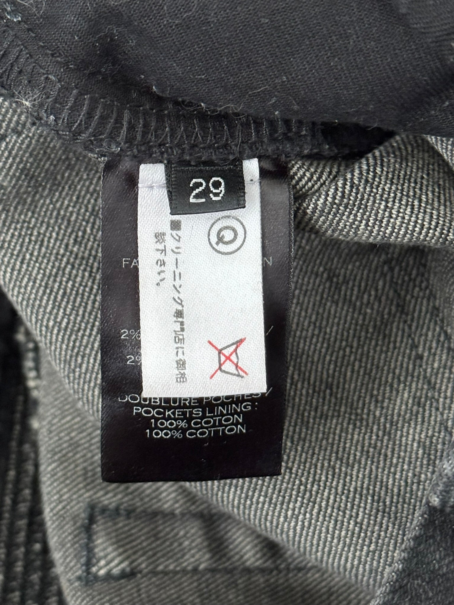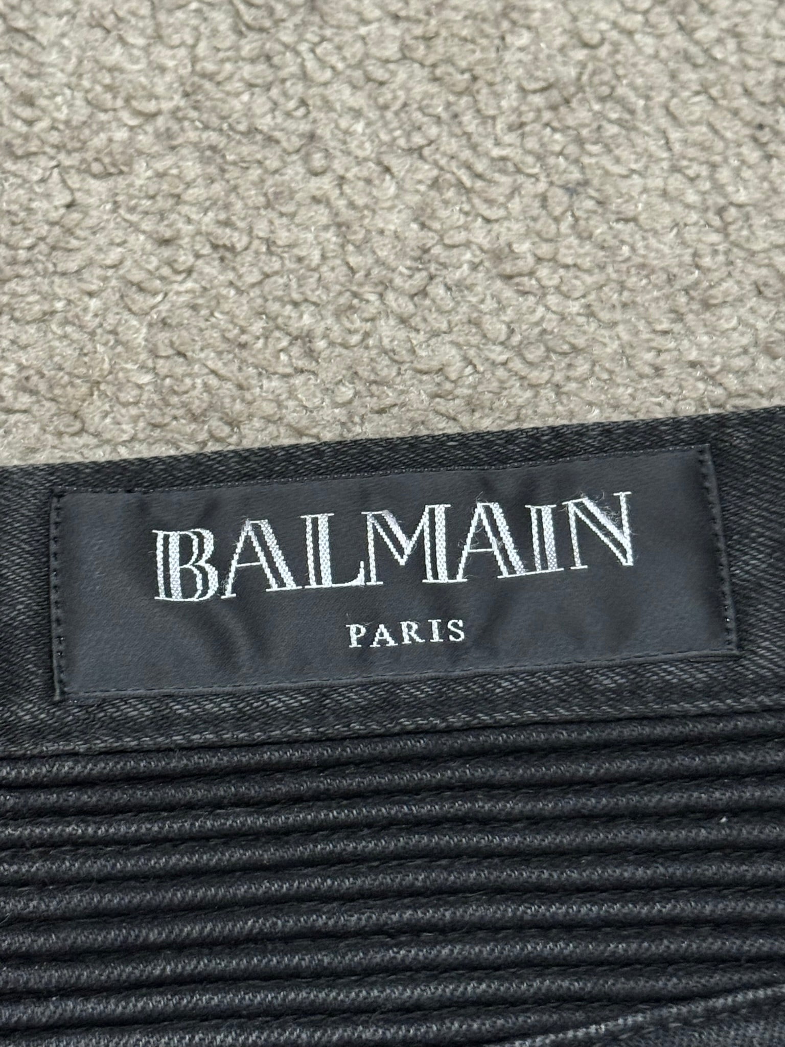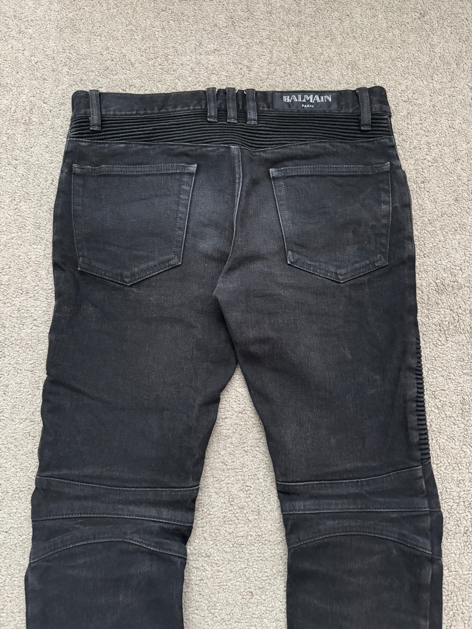 From Olivier Rousteing's tenure at luxury French fashion house Balmain and one of his early collections. These classic biker style denim jeans, popularized by Christophe Decarnin, in a washed black color features a light wax coating throughout, fading & minor distressing, two front zipper pockets, back text logo patch, ribbing at the knee areas, and a zipper fly + double clasp closure. In great condition, all fading and wear is intentional; no real flaws. Everything as pictured. Made in Japan. Tagged a size 29.