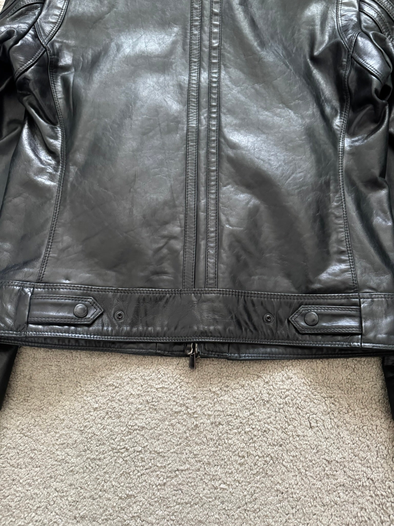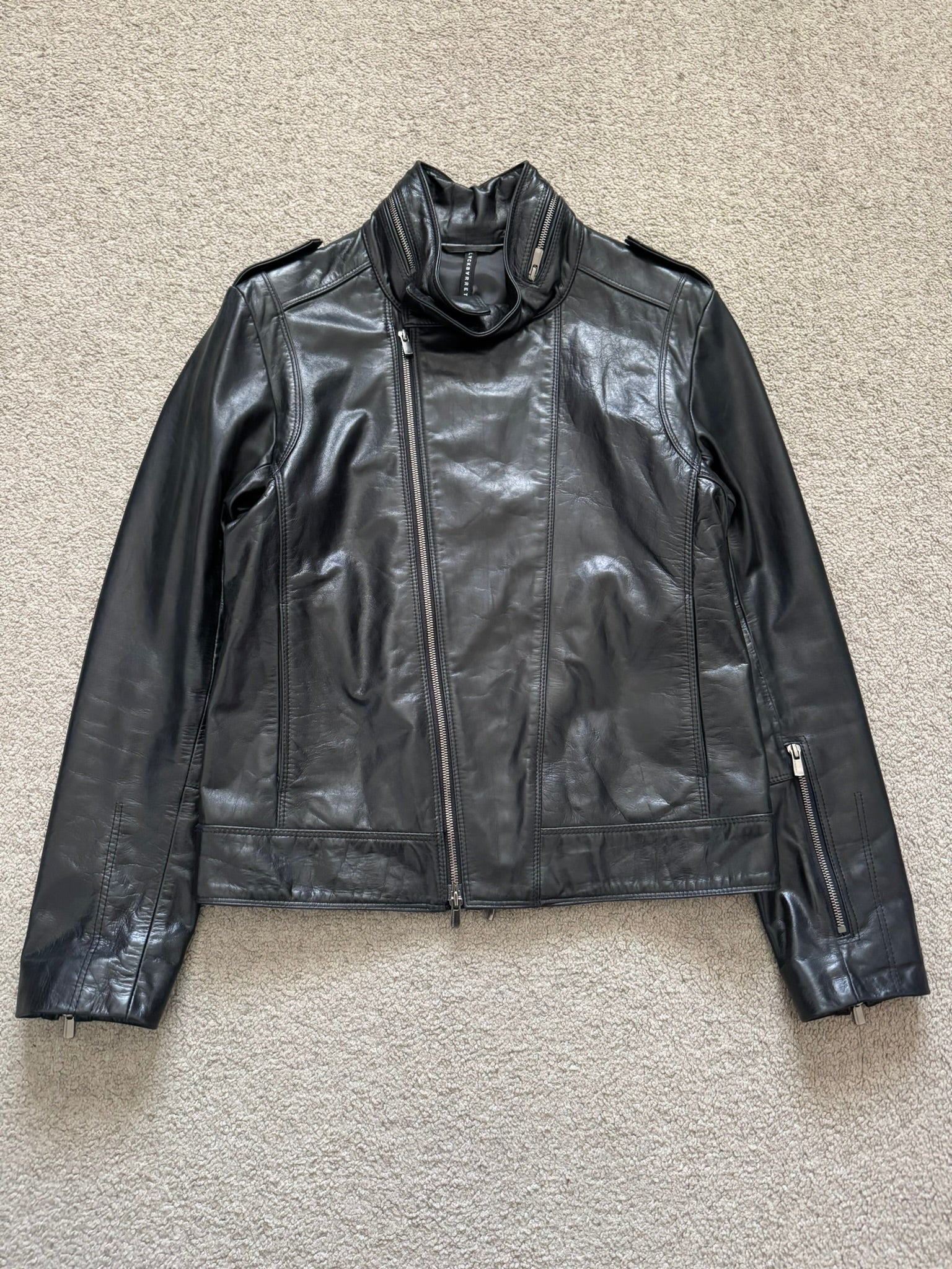 From the Japanese exclusive label BLACKBARRETT by Neil Barrett. This robust black cowhide leather jacket features an asymmetrical front two-way zipper with another zipper that can be worn two ways, zipper adjusters at the cuffs, a zipper sleeve pocket, two front pockets, two inside pockets, zipper detail at the collar, button epaulets, and back hem adjusters. Will come in the original dust bag that also functions as a tote bag. In great condition, no real flaws. Tagged a size JP 3 but fits more like a U.S. small.