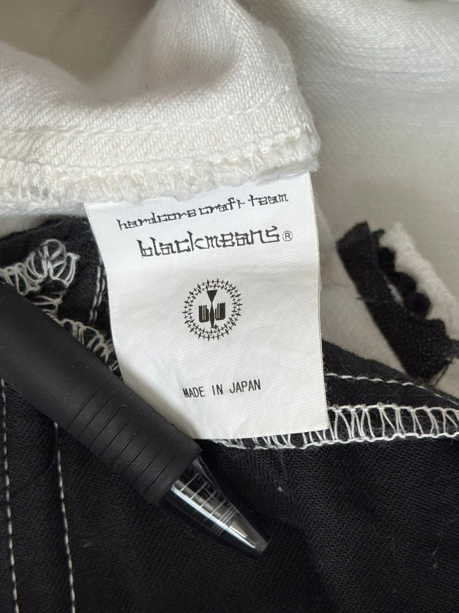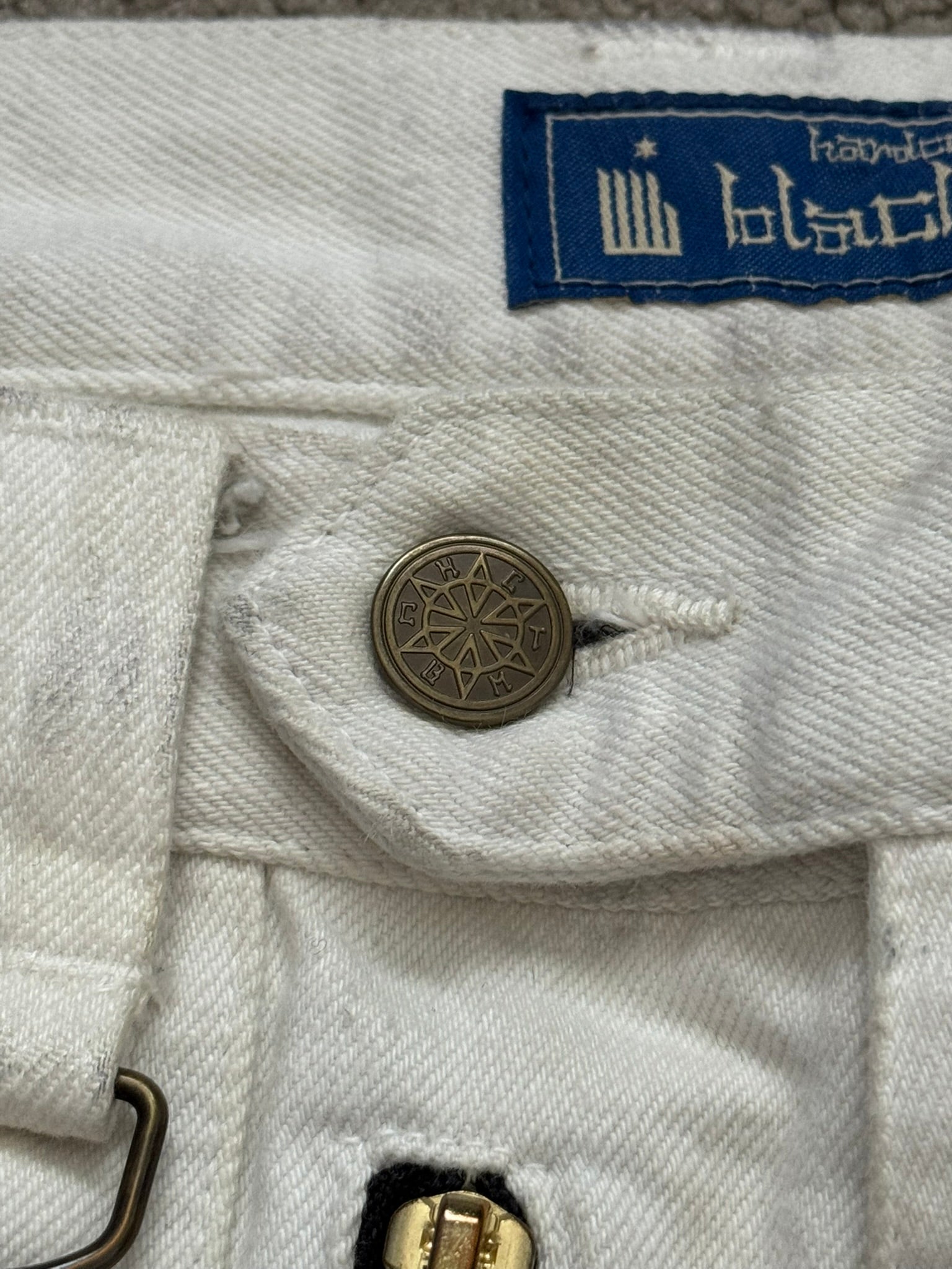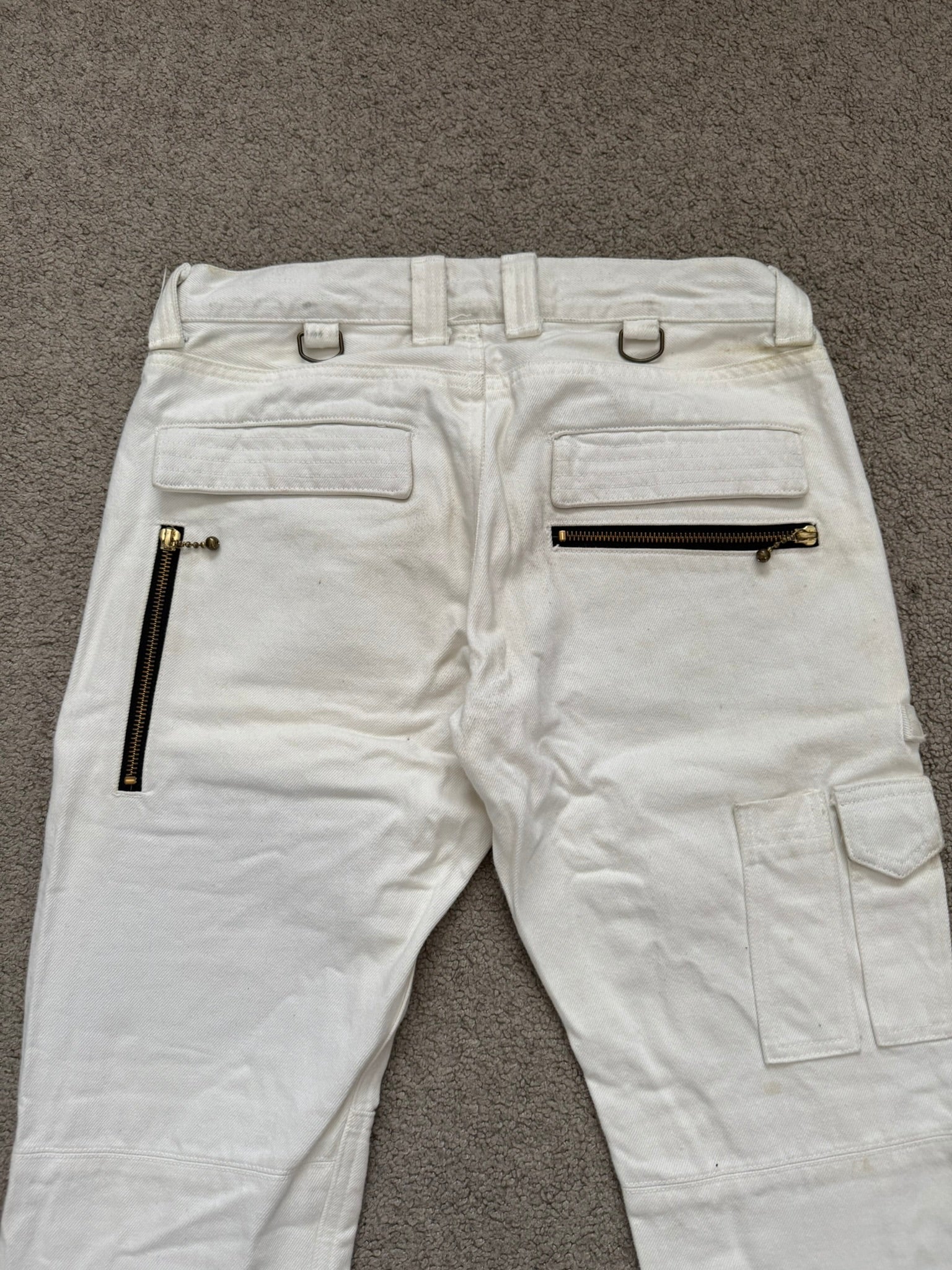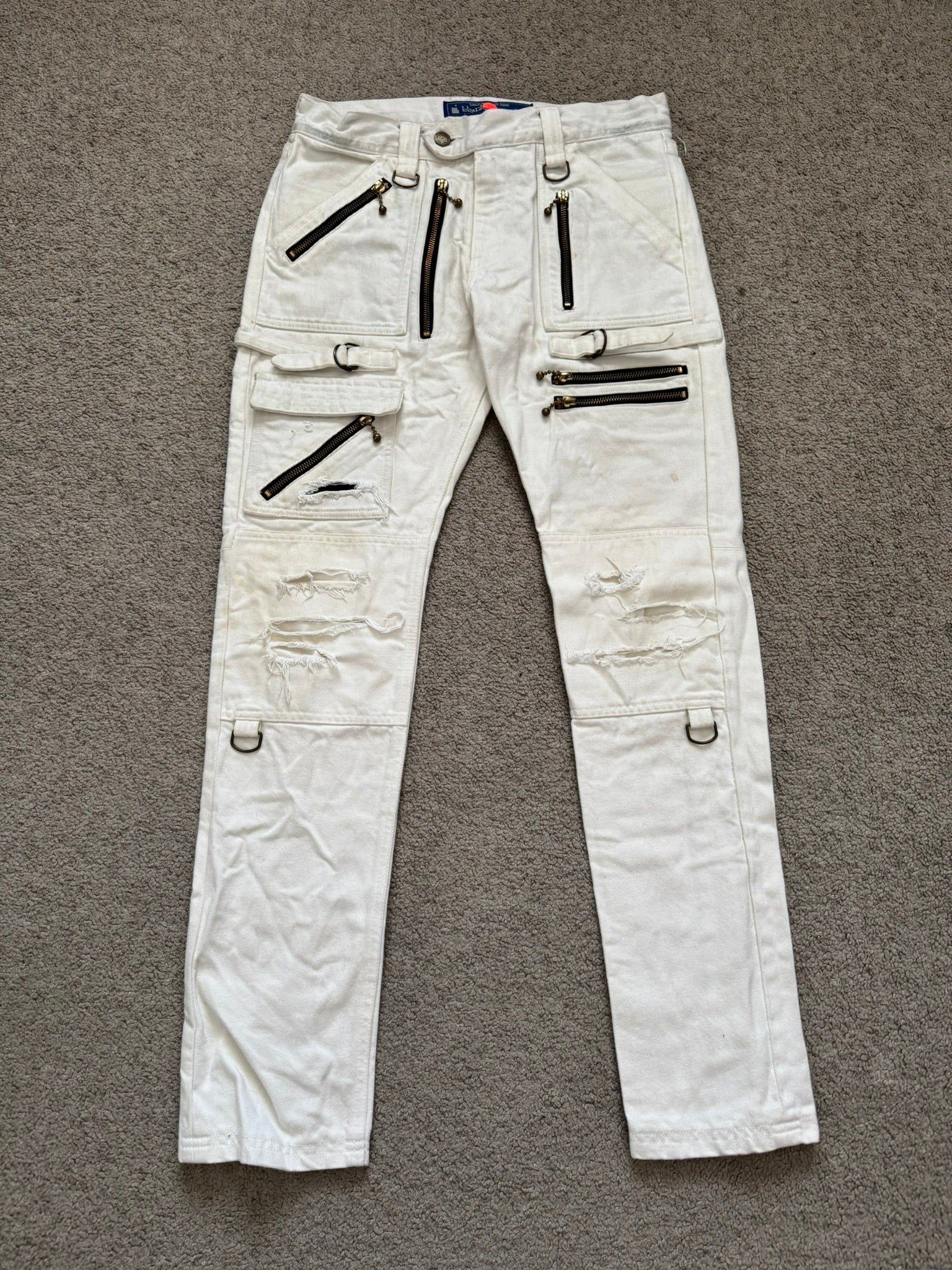 From Japanese fashion label Blackmeans created by Yujiro Komatsu and brothers Masatomo & Takatomo Ariga. These tasteful white/cream colored denim jeans feature tons of cargo flap & zipper pockets throughout, bondage strap details at the thighs, distressing details at the knees, d-rings at the front & back, and zippers at the back hems that allow for a little bit of flare. In good condition, minor fading and marks throughout; everything as pictured with no real flaws. Made in Japan. Tagged a size JP 2.