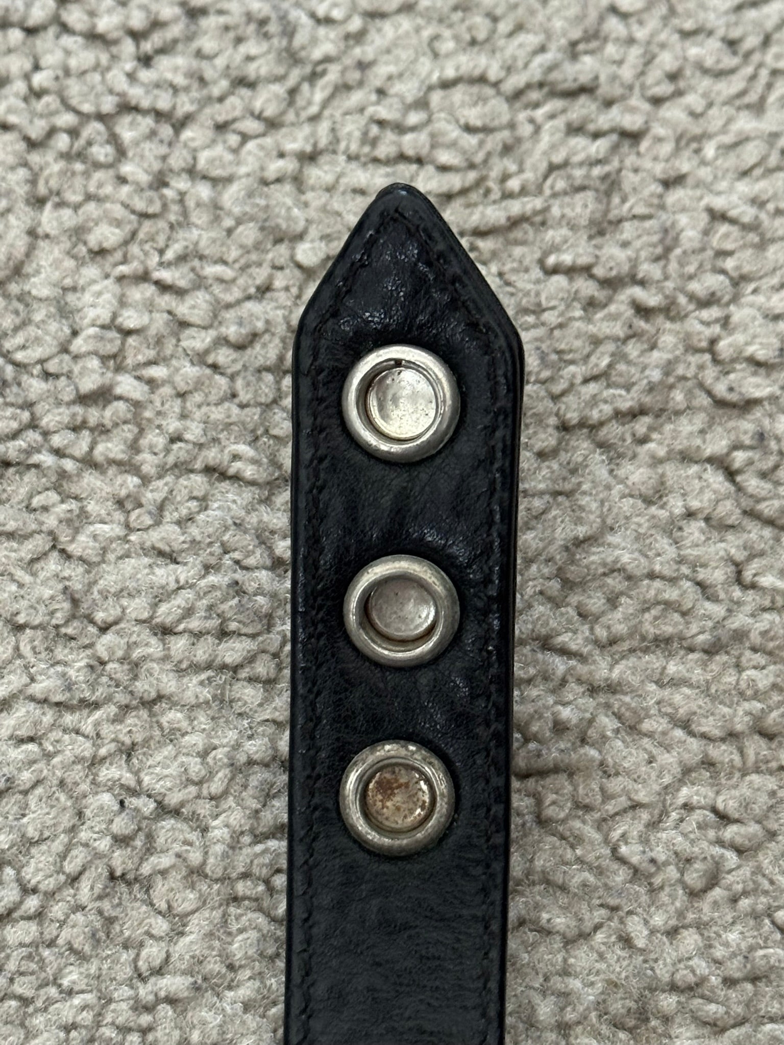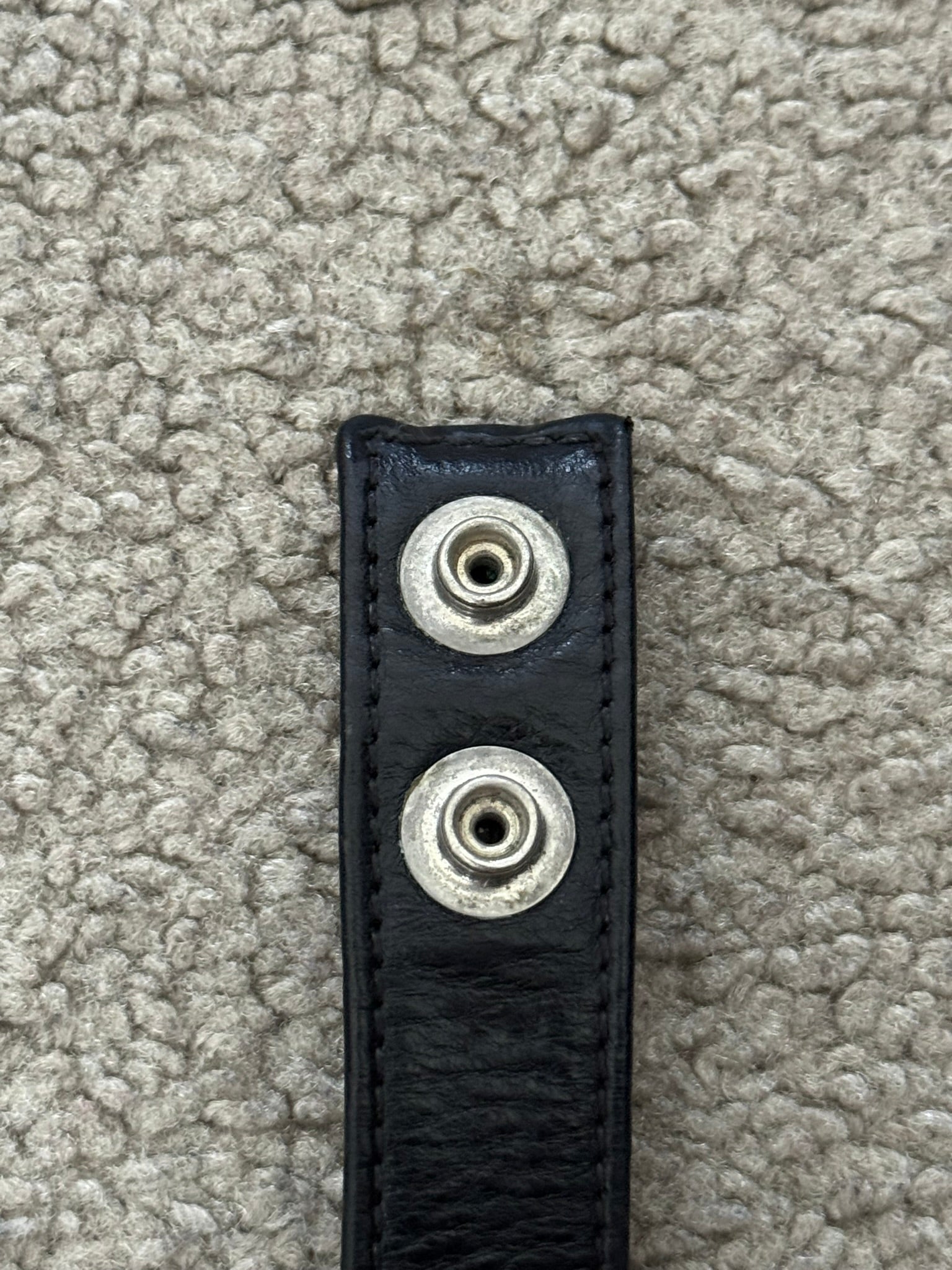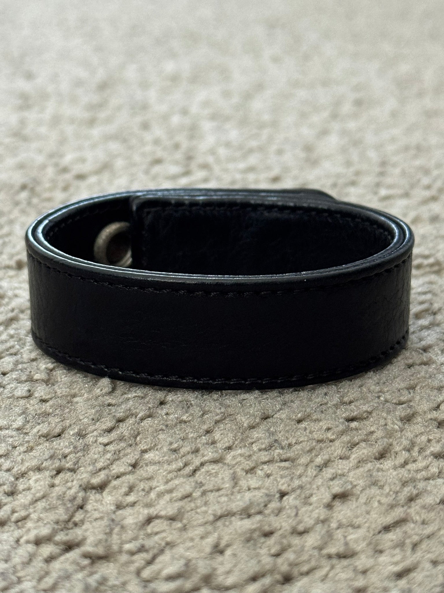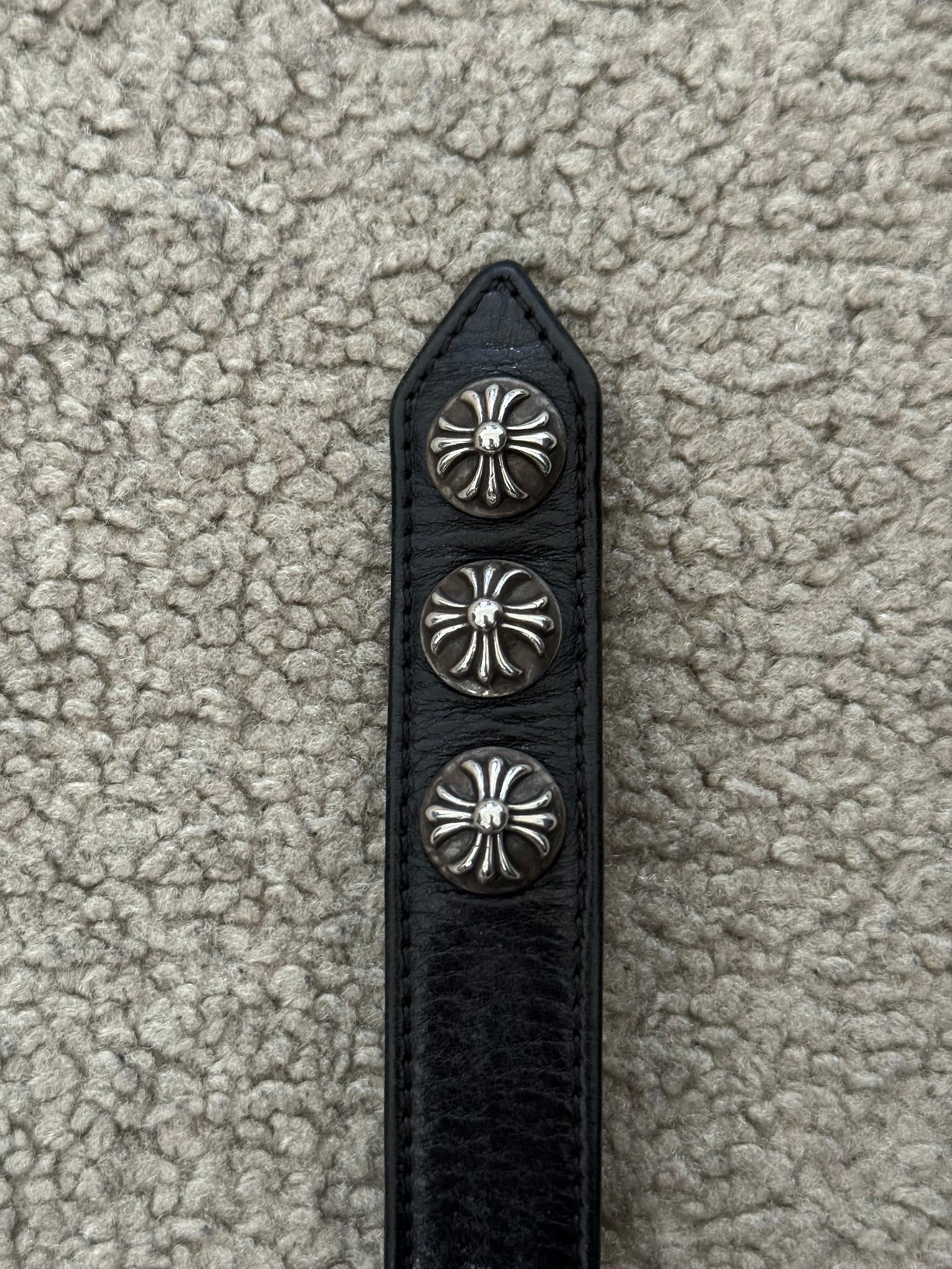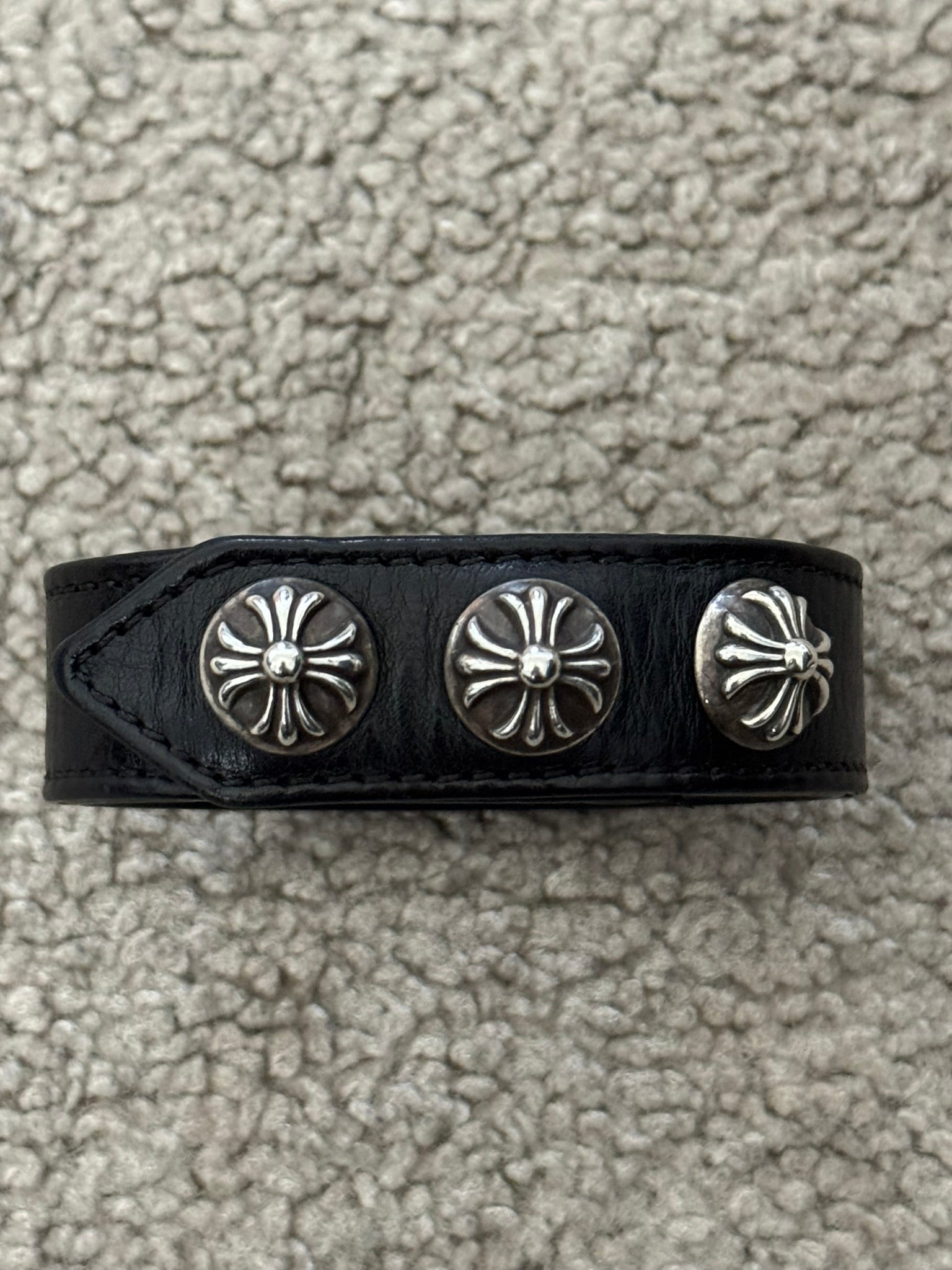 From iconic American leather & silver brand Chrome Hearts ran by Richard Stark and his family. This black leather bracelet features three of their .925 sterling silver cross motif buttons, two snap closures, and stamped text logo on the inside. In great condition, no real flaws. Everything as pictured. Made in USA. One size but is adjustable, fits around size small-medium wrist. Strap measures about 23 cm.
