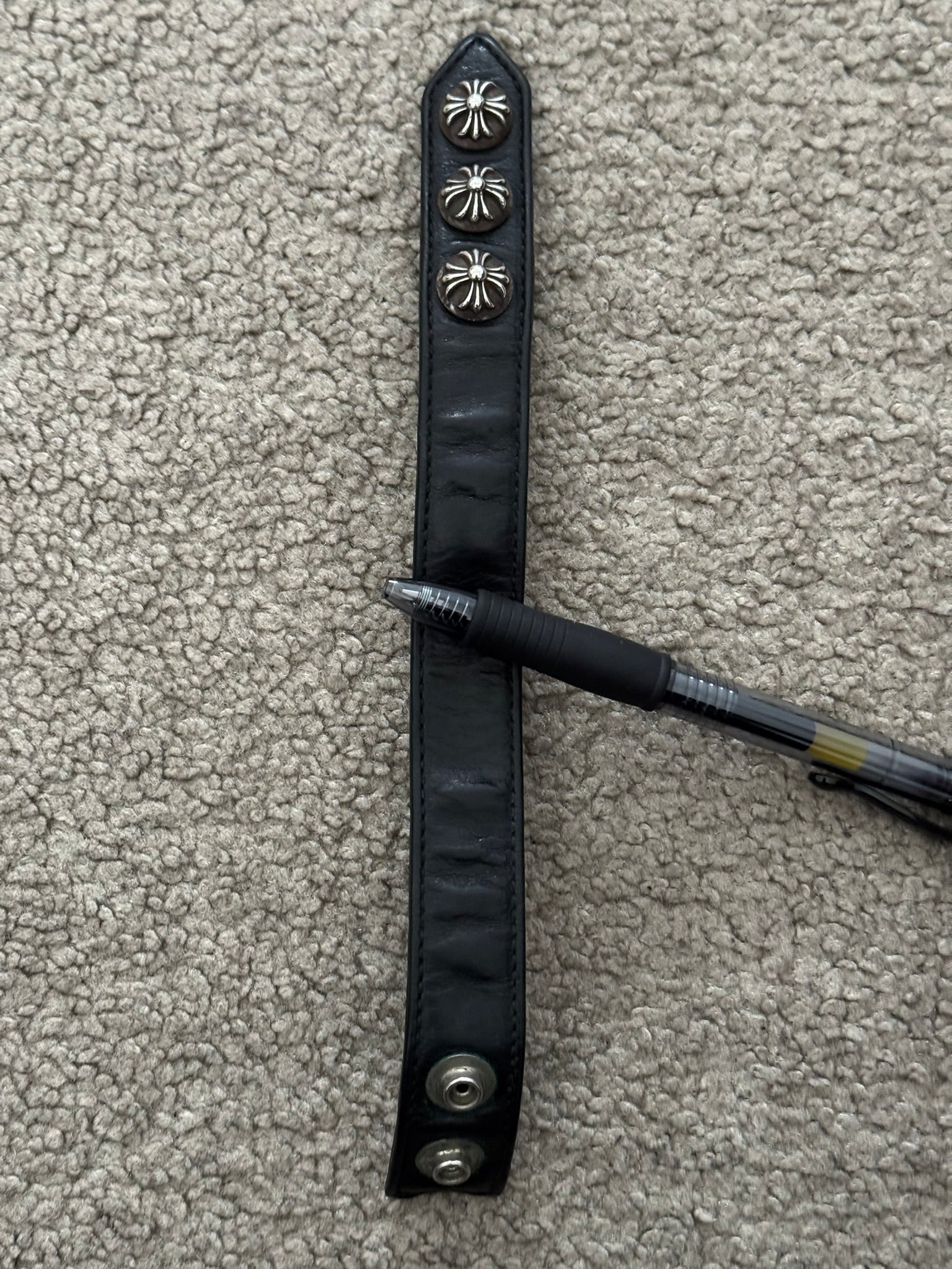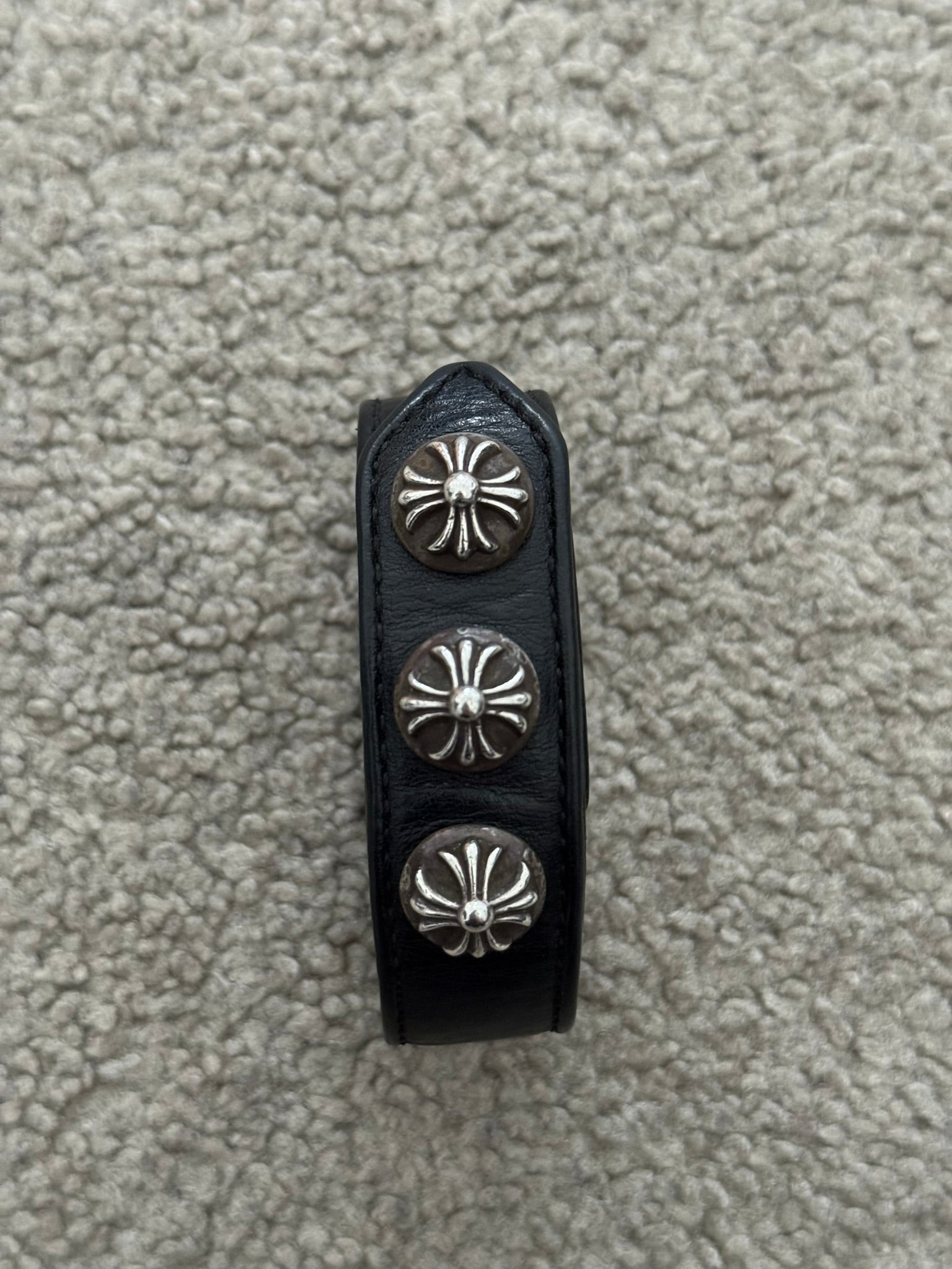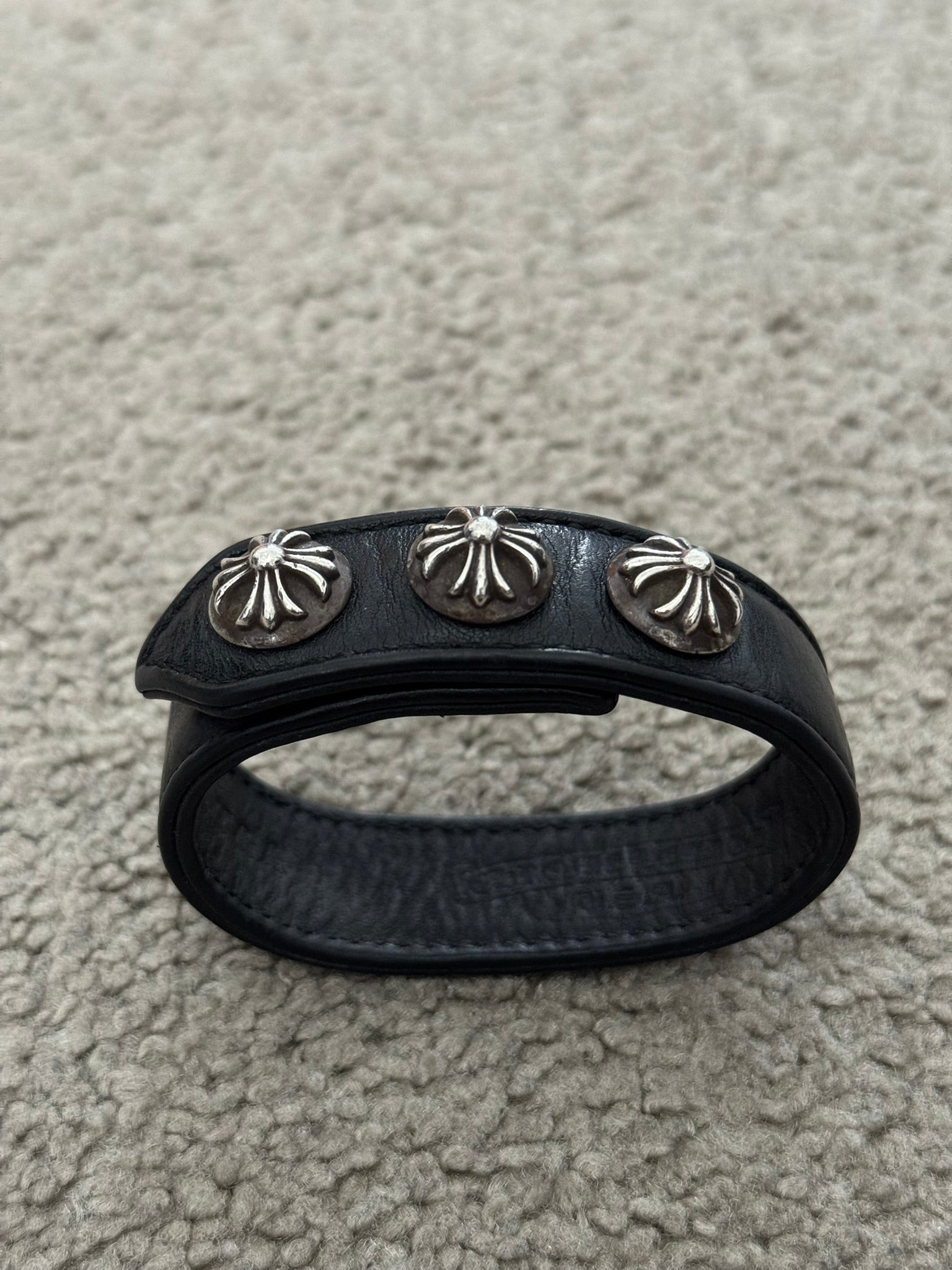 From iconic American leather & silver brand Chrome Hearts ran by Richard Stark and his family. This black leather bracelet features three of their .925 sterling silver cross motif buttons, two snap closures, and stamped text logo on the inside. In great condition, no real flaws. Everything as pictured. Made in USA. One size but is adjustable, fits around size small-medium wrist. Strap measures about 22 cm.