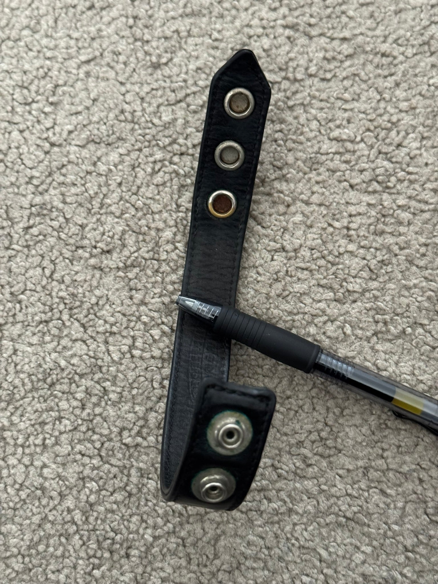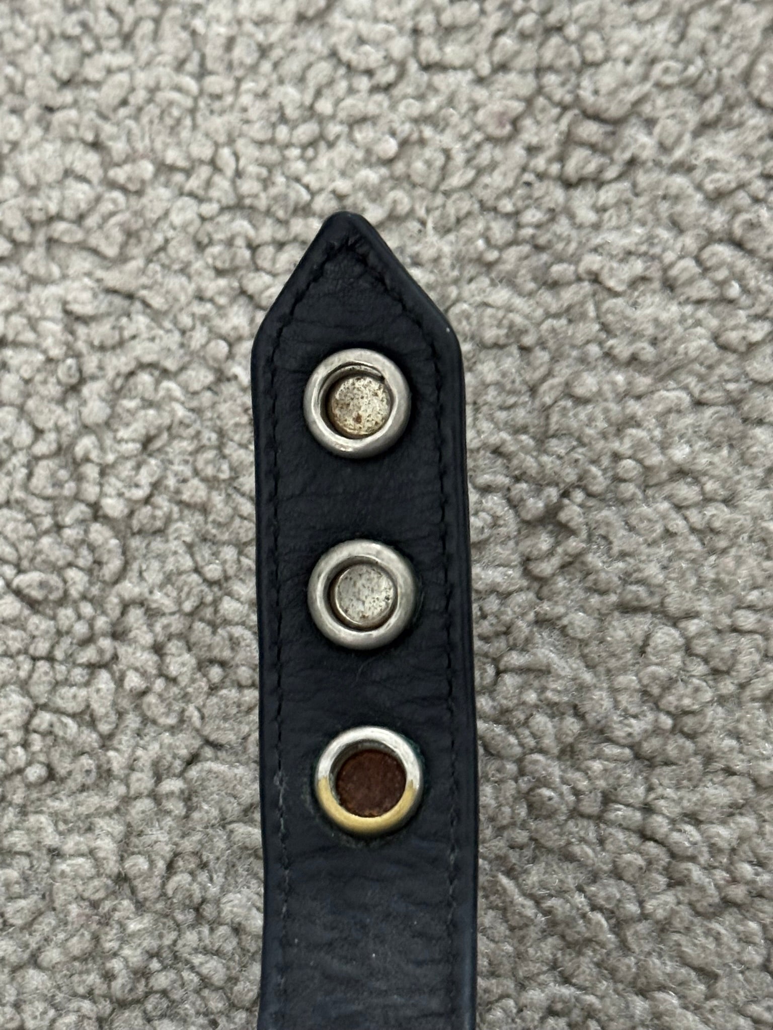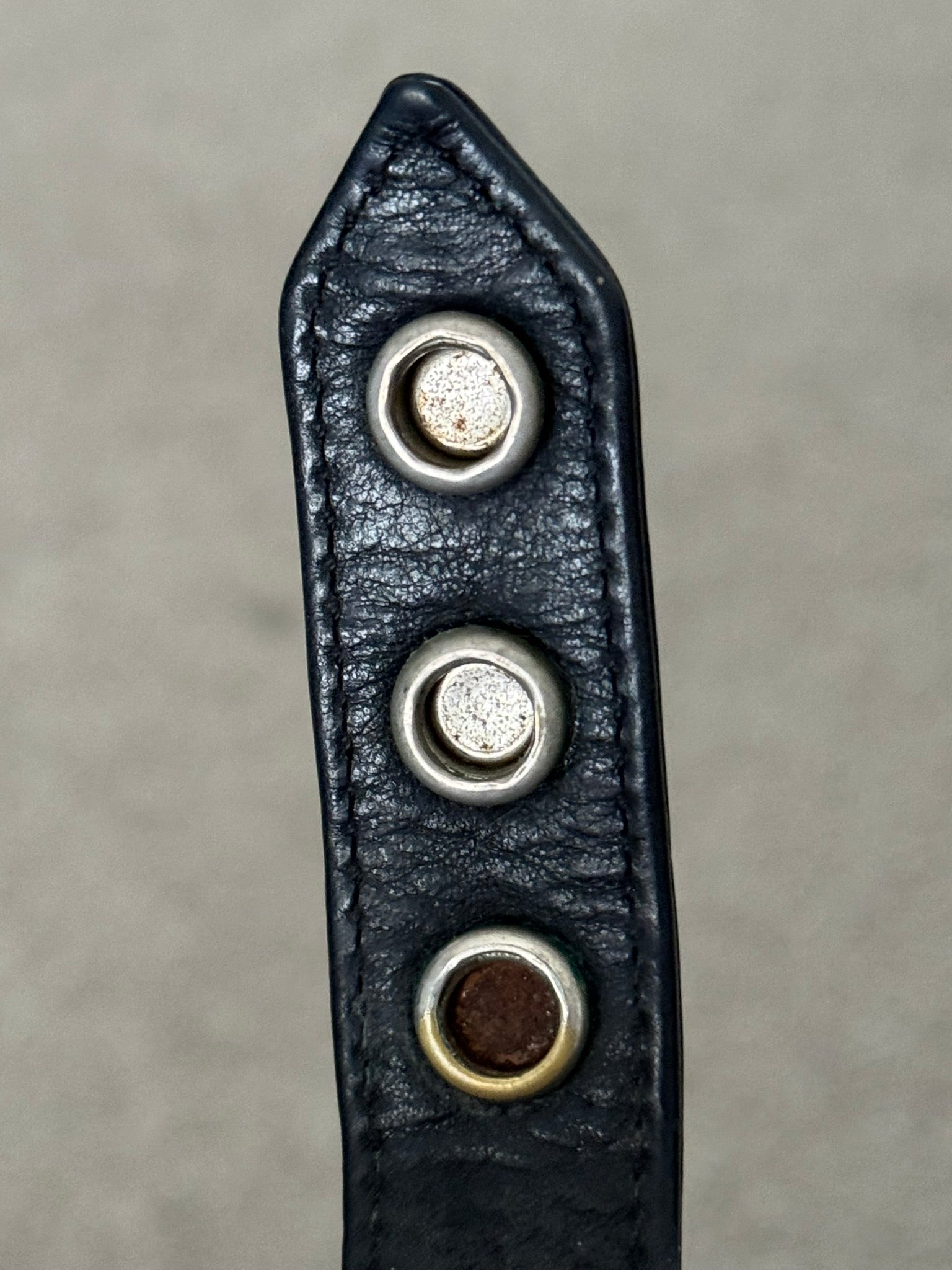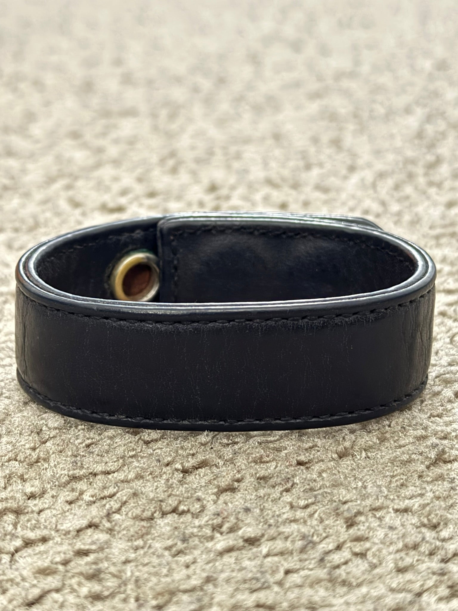 From iconic American leather & silver brand Chrome Hearts ran by Richard Stark and his family. This black leather bracelet features three of their .925 sterling silver cross motif buttons, two snap closures, and stamped text logo on the inside. In great condition, no real flaws. Everything as pictured. Made in USA. One size but is adjustable, fits around size small-medium wrist. Strap measures about 22 cm.