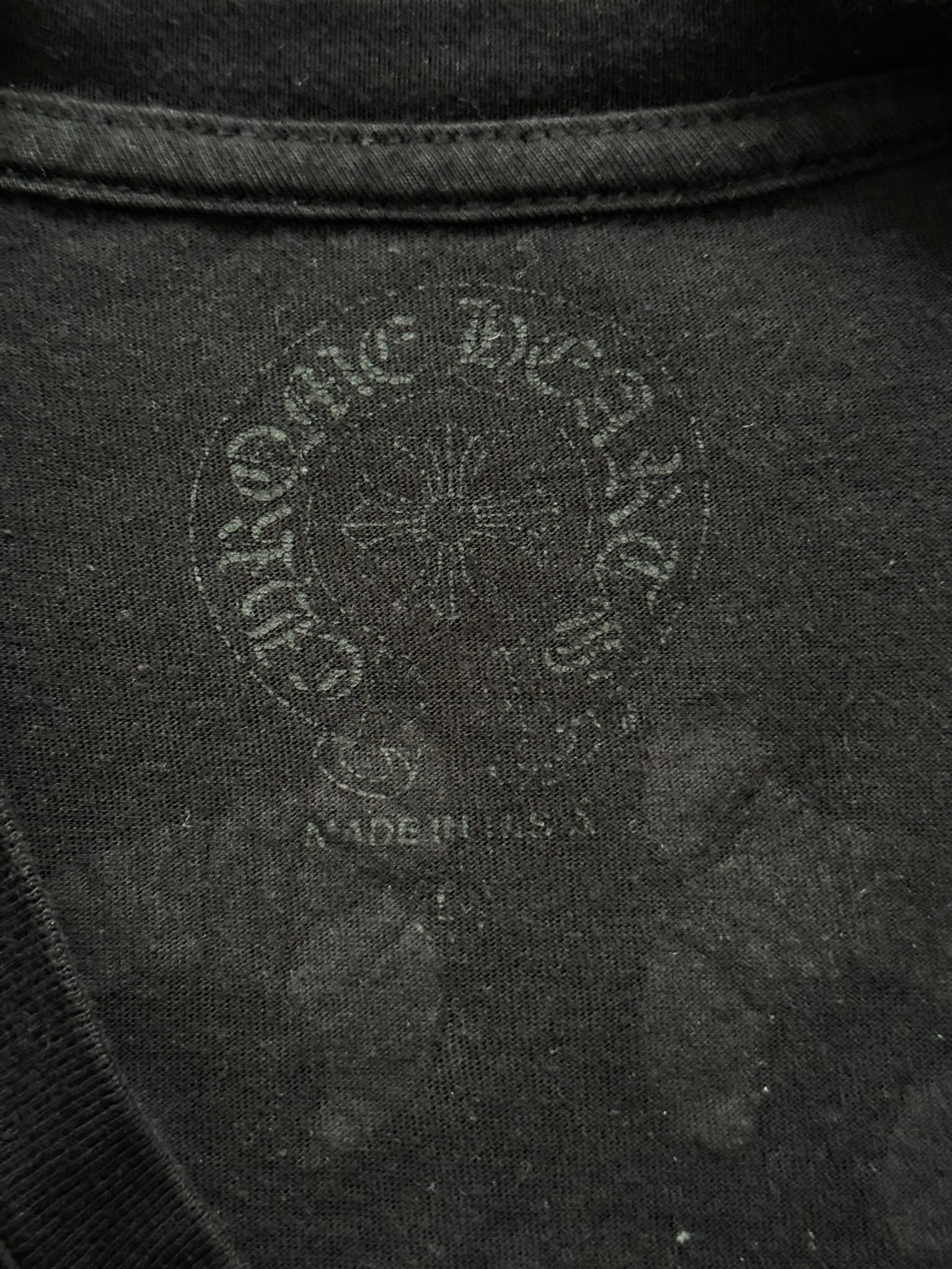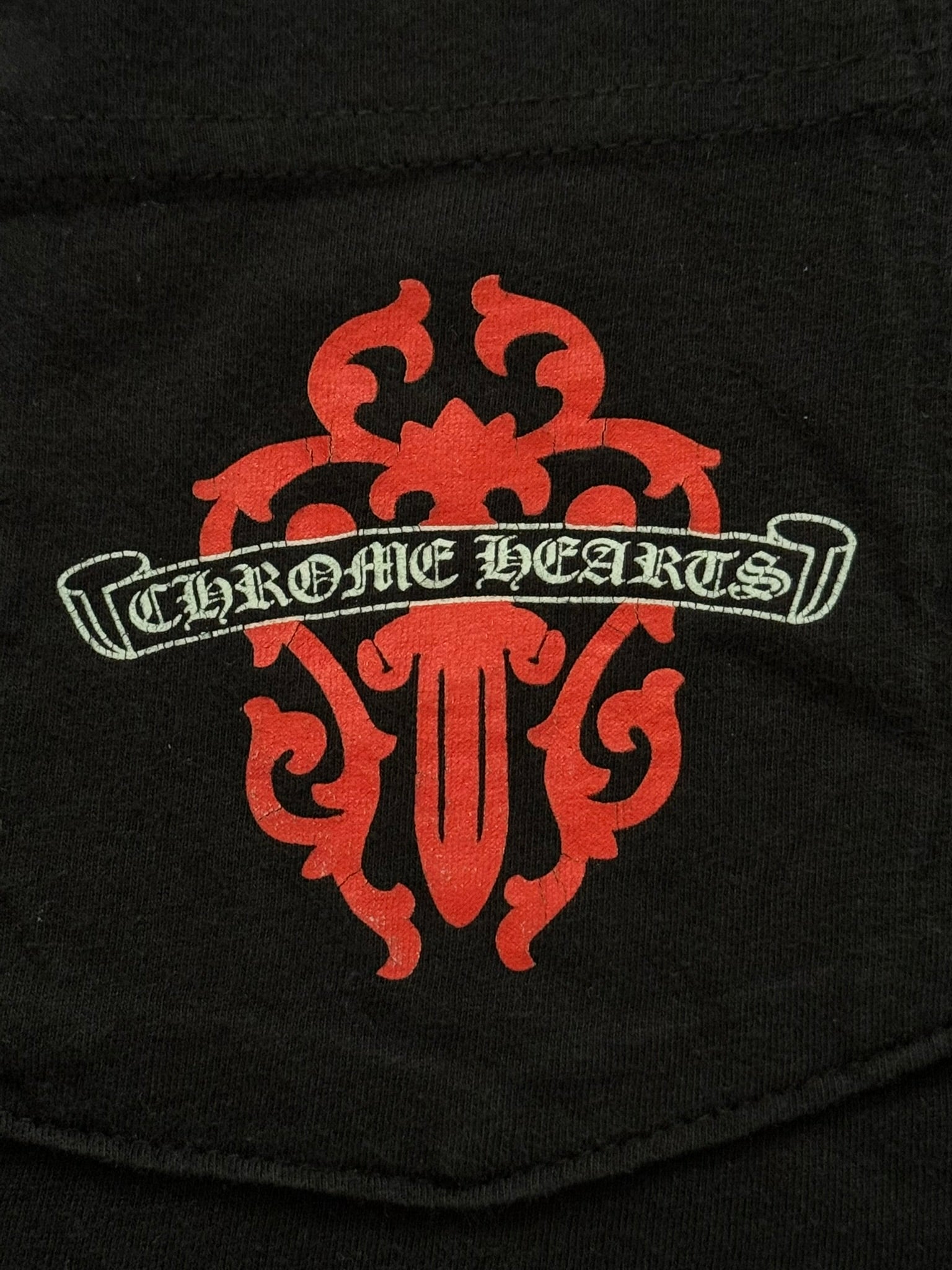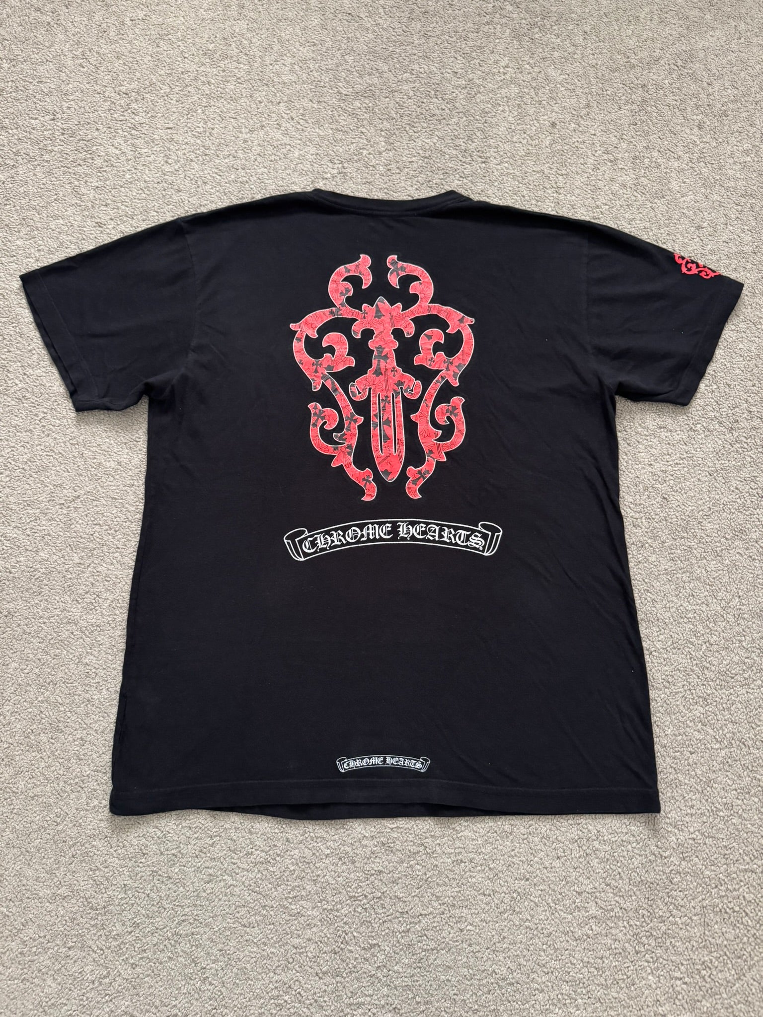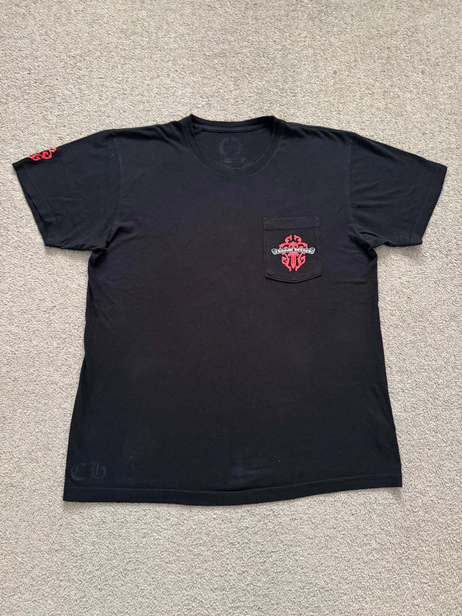 From iconic American leather & silver brand Chrome Hearts ran by Richard Stark and his family. This all black tee features a chest pocket with their iconic scroll logo over their vine dagger motif in red, tonal black CH at the bottom hem, another vine dagger on sleeve, and two more scroll logos printed on the back underneath a big vine dagger. In great condition, no real flaws. Made in the USA. Tagged a size large.