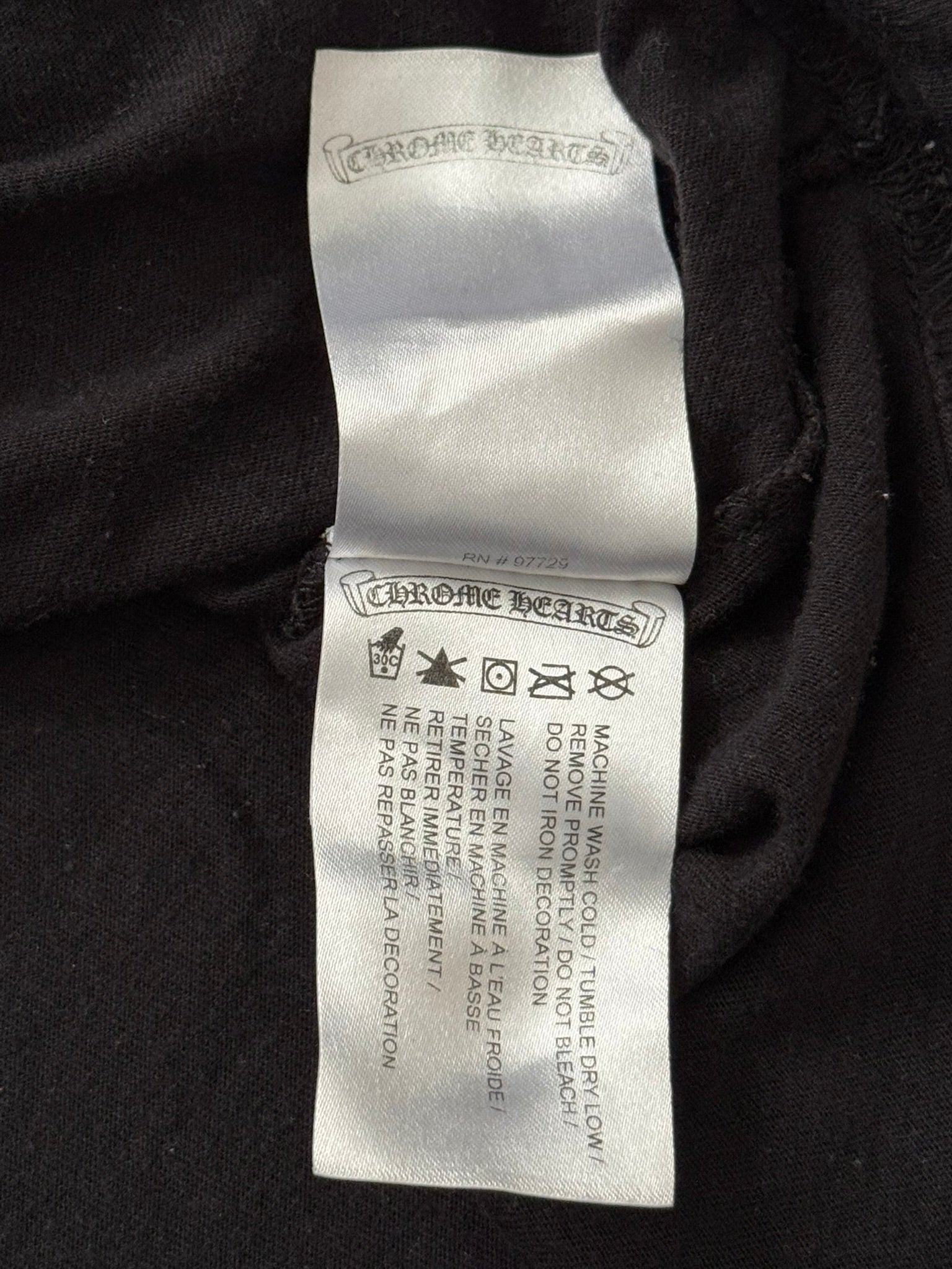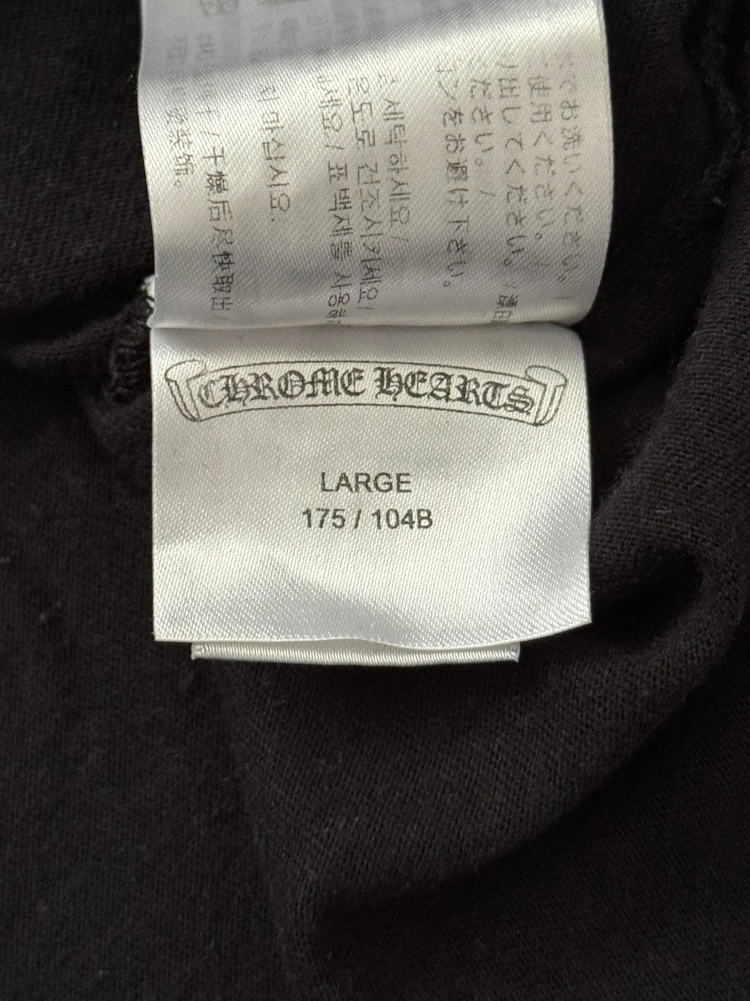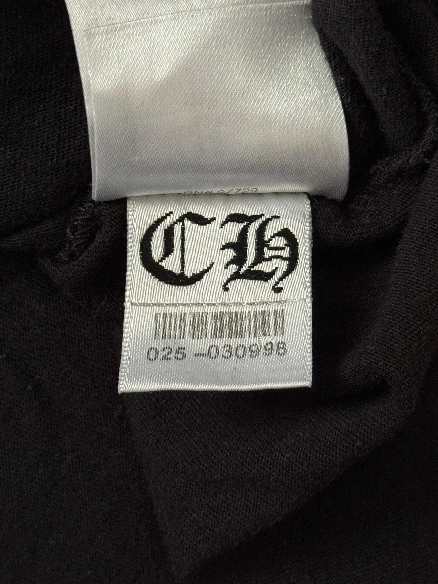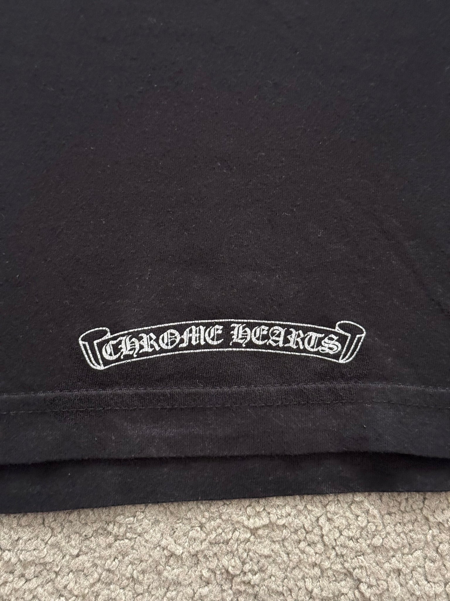From iconic American leather & silver brand Chrome Hearts ran by Richard Stark and his family. This all black tee features a chest pocket with their iconic scroll logo over their vine dagger motif in red, tonal black CH at the bottom hem, another vine dagger on sleeve, and two more scroll logos printed on the back underneath a big vine dagger. In great condition, no real flaws. Made in the USA. Tagged a size large.