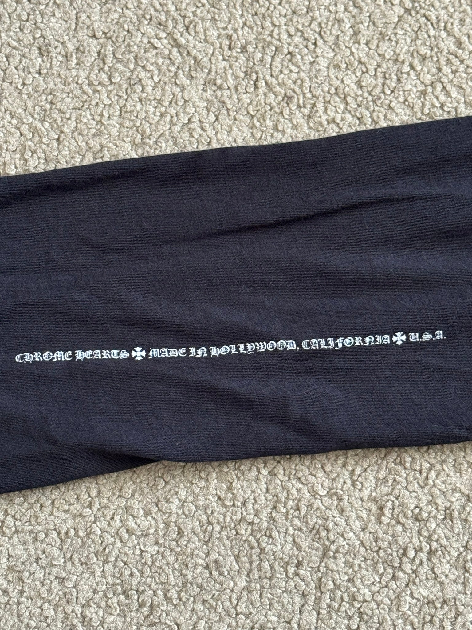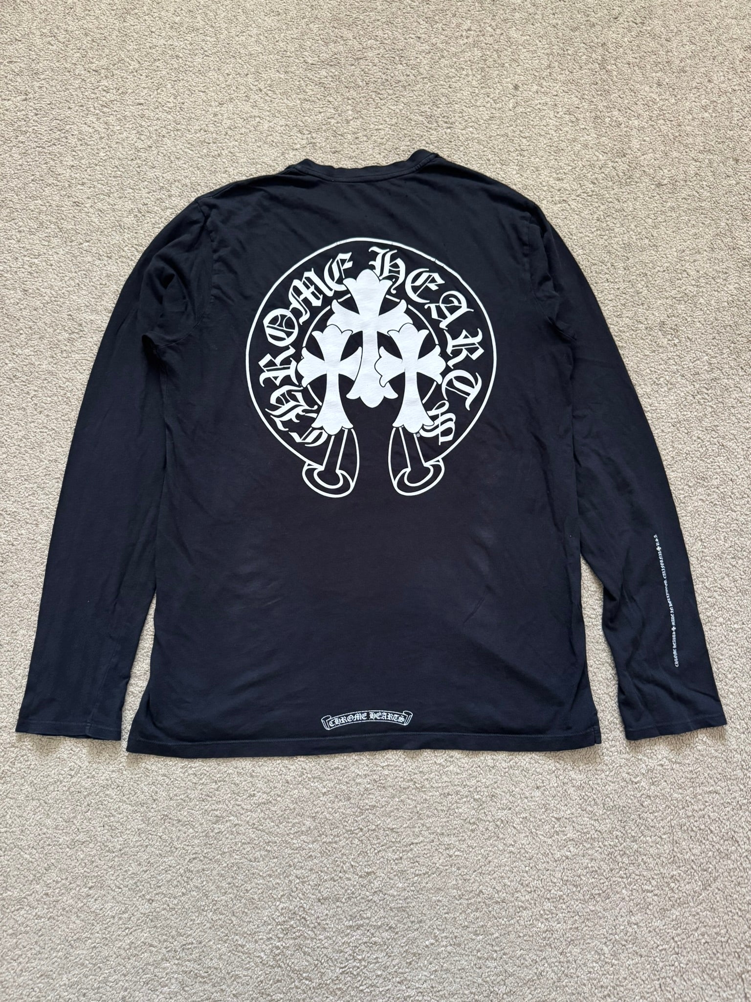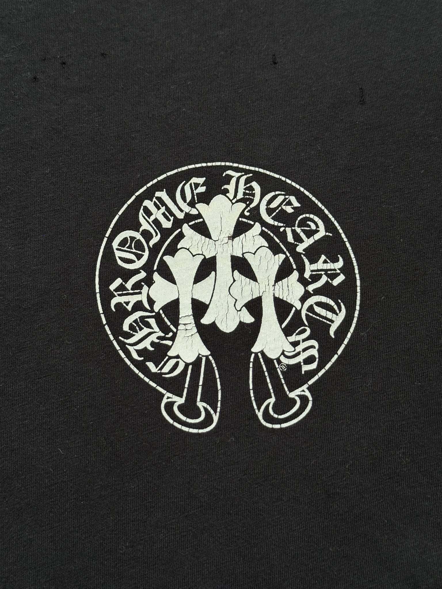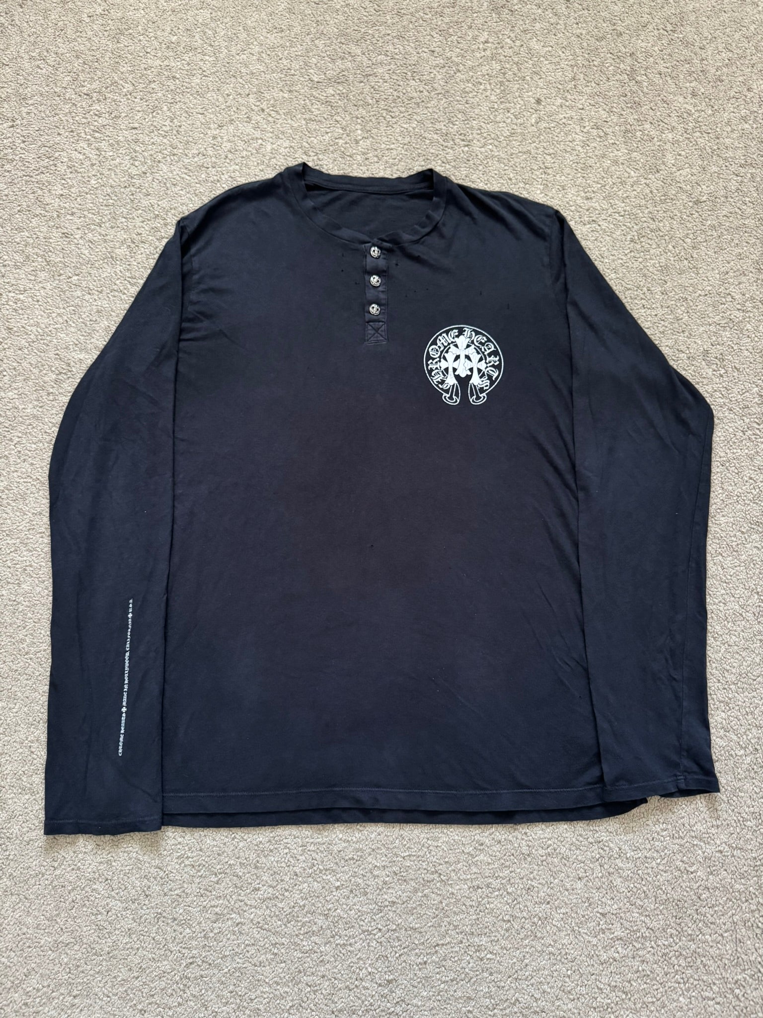 From iconic American leather & silver brand Chrome Hearts ran by Richard Stark and his family. This lovely vintage black henley button up long sleeve shirt in a lightweight 100% cotton material features three .925 sterling silver buttons with their "fleur" motifs, screen printed horseshoe and triple cemetery cross logos on the front & back with the classic script text logo, and small arm text graphic on the sleeve. In good condition, multiple small pinholes on the front and back that are pictured; no other real flaws. Made in U.S.A. Tagged a size medium, measurements are listed.
