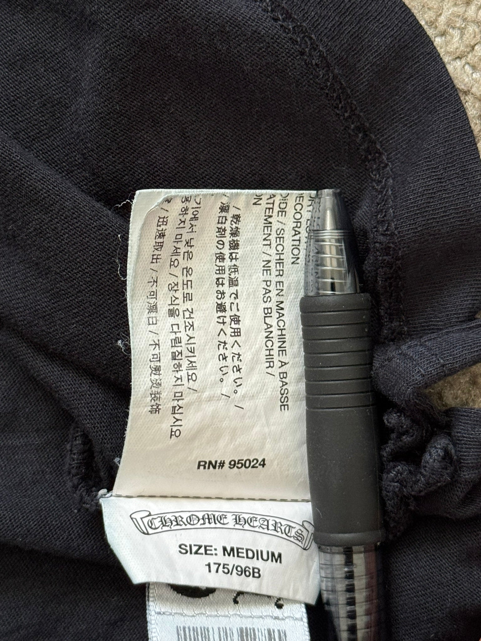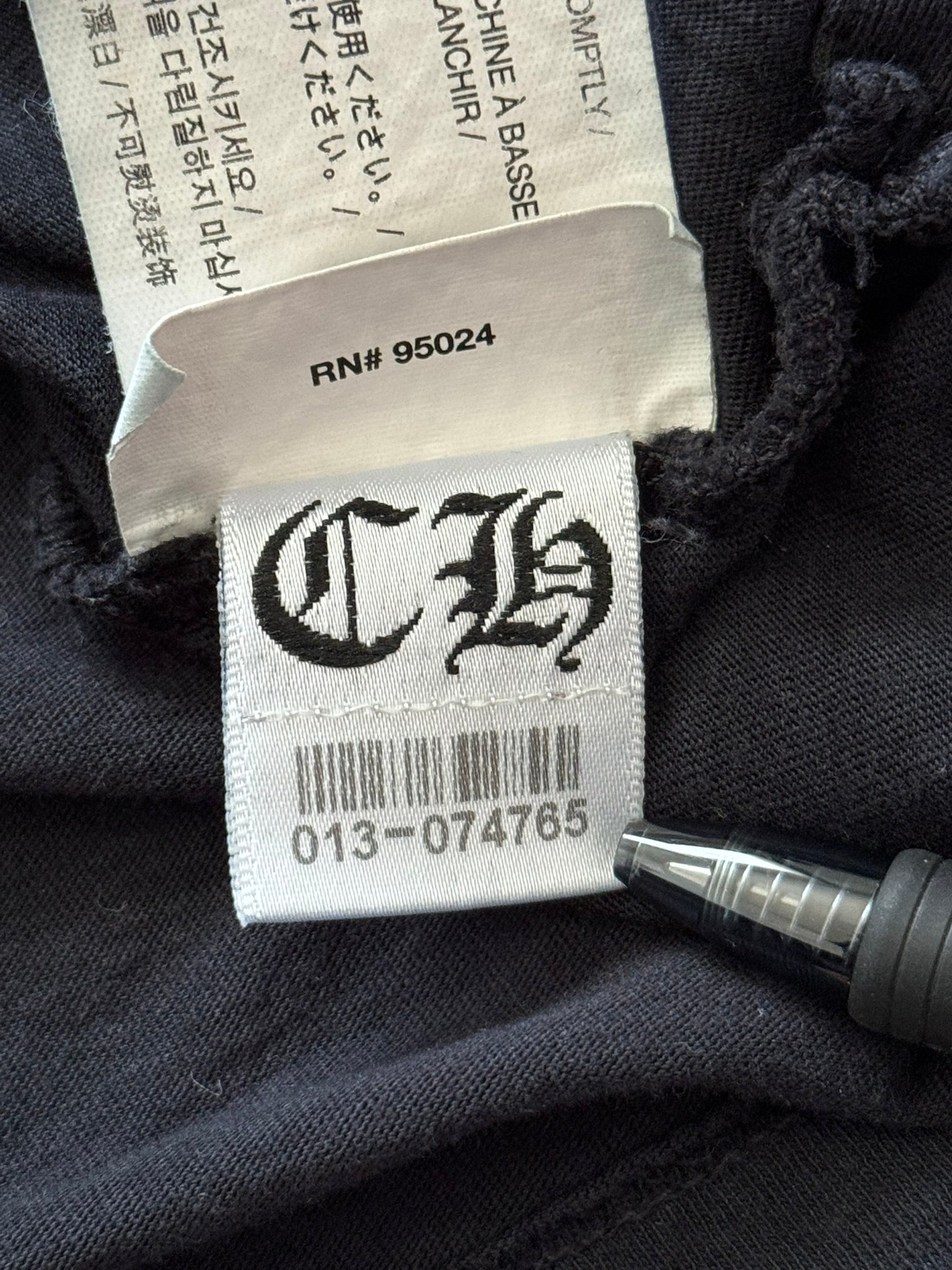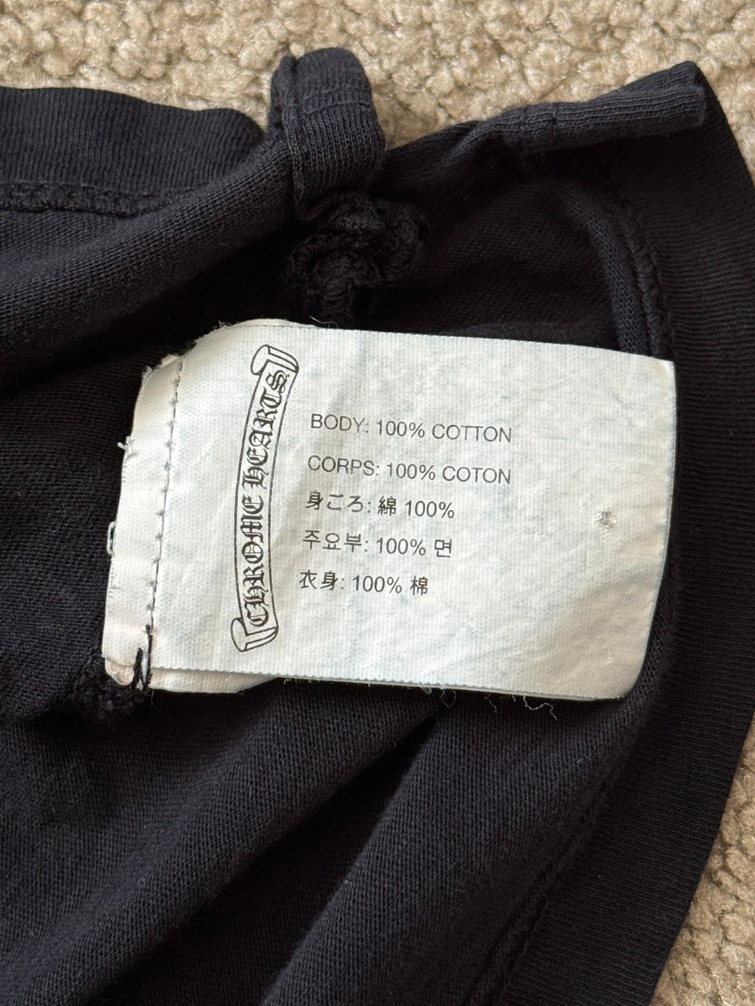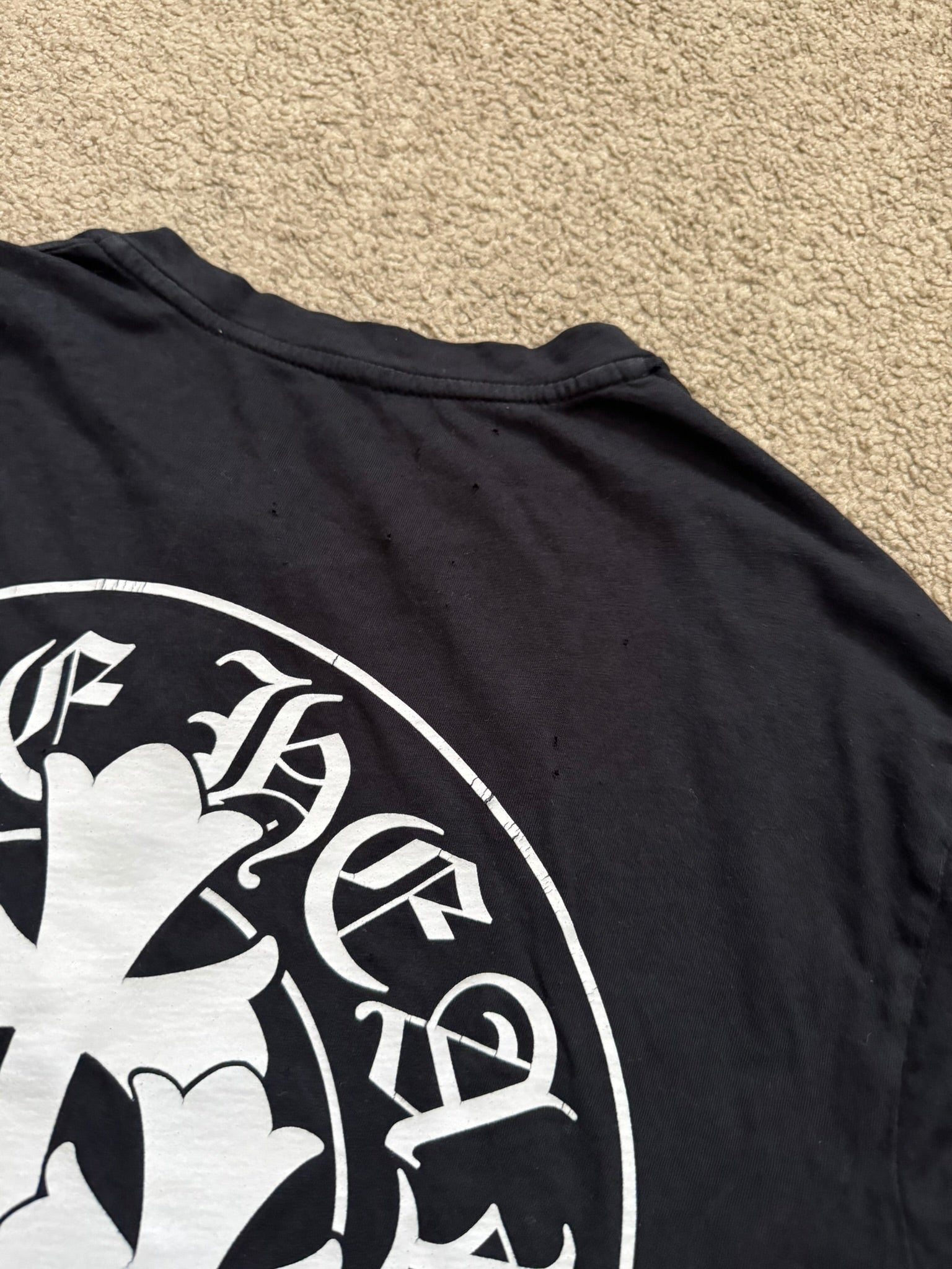 From iconic American leather & silver brand Chrome Hearts ran by Richard Stark and his family. This lovely vintage black henley button up long sleeve shirt in a lightweight 100% cotton material features three .925 sterling silver buttons with their "fleur" motifs, screen printed horseshoe and triple cemetery cross logos on the front & back with the classic script text logo, and small arm text graphic on the sleeve. In good condition, multiple small pinholes on the front and back that are pictured; no other real flaws. Made in U.S.A. Tagged a size medium, measurements are listed.