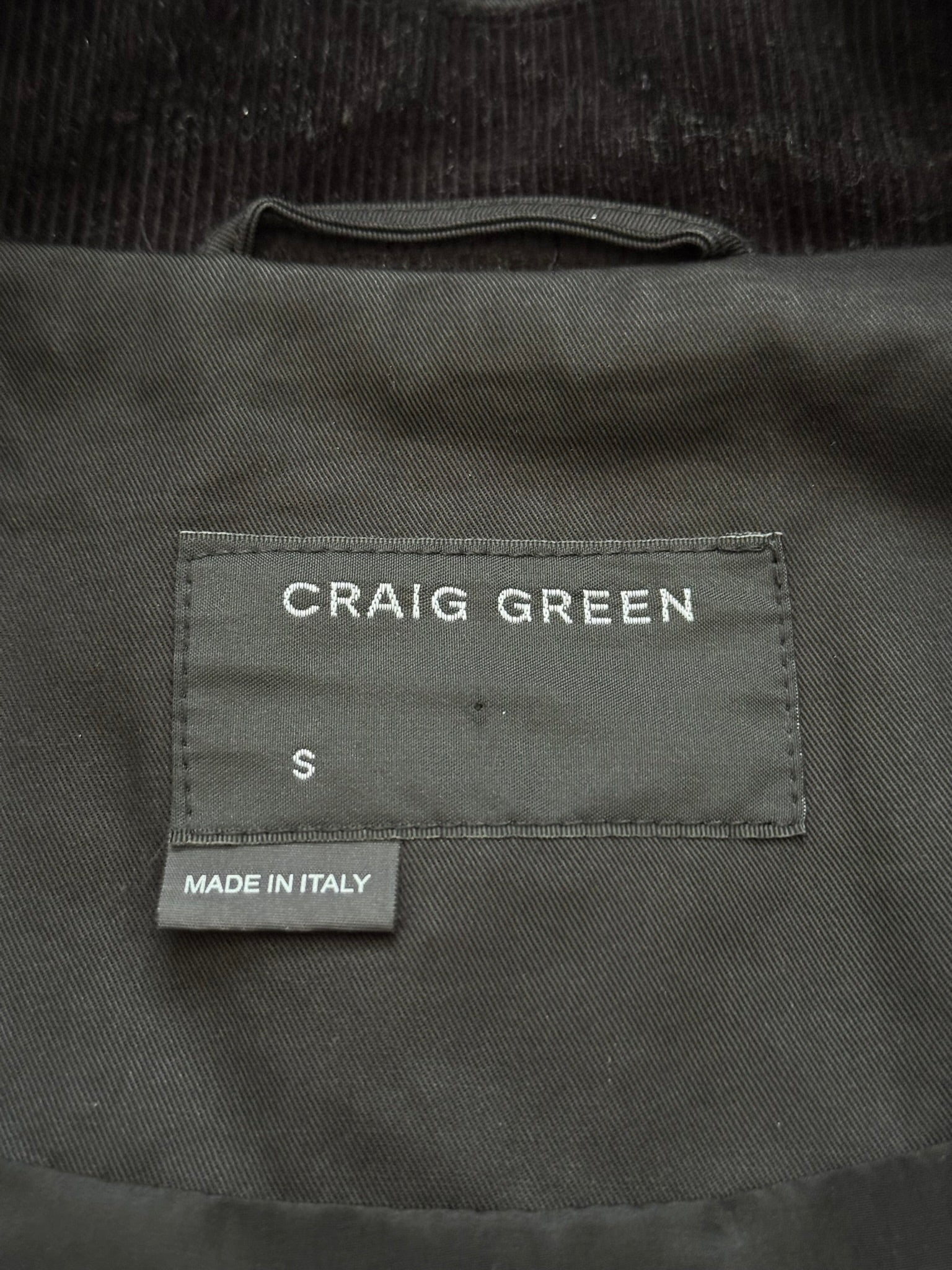 From British designer Craig Green and his namesake label. This jacket with a black polyester/nylon twill outer features white drawstring lace details throughout, four front pockets, one inside pocket, sleeve adjusters, and front snap button closure. In good condition, minor marks throughout; everything as pictured, no real flaws. Made in Italy. Tagged a size small.