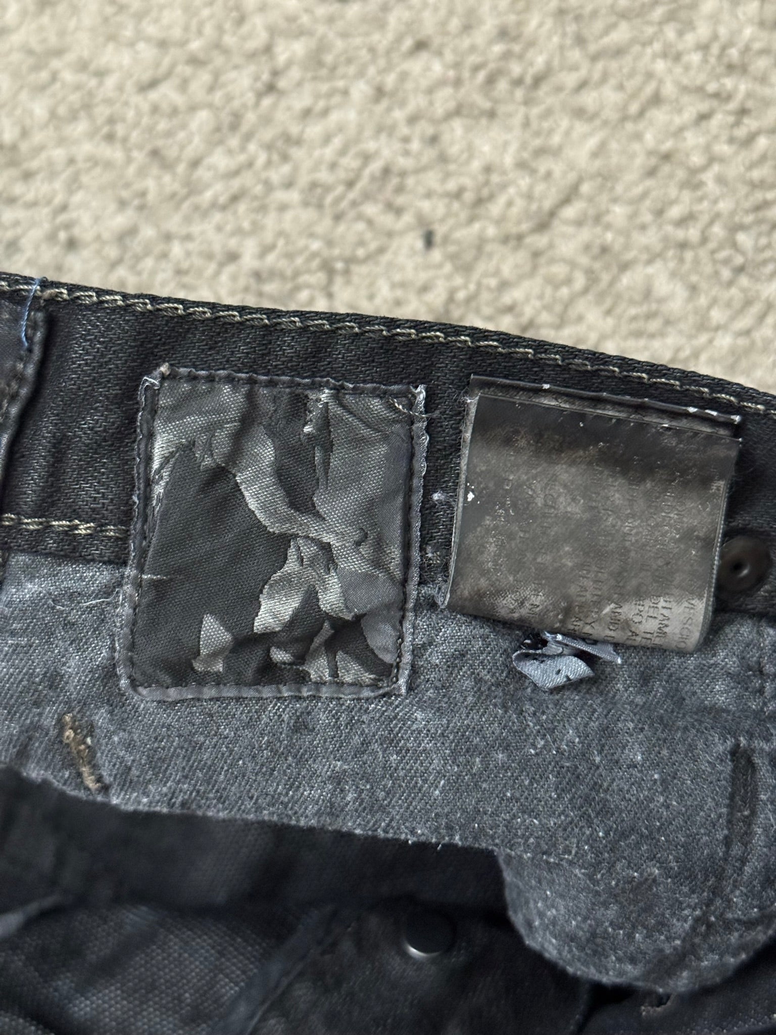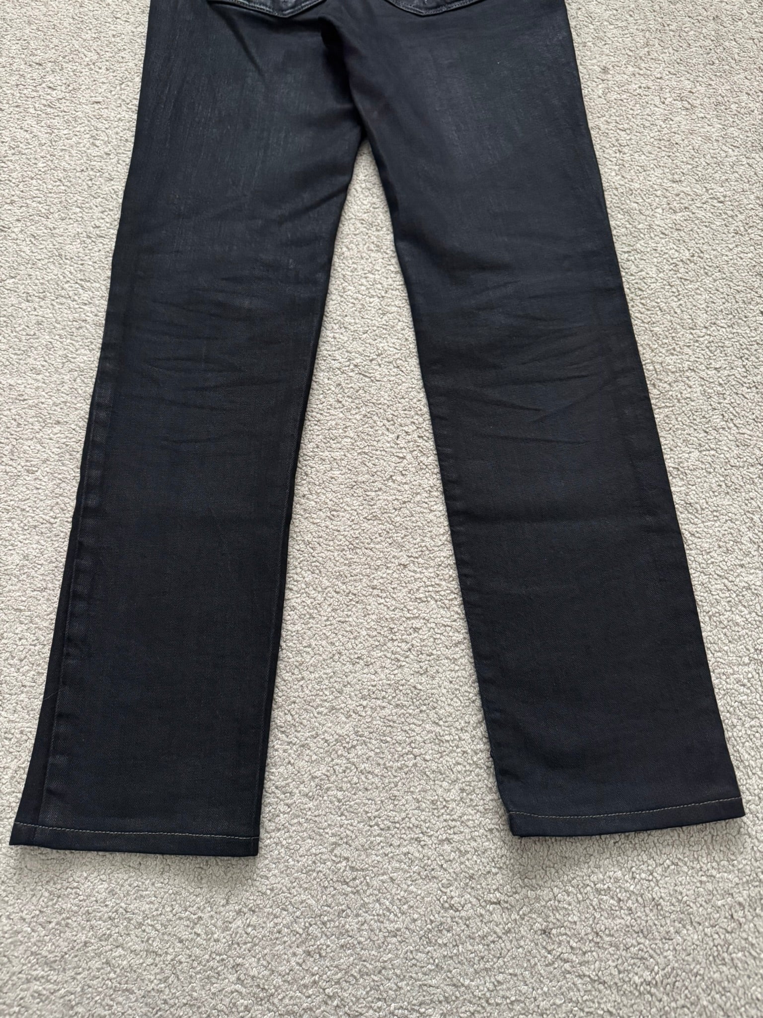 From Rick Owens’s DRKSHDW line and his FW08 collection titled "Stag." These low waisted slim black "Detroit" cut denim jeans, made prior to 2013 with the old Olmar & Mirta tags, features a light black wax coating throughout, six pocket construction, darting details at the front, and a button fly. In great condition, no real flaws. Made in Italy. Tagged a size 28.
