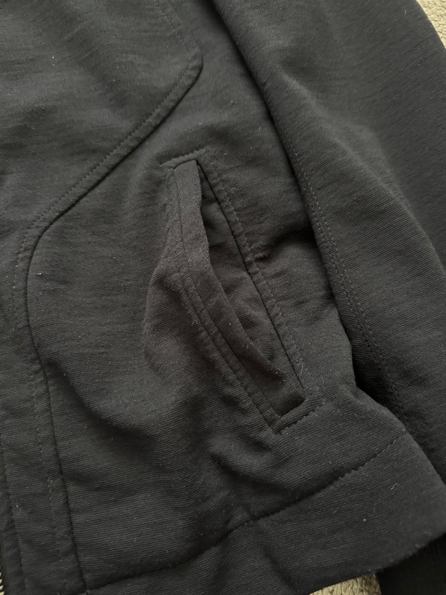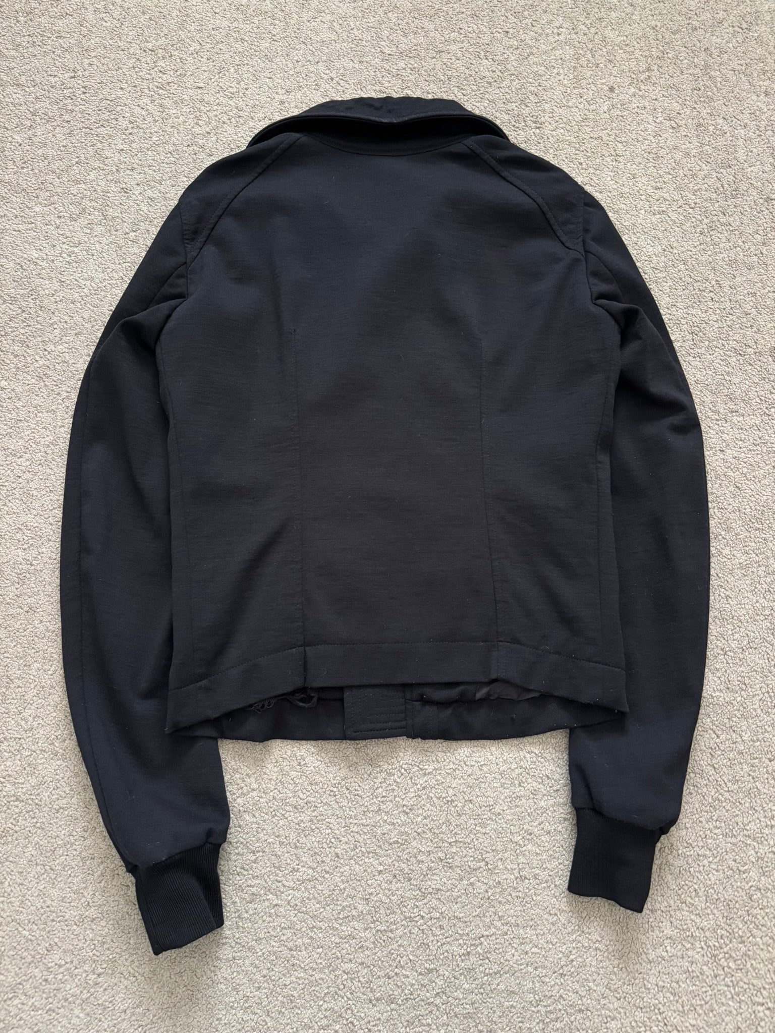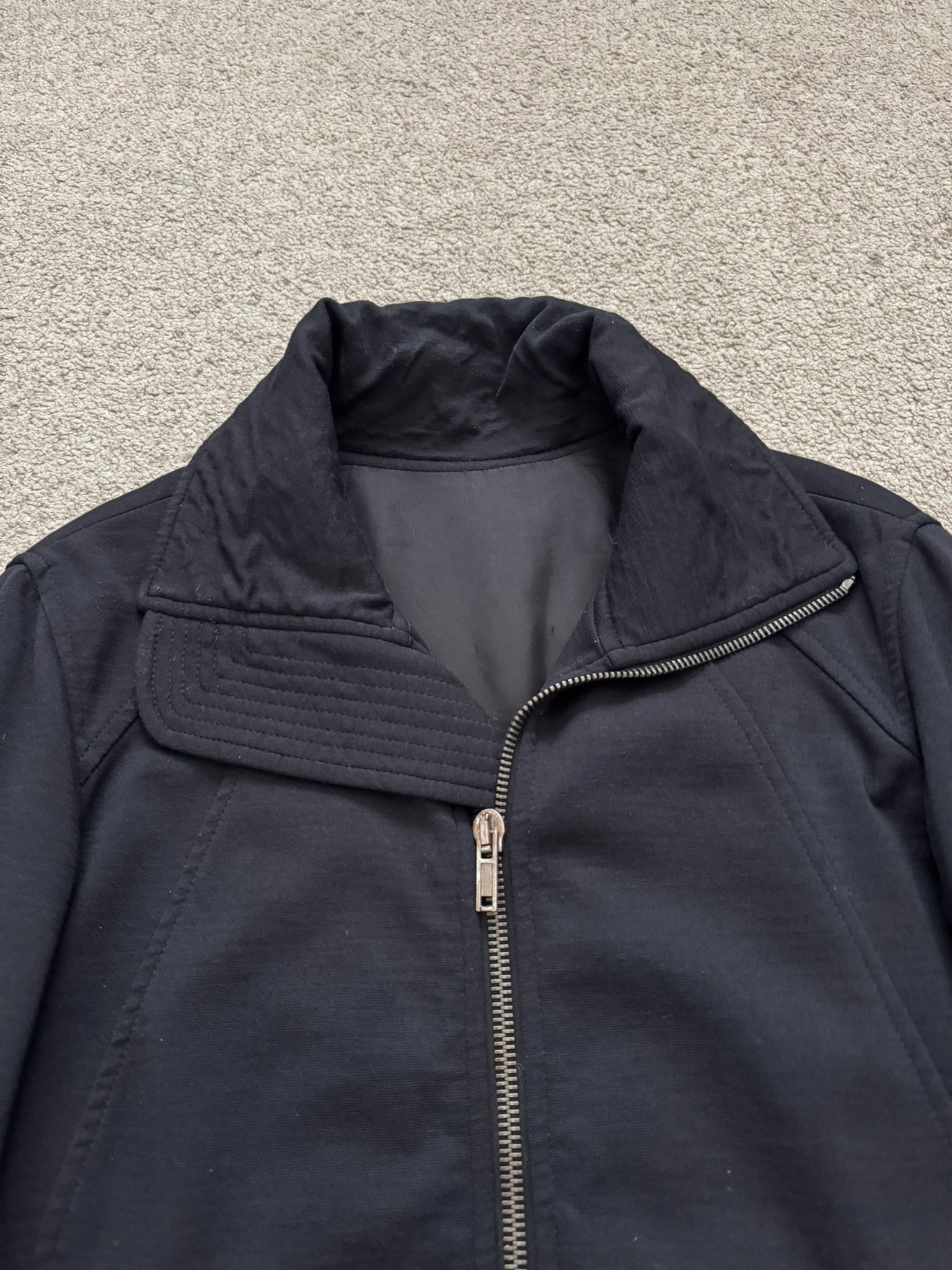 From Rick Owens’s namesake mainline label and his FW09 collection titled "Crust." This very rare biker Intarsia style jacket made from a thick woven cotton blend material for the outer with wool cuffs and cotton/rayon/silk lining feature two front pockets, two inside button pockets, and a silver RY zipper with an exaggerated extended collar. A beautiful piece, extremely hard to come by in this fabric. In good condition, no real flaws besides tear in bottom of lining and minor tears inside lining of sleeves that does not affect wearability at all. Made in Italy. Tagged a size small.