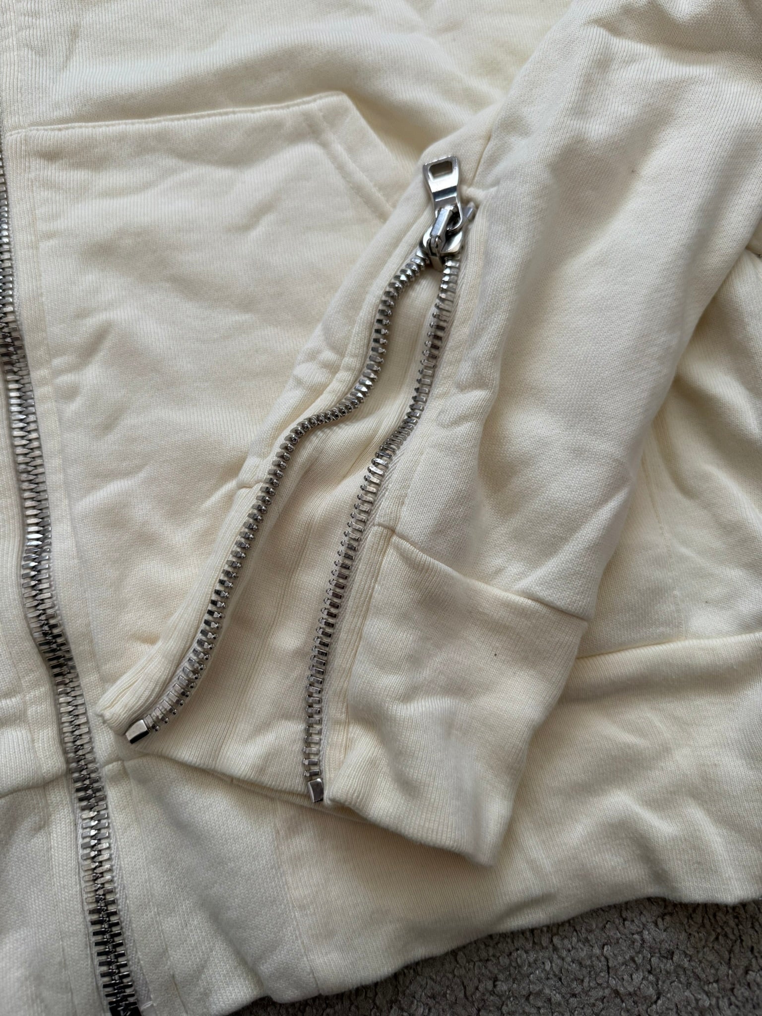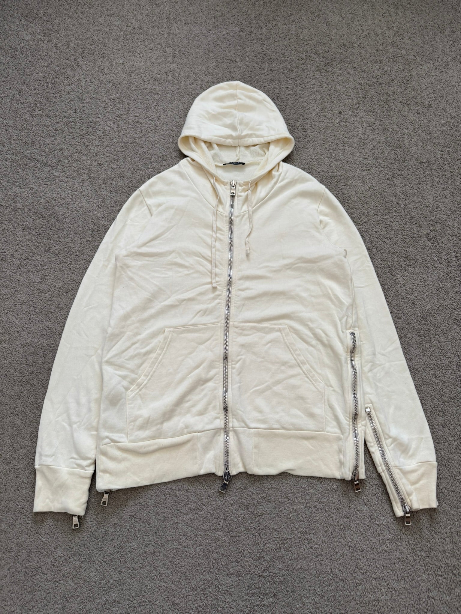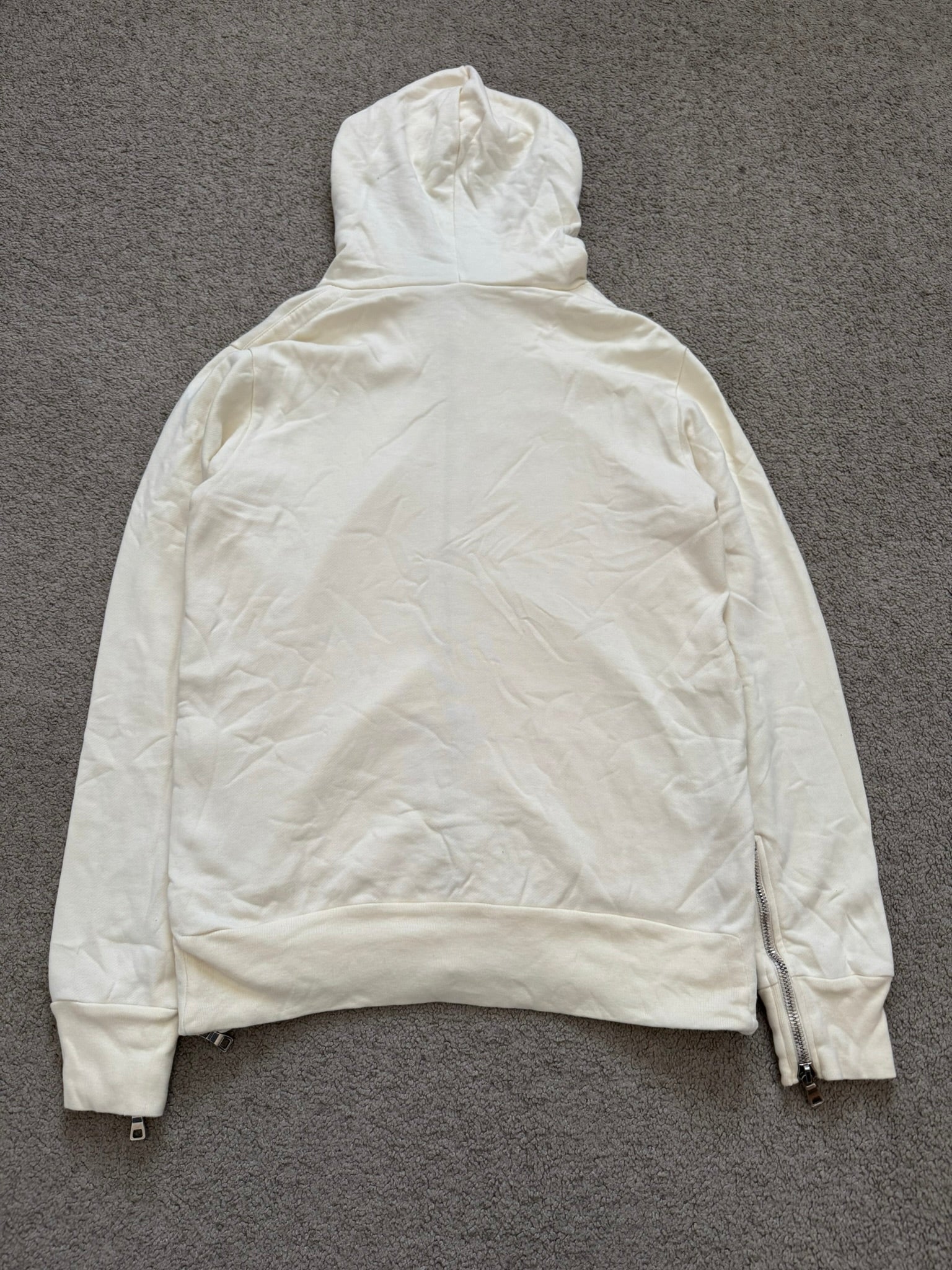 From Christophe Decarnin's tenure at luxury French fashion house Balmain and their FW11 collection. This beautiful white/cream colored zip up hoodie features side zipper details and zipper adjusters at the sleeves. All zippers are quality silver Lampo zips. In great condition, no real flaws besides being wrinkly from storage. Made in Portugal. Tagged a size small, measurements are listed.