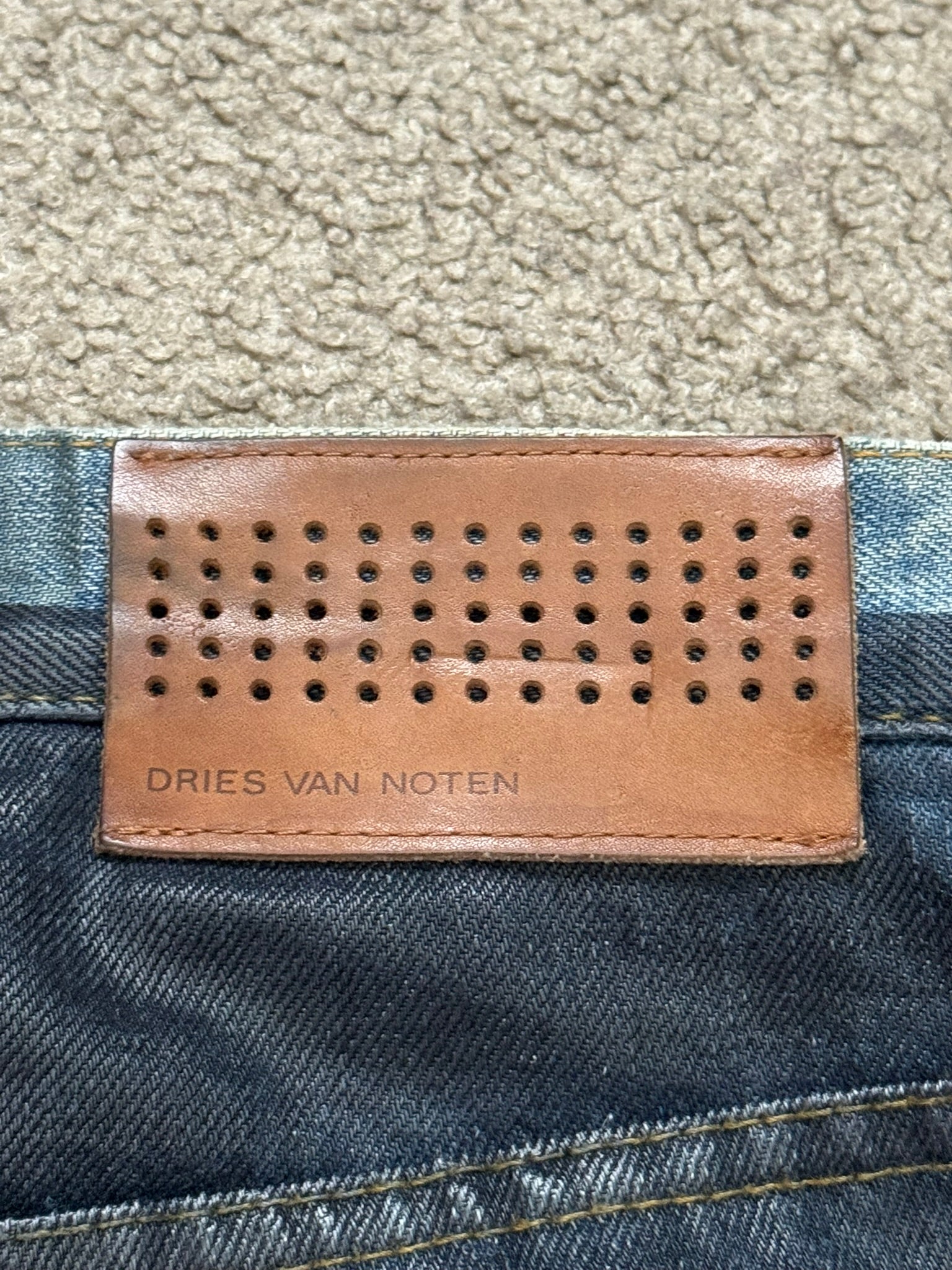 From Dries Van Noten's namesake mainline label and his FW12 collection. These light wash skinny jeans feature a black/navy wax coating throughout with a contrasting waistband that reveals the untreated denim color, brown logo leather patch on the back, 5 pocket construction, and a button fly with embossed logos. Really rare piece, as featured on the runway. In good condition, beautiful fading and wear throughout with small tears at pockets; no other real flaws. Everything as pictured. Made in Tunisia. Tagged a size 31.
