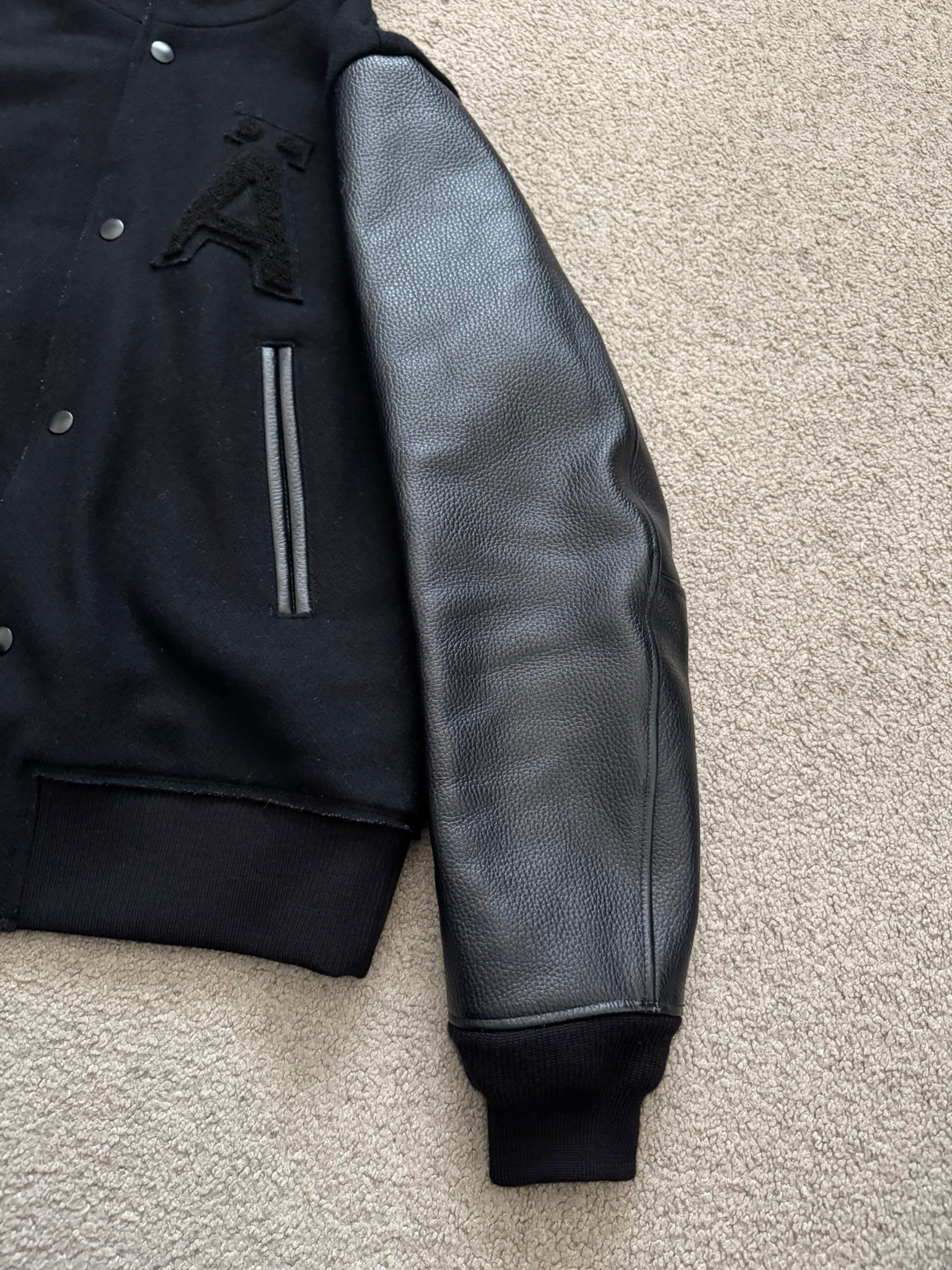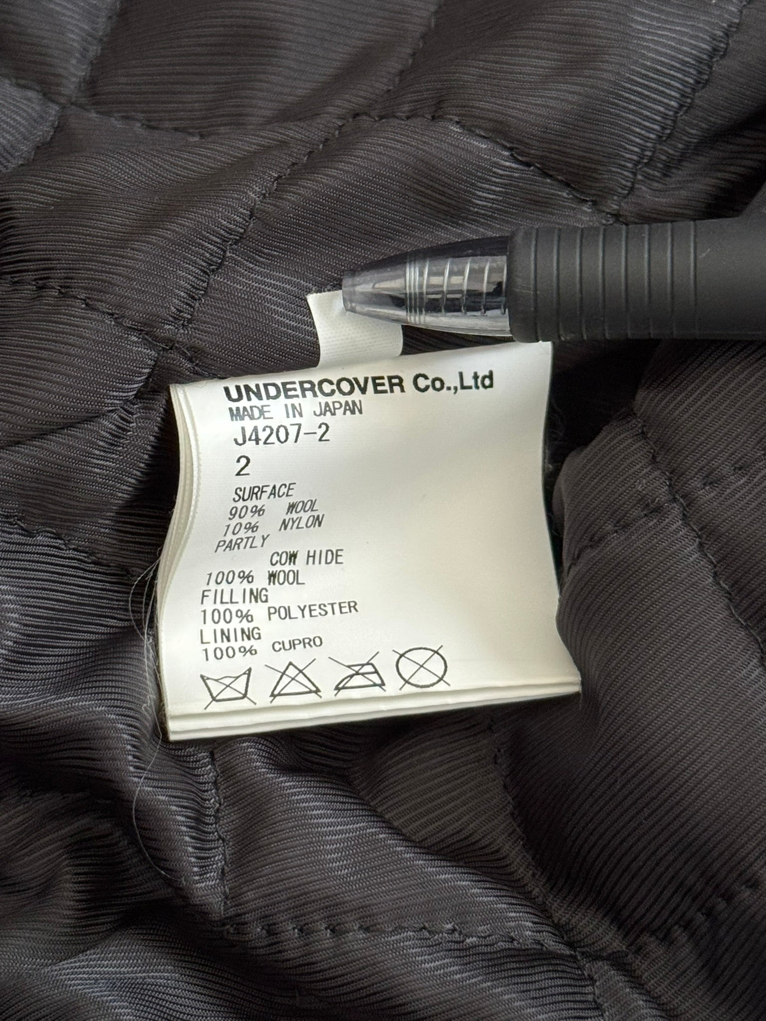 From Jun Takahashi's Undercover and their FW12 collection titled "Psycho Color." This all black wool bomber jacket with cowhide leather sleeves & quilted lining features a felt "Ä" patch on the front, "Geräusch" felt patch on the back, an attached hoodie with a wave/blob shaped patch, two front pockets, one inside compartment, and a snap button closure. In great condition, no real flaws besides missing neck tag. Made in Japan. Tagged a size JP 2.