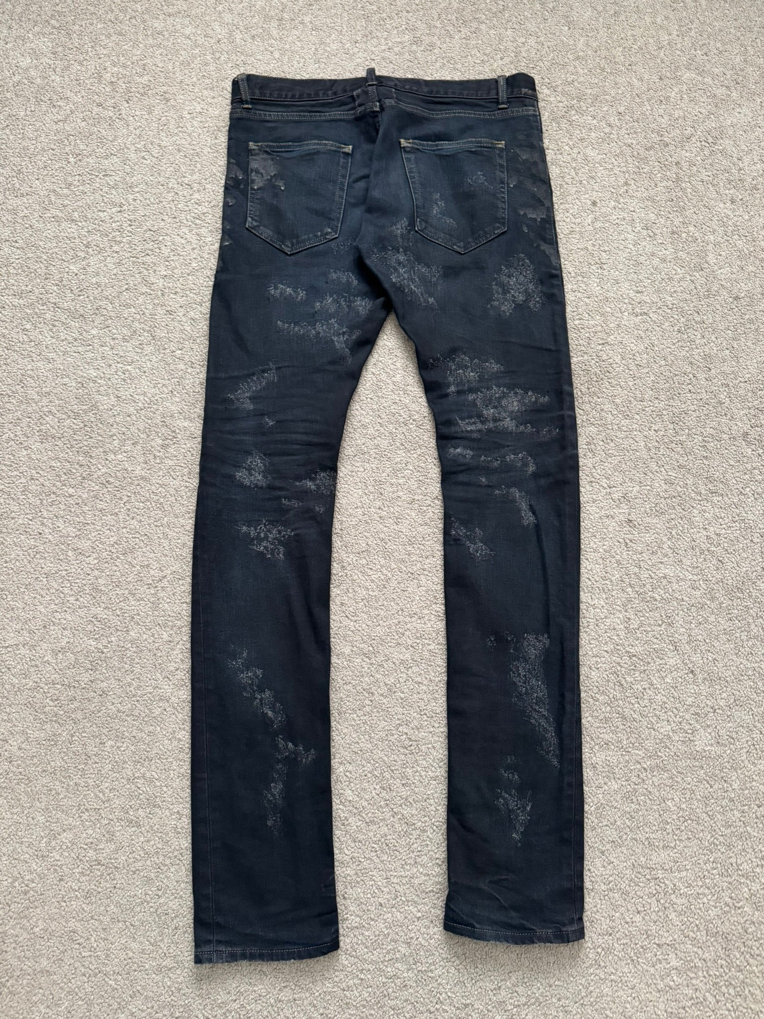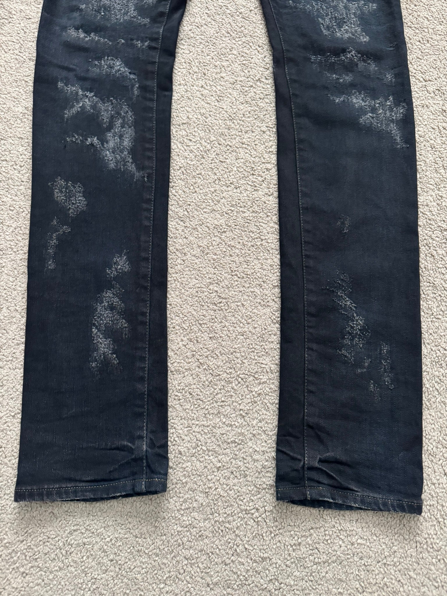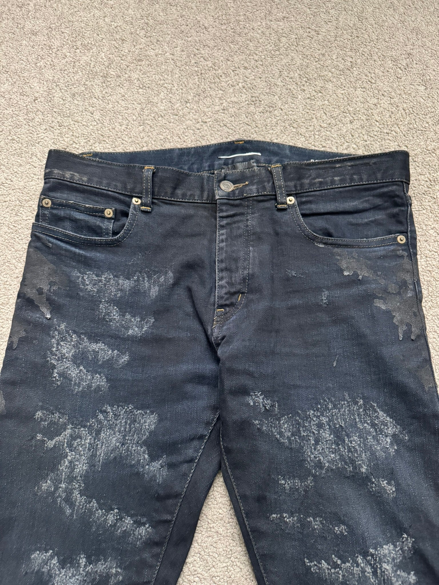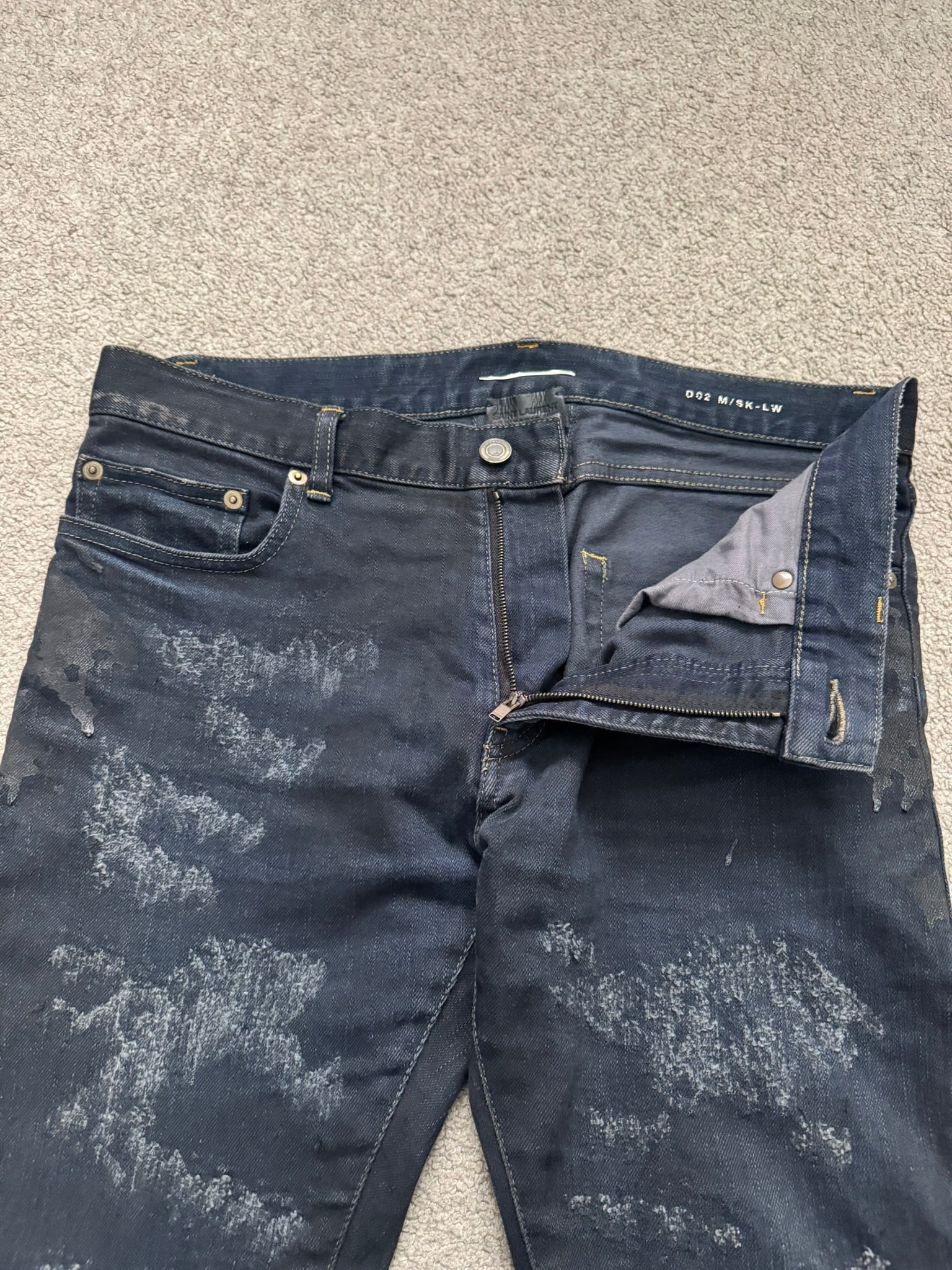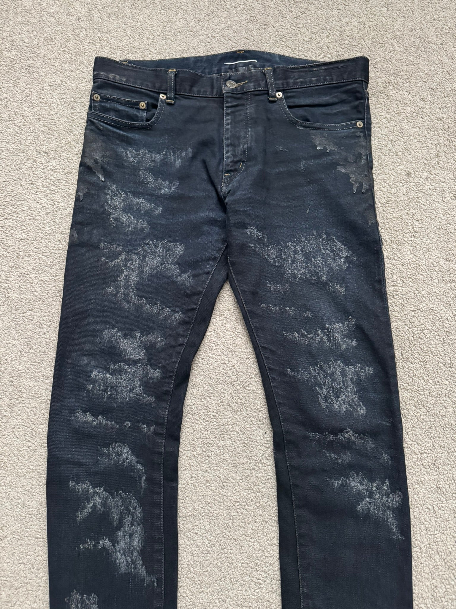 From Hedi Slimane's tenure at Saint Laurent and his FW13 collection. These black/dark navy overdyed D02 skinny stretch denim jeans feature crash style distressing with scab repairs, black paint oil stain style details throughout, a classic five pocket design, a button + zipper fly, and the inner leather tag + chain detail. As featured on the runway. In great condition, no real flaws. Made in Japan. Tagged a size 32.