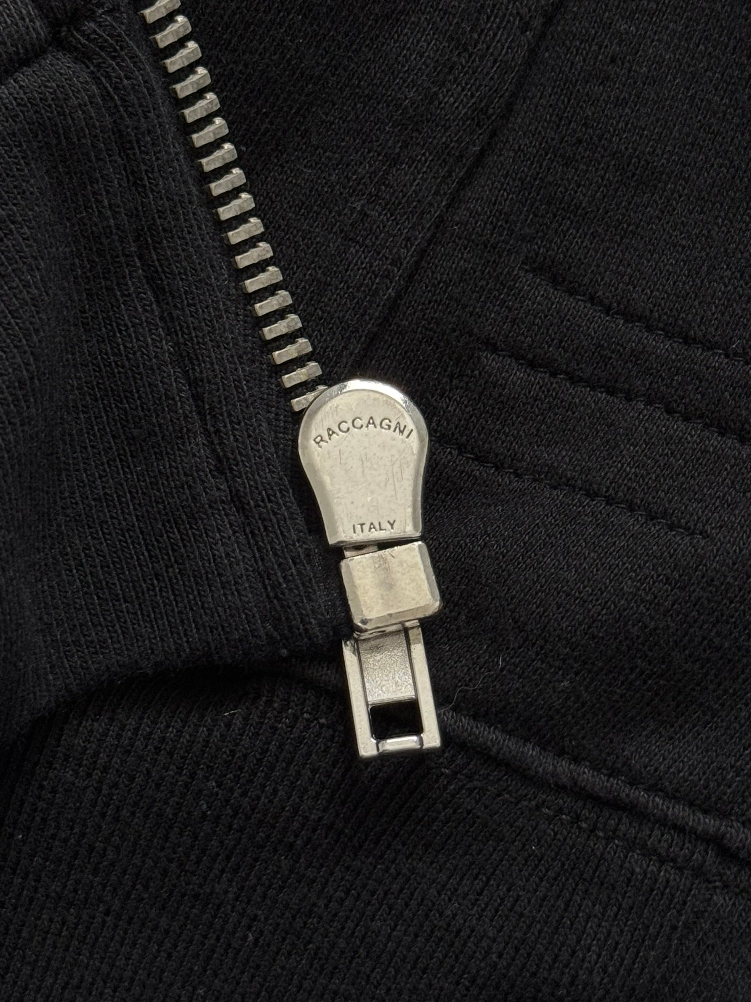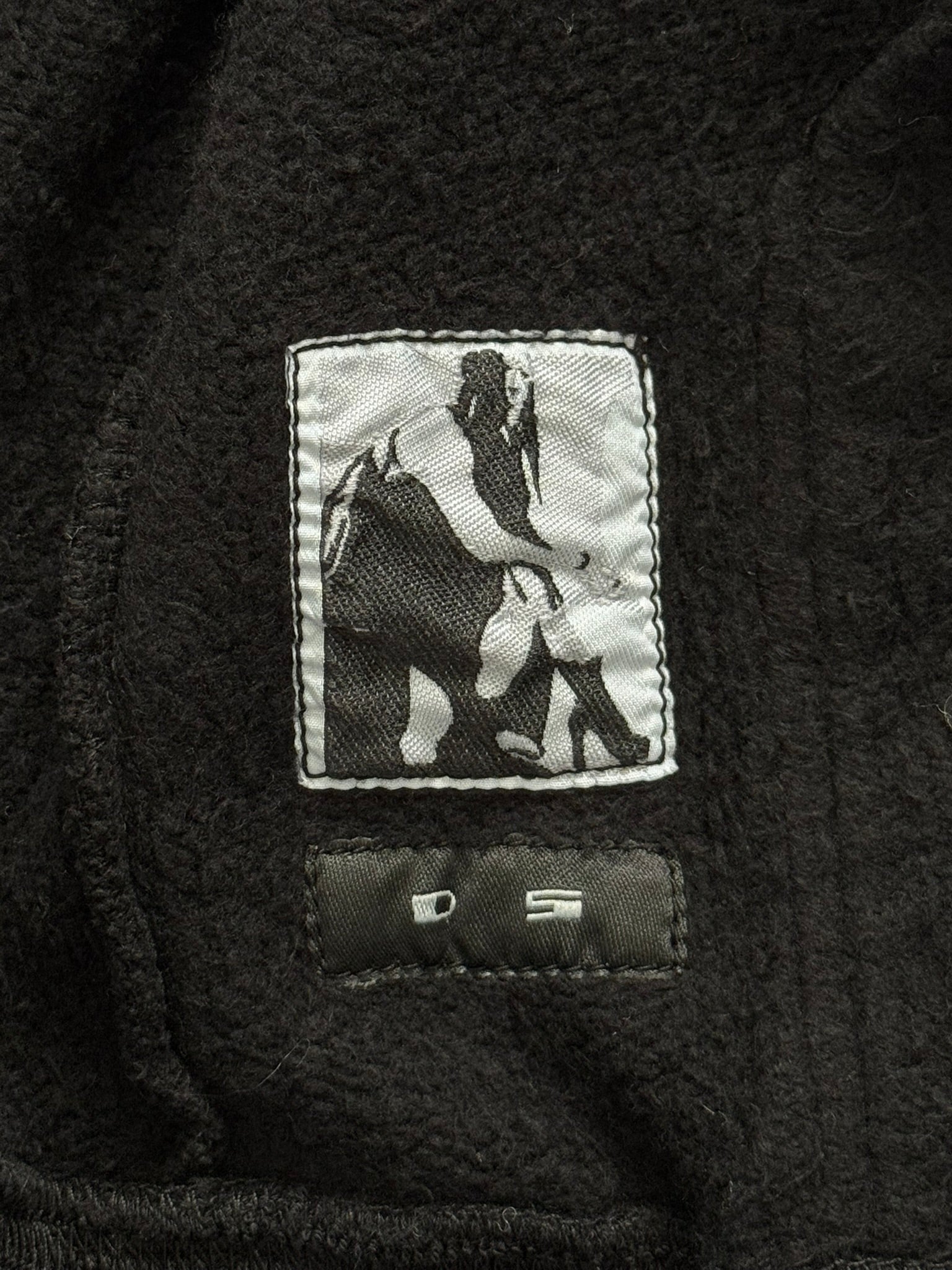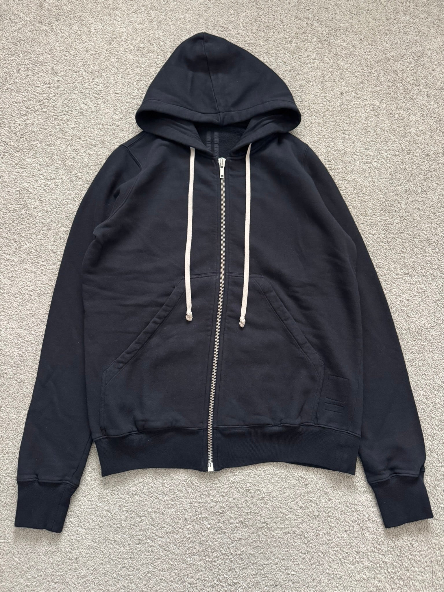 From Rick Owens's DRKSHDW line and his FW14 collection titled "Moody." This heavy jersey cotton black zip up hoodie made from their "Felpa" material in their "Jason" style features the signature elongated drawstrings at the hood, two front pockets with hidden small Velcro pockets inside, and a silver Raccagni zipper. Pretty much brand new without tags, no real flaws. Made in Italy. Tagged a size small.
