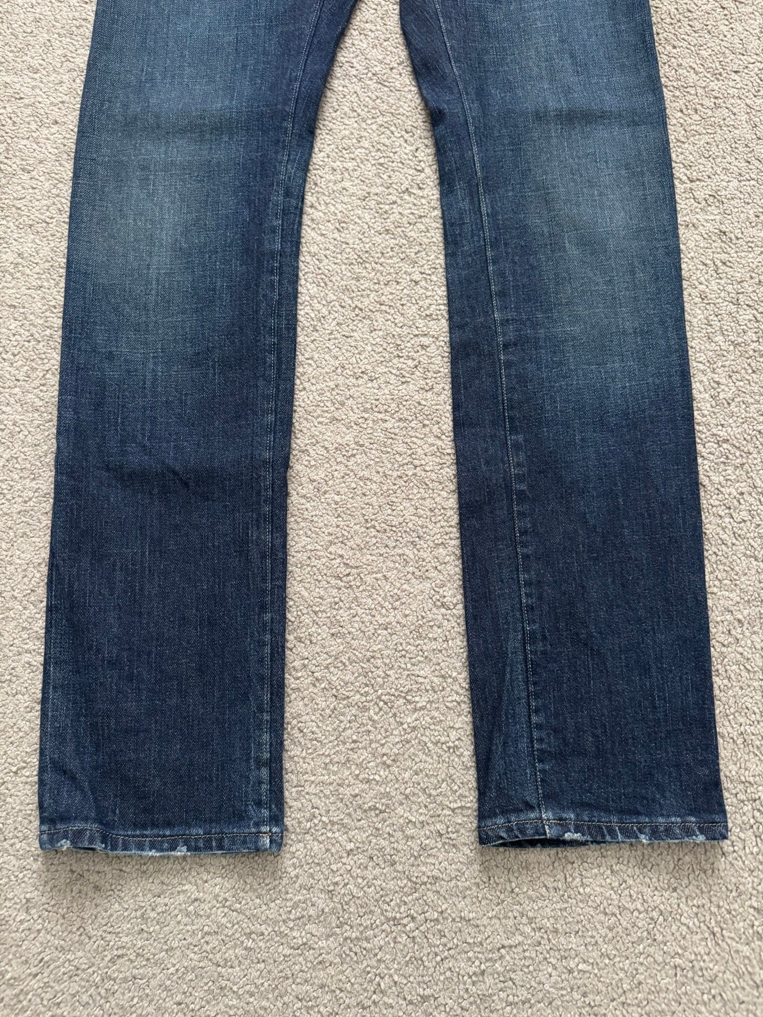 From Hedi Slimane's tenure at Saint Laurent and his FW14 collection. These medium wash skinny D02 blue denim jeans feature a classic five pocket design, a button fly, and the inner leather tag. In good condition, intentional fading throughout; no other real flaws. Made in Italy. Tagged a size 32 but fits smaller due to previous owner alterations. Fits more like a size 27-29.
