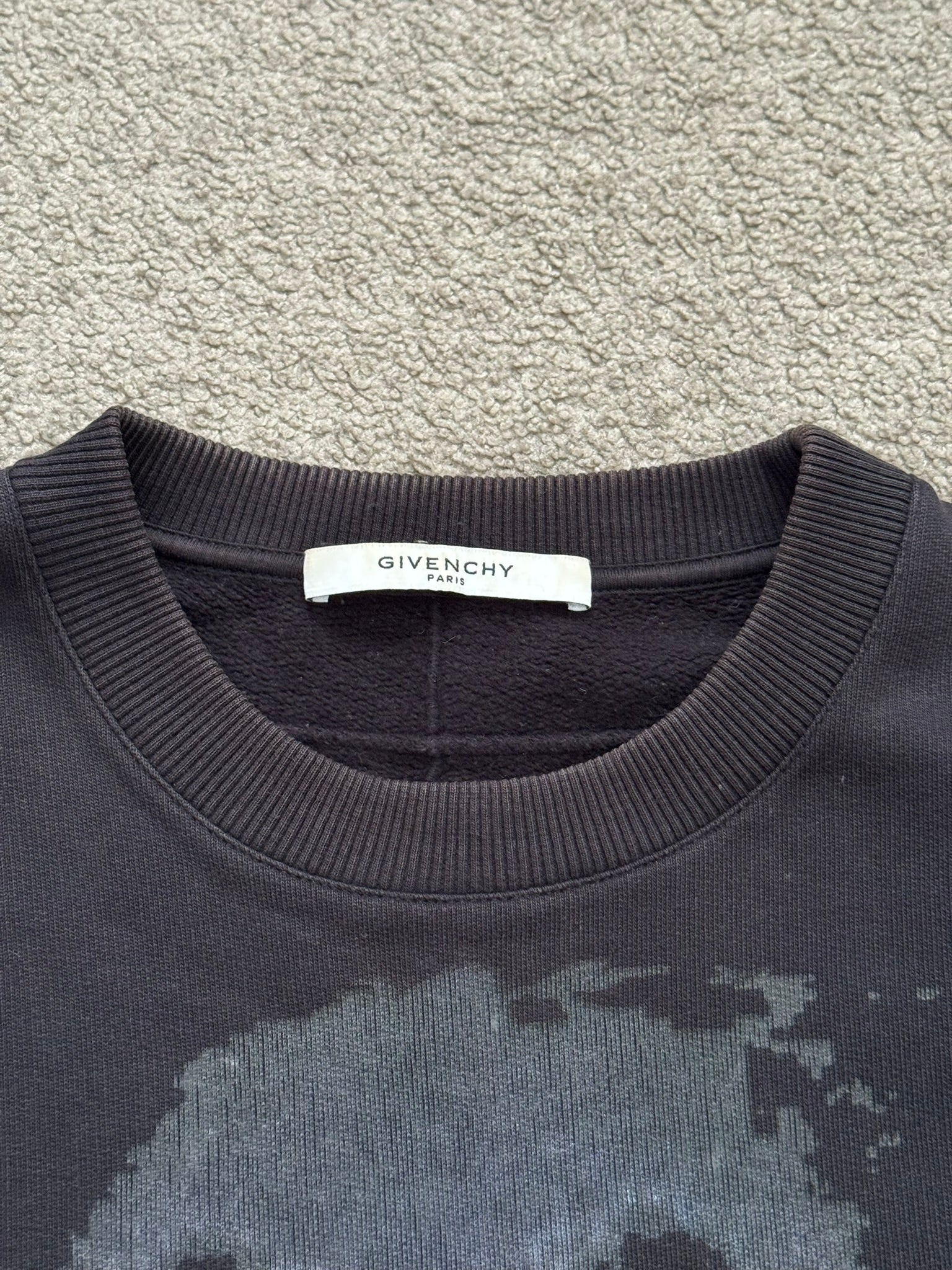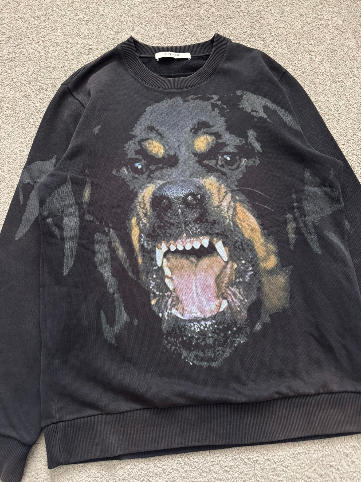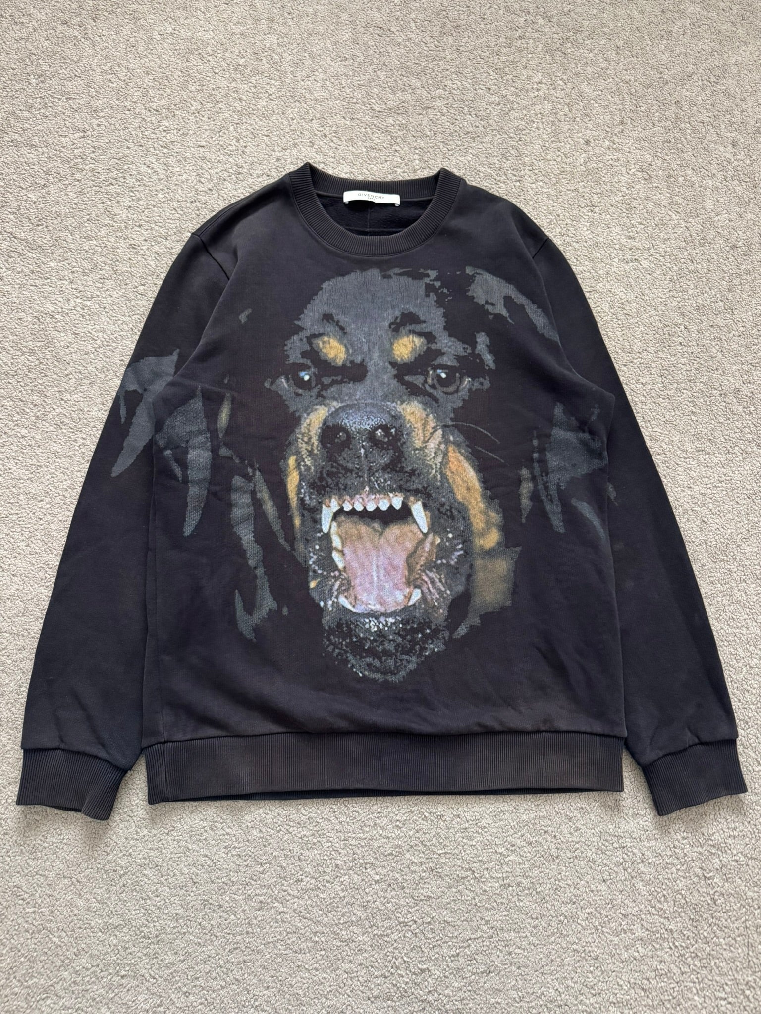 From Ricardo Tisci's tenure at Givenchy and his FW15 collection. This black cotton crewneck sweatshirt features the iconic snarling Rottweiler graphic plastered all over the front. In good condition, slight fading throughout; no other real flaws. Everything as pictured. Made in Portugal. Tagged as size small.