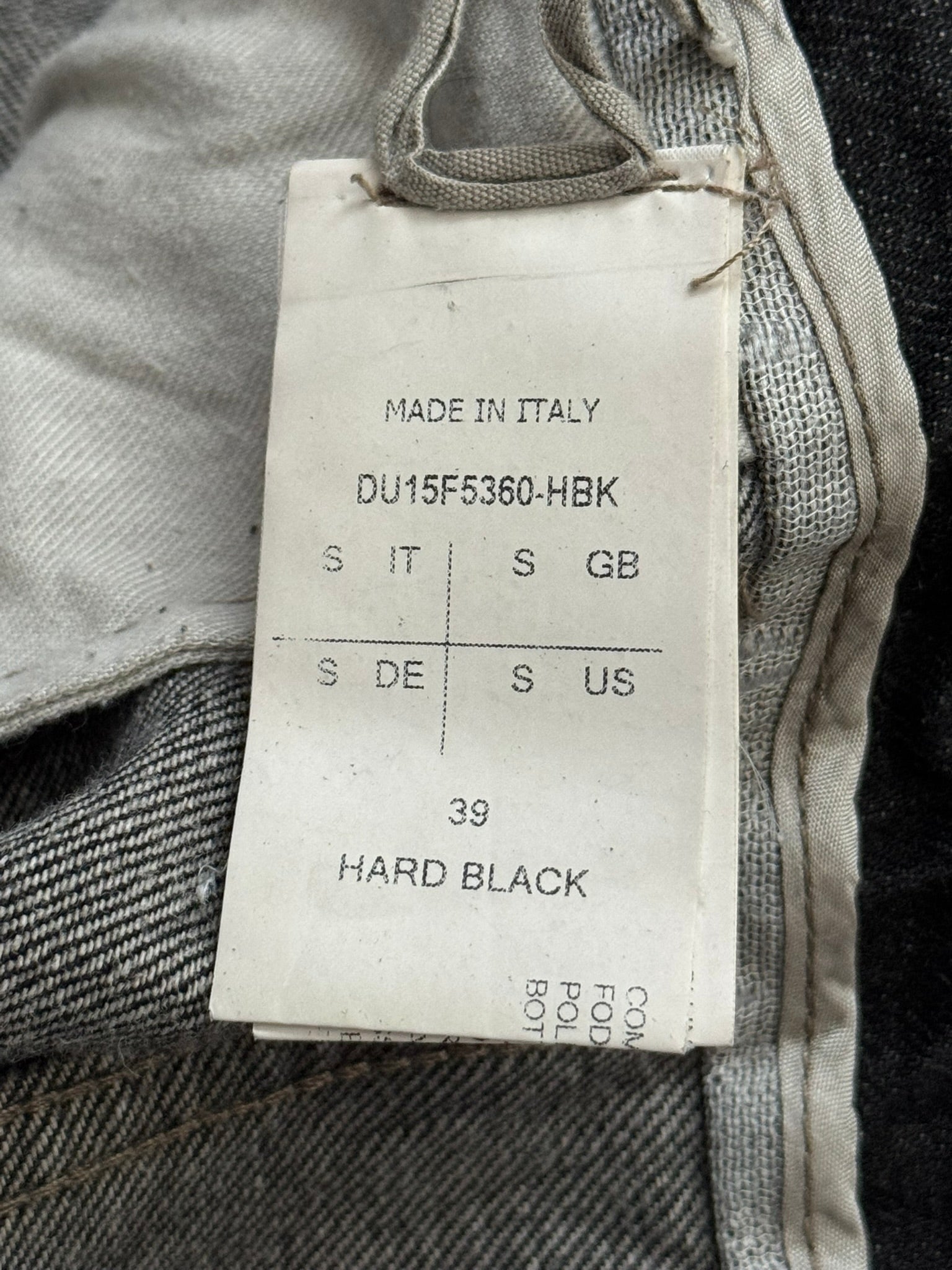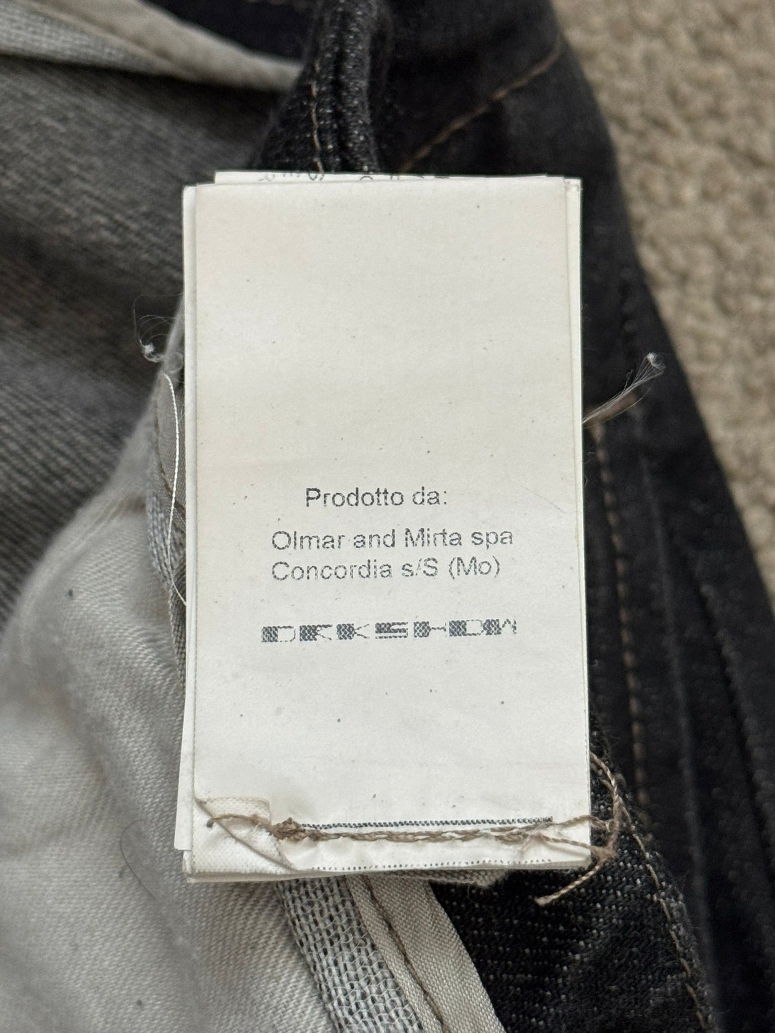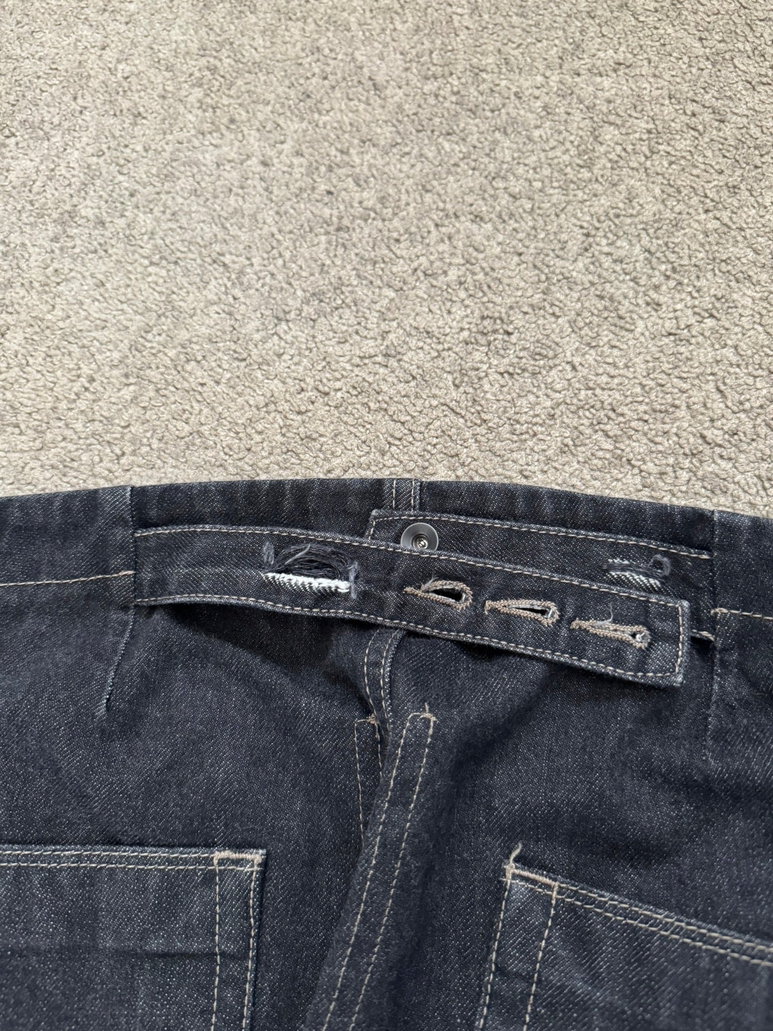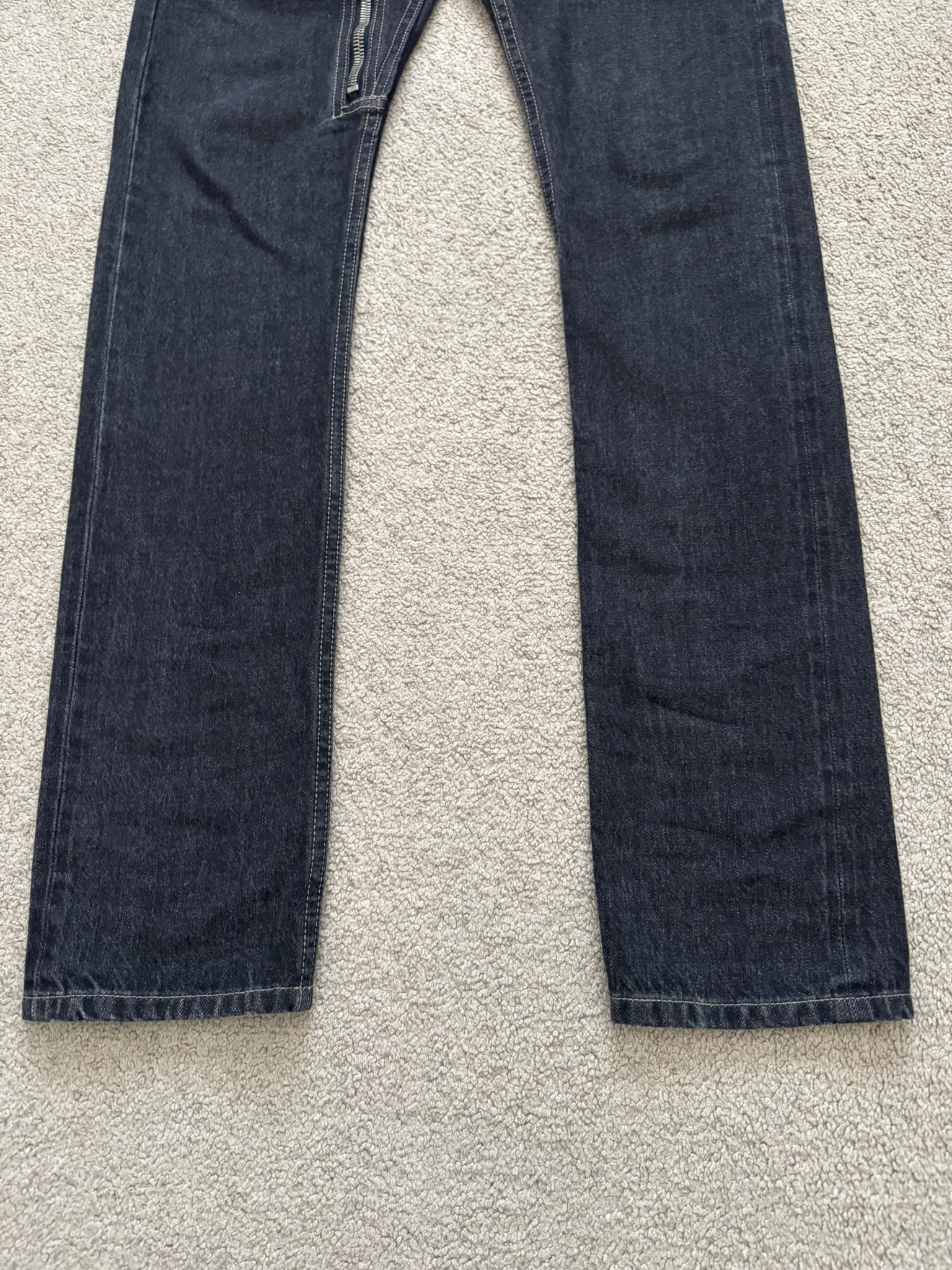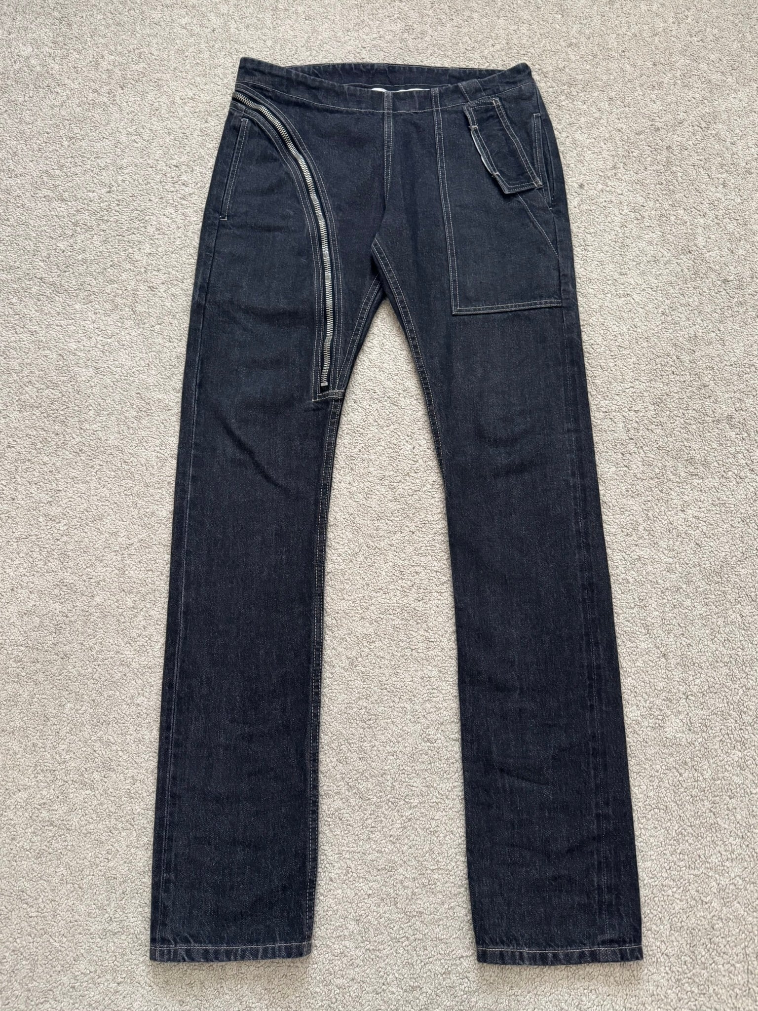 From Rick Owens’s DRKSHDW line and his FW15 collection titled "Sphinx." These 100% cotton selvedge denim jeans made in their hard black color features their famous "Aircut" Raccagni zipper flap with a back button closure, three front pockets with one having a button flap, a back button adjuster, and two back pockets. In great condition, no real flaws besides two minor tears at adjuster that previous owner added extra tightener options. Made in Italy. Tagged a size small, waist can be adjusted to various sizes.