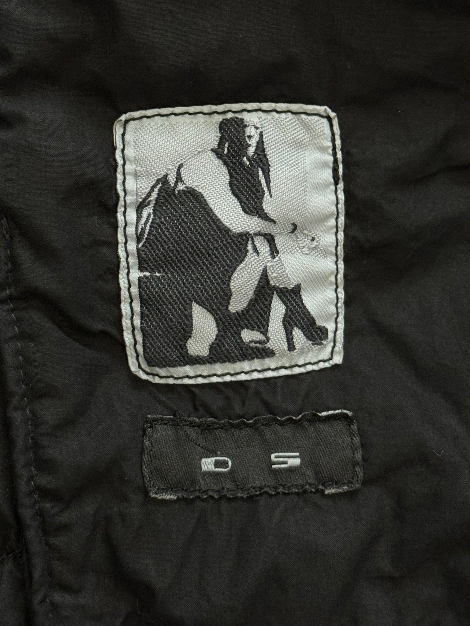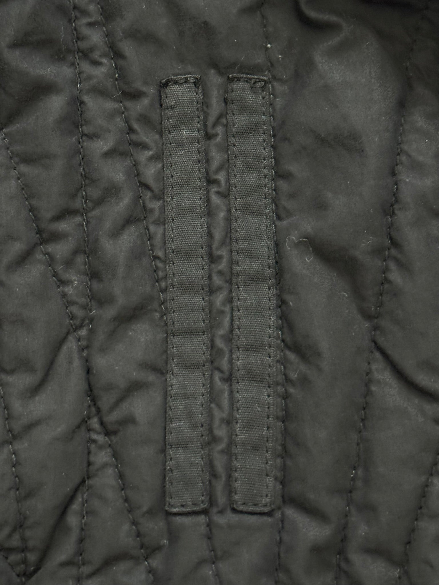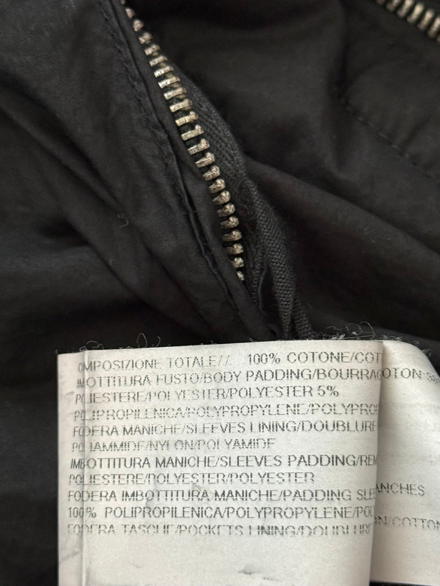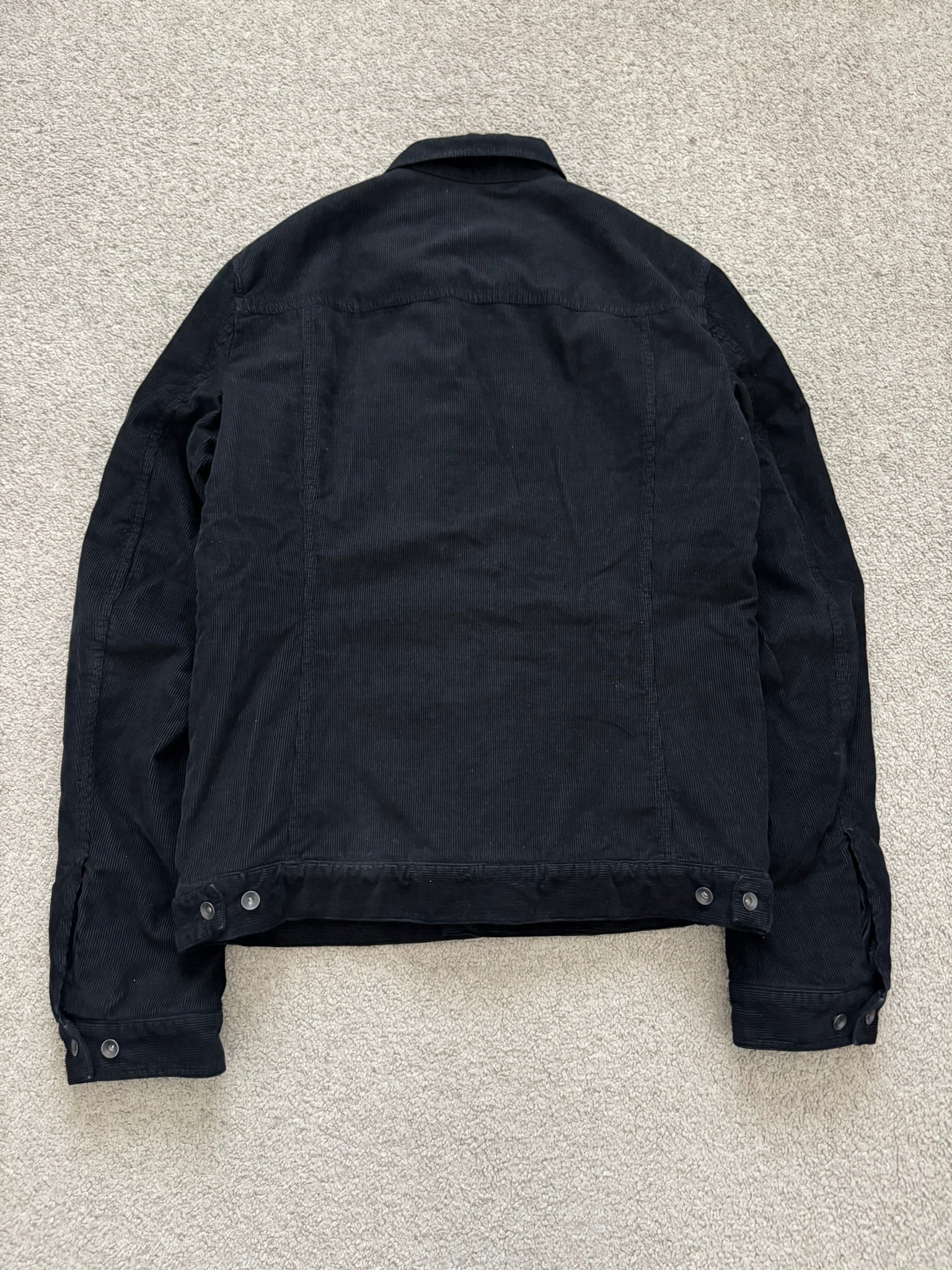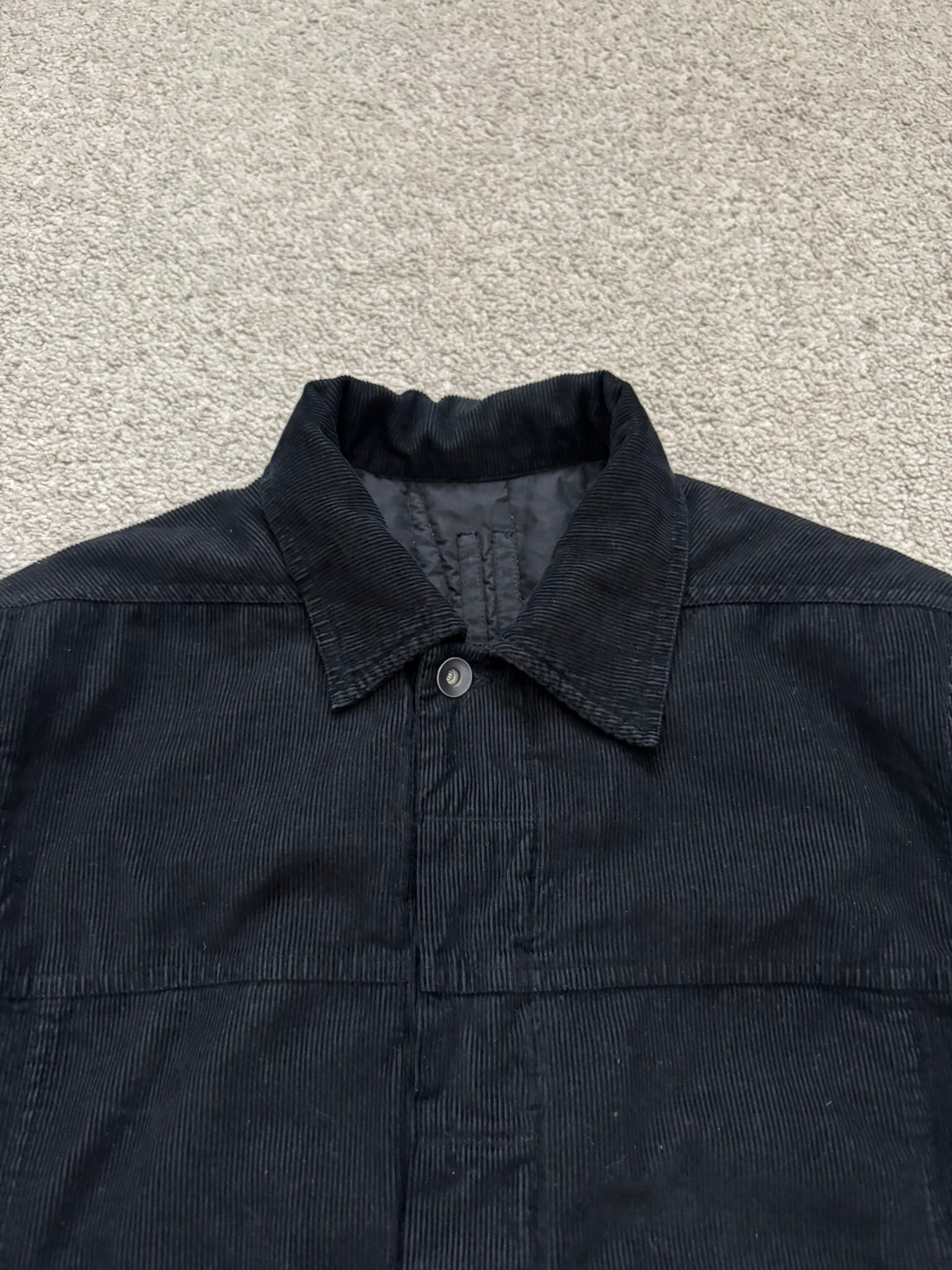 From Rick Owens's DRKSHDW line and his FW15 collection titled "Sphinx." This all black work/trucker style jacket made from a cotton corduroy outer with a warm quilted padded liner features two front pockets, two inside zipper pockets, full button closure, and button adjusters at the end of the sleeves and bottom hem. In great condition, no real flaws. Made in Italy. Tagged a size medium.