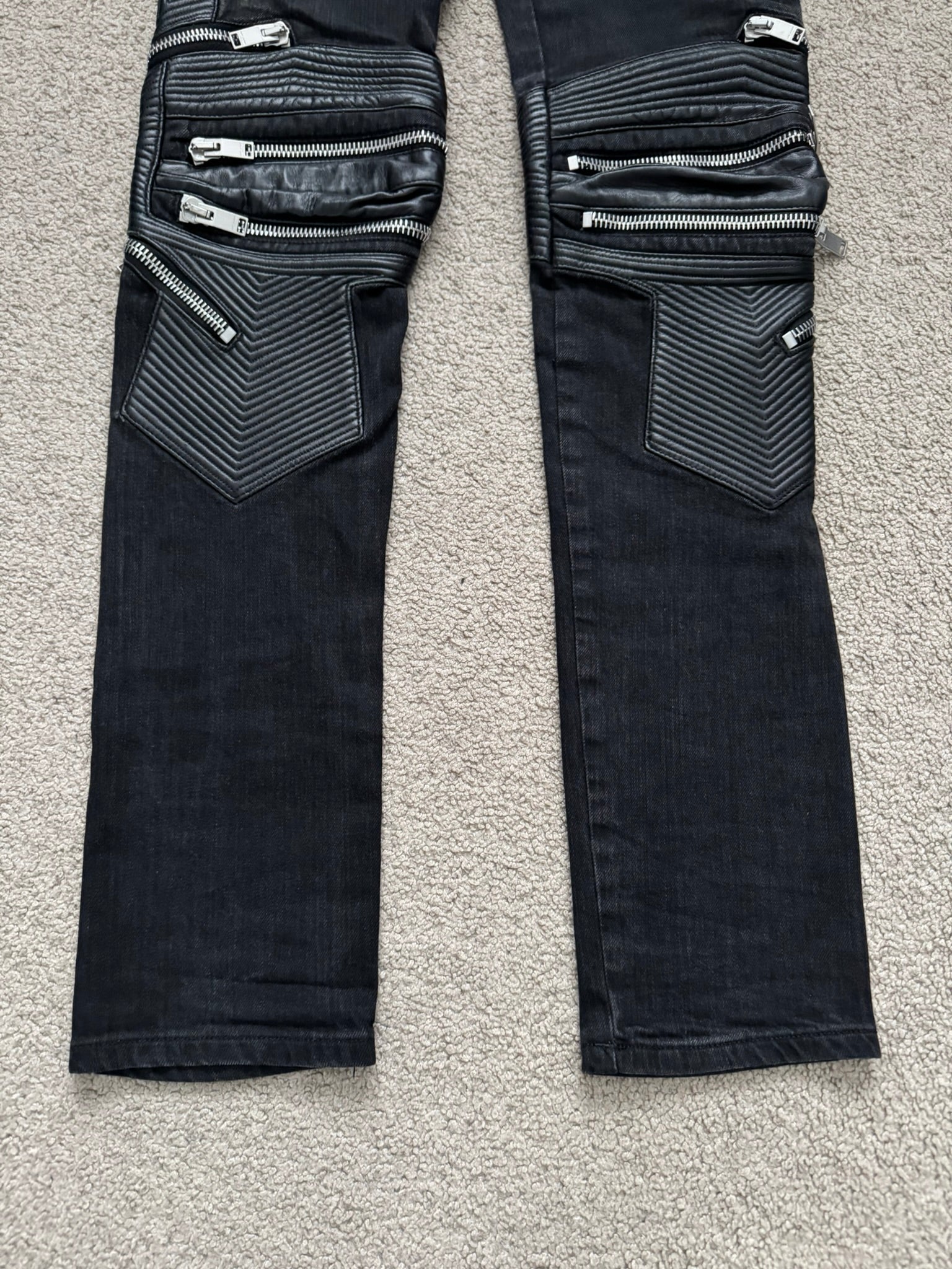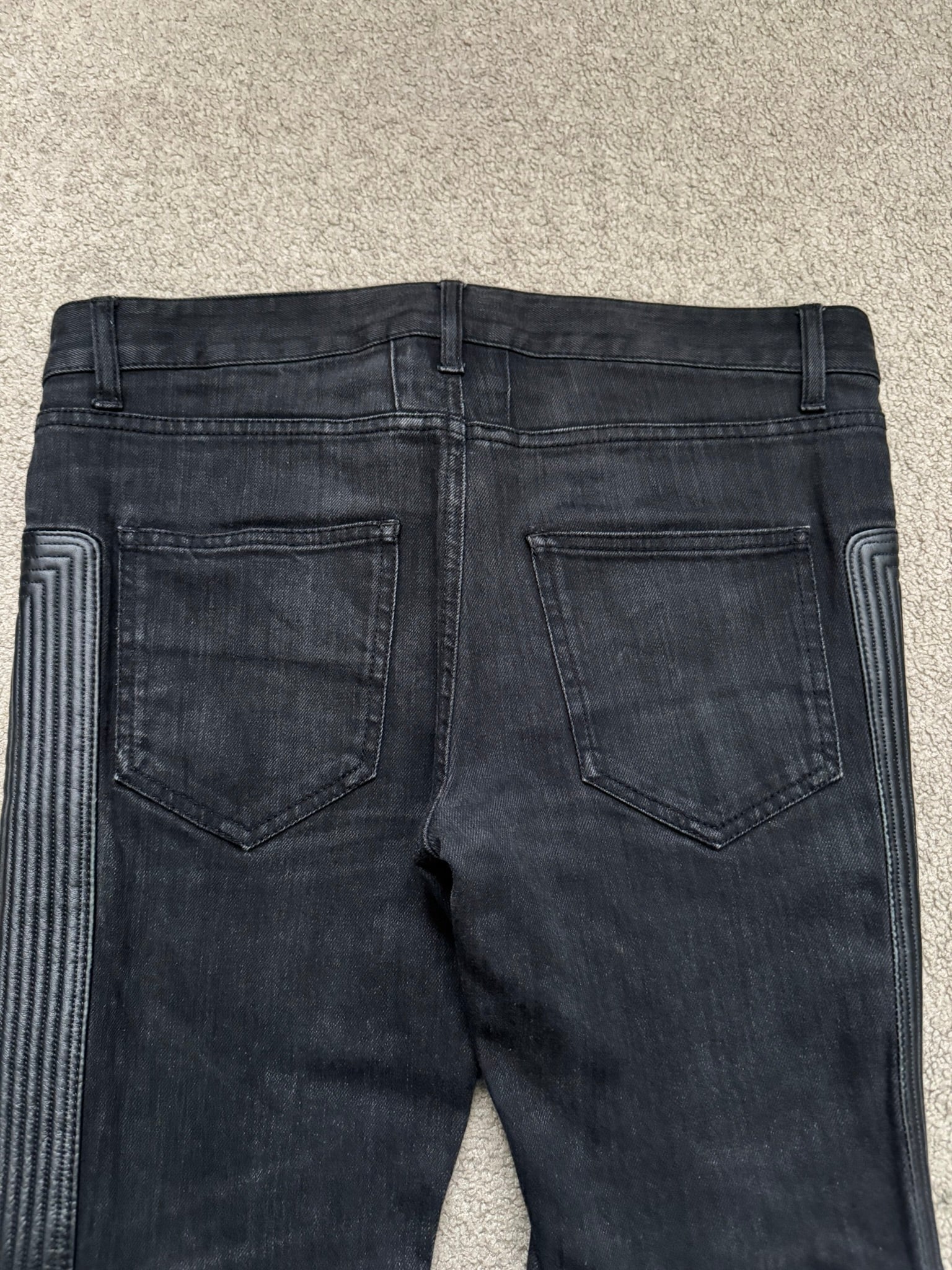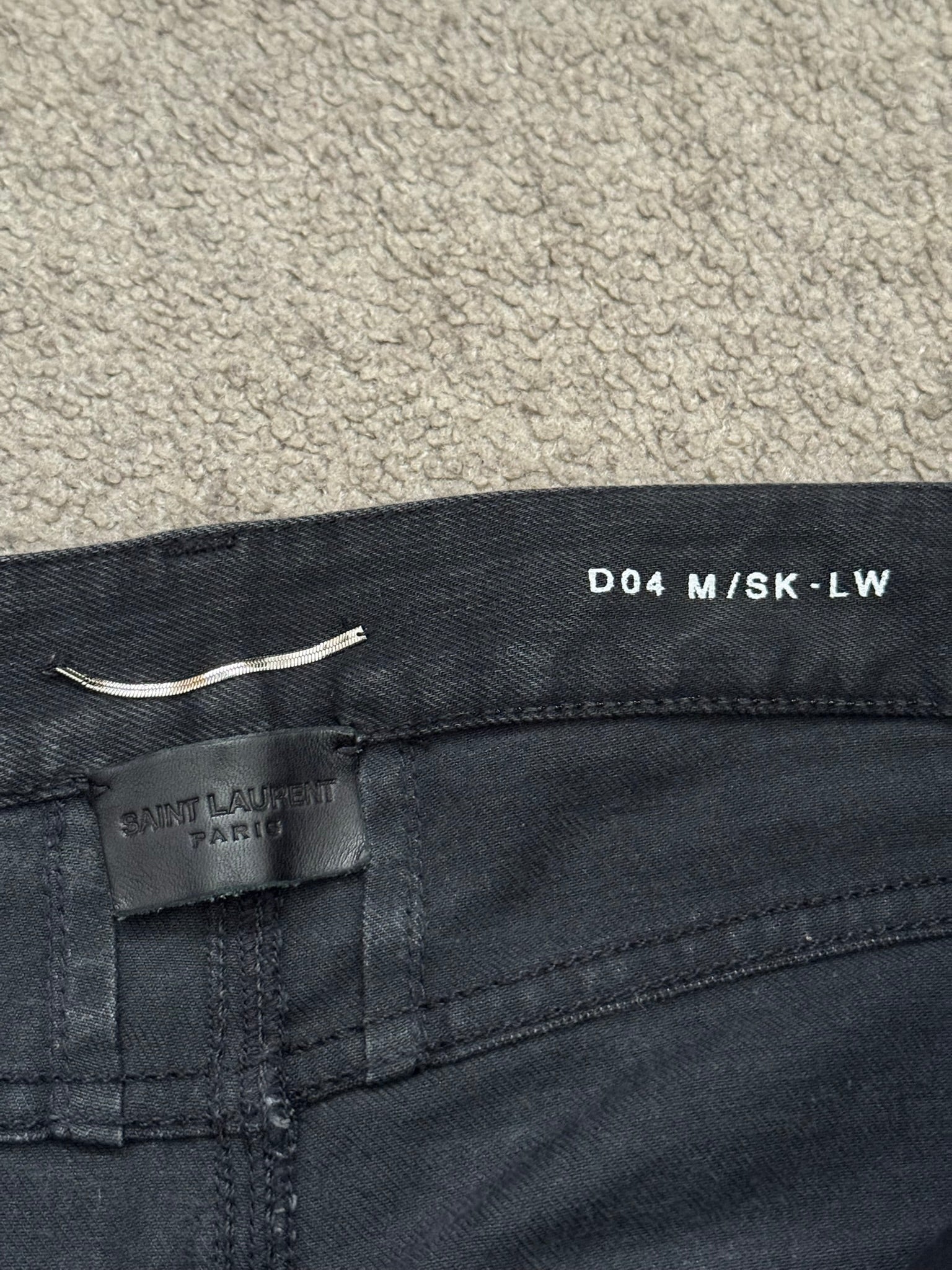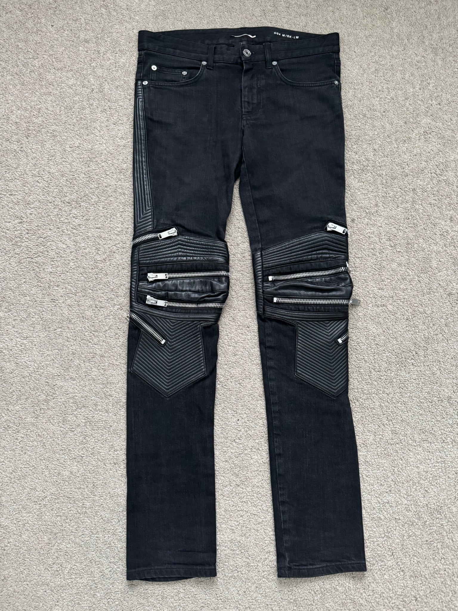 From Hedi Slimane's tenure at Saint Laurent and his FW15 collection. These black D04 skinny denim jeans feature leather paneling on the sides, paneled leather knees with engraved zipper pulls that can be opened to show skin, five pocket design, a button + zipper fly, and the inner leather tag detail. In great condition, no real flaws. Made in Italy. Tagged a size 30.