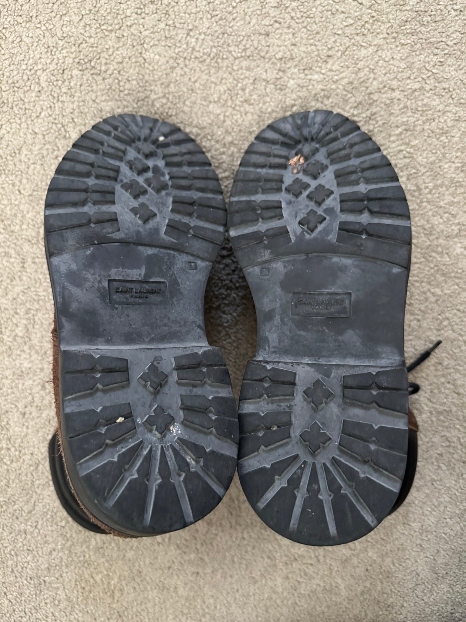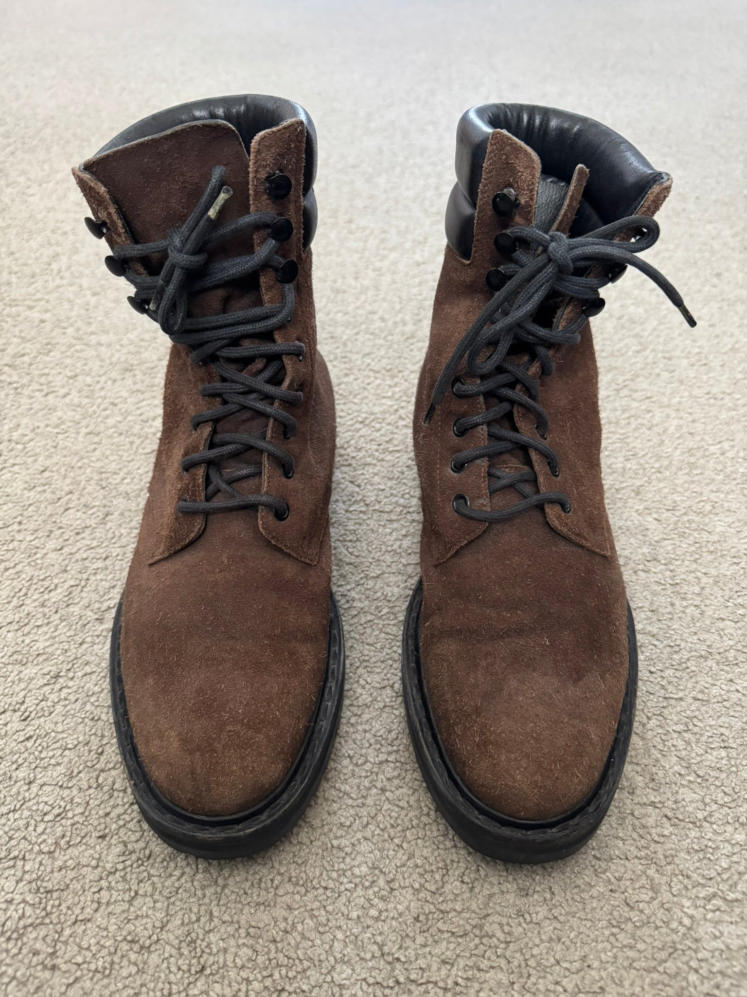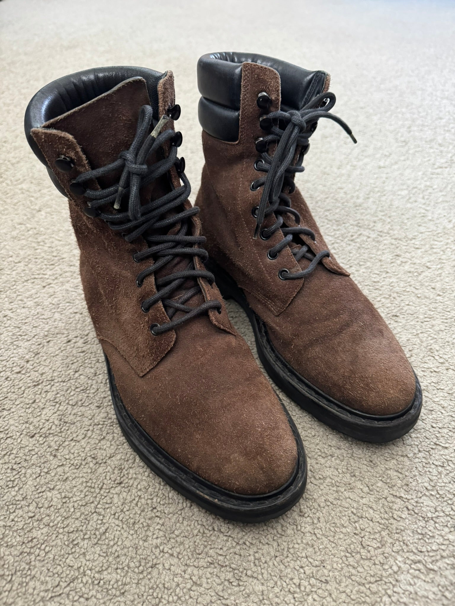 From Hedi Slimane's tenure at Saint Laurent and his FW15 collection. These combat/army boots in their "Ranger" style feature a durable brown suede outer, a black leather padded collar, black woven laces, and a lug sole. Originally retailed for 995 USD. In good condition with scuffs, marks, and wear throughout; no other real flaws. Everything as pictured. No box. Made in Italy. Tagged as size 41, fits around a U.S. size 8-8.5.