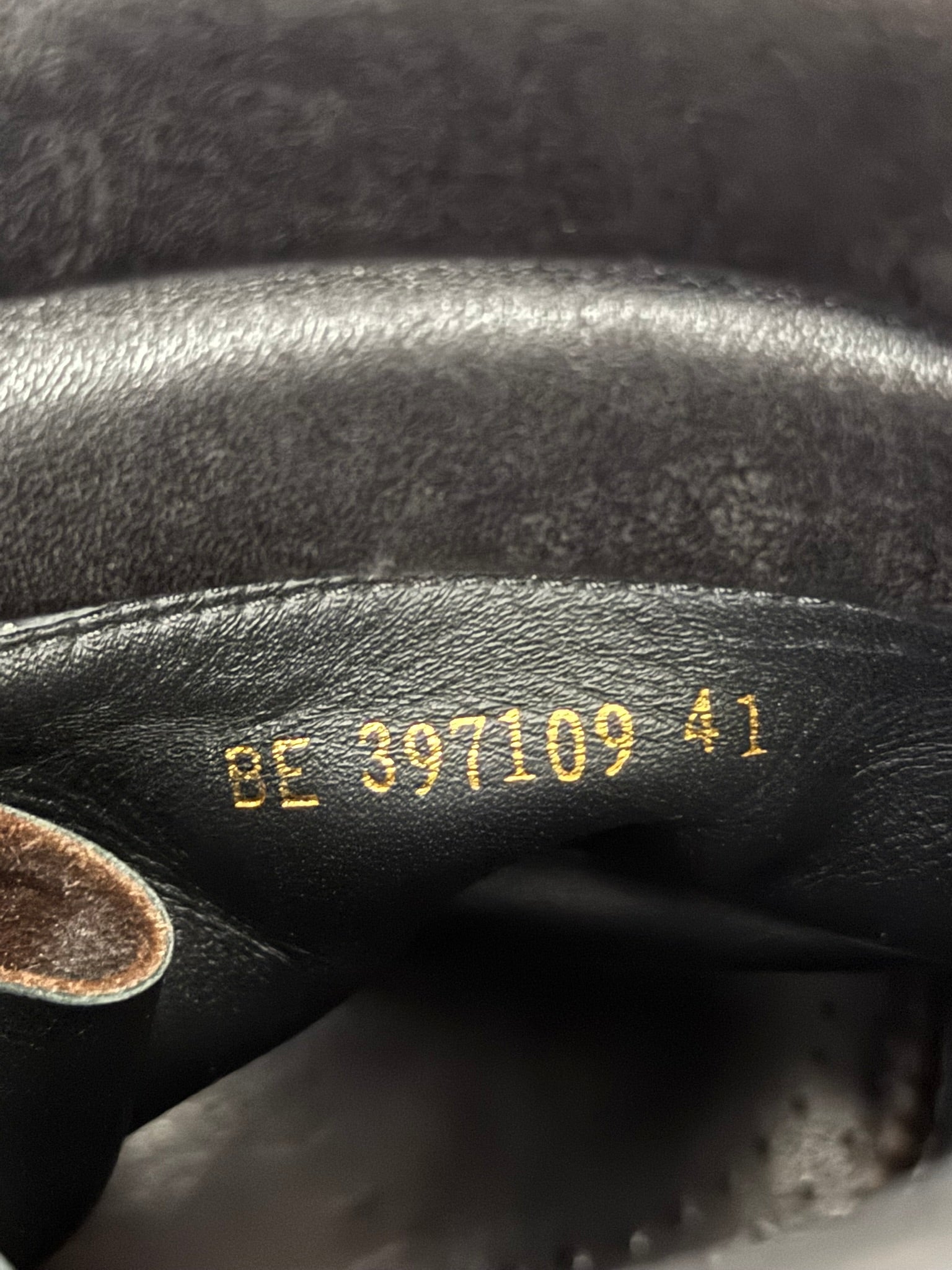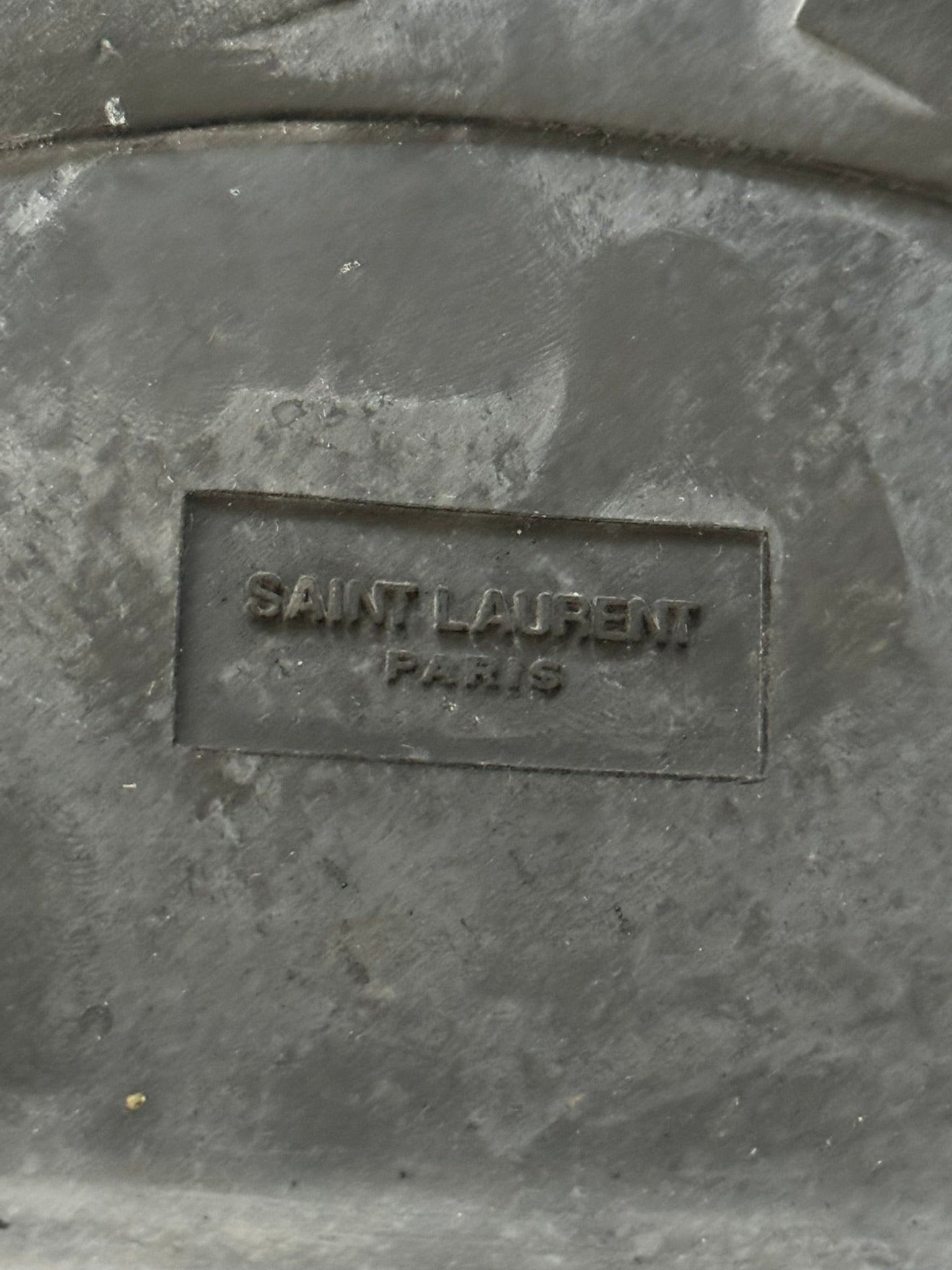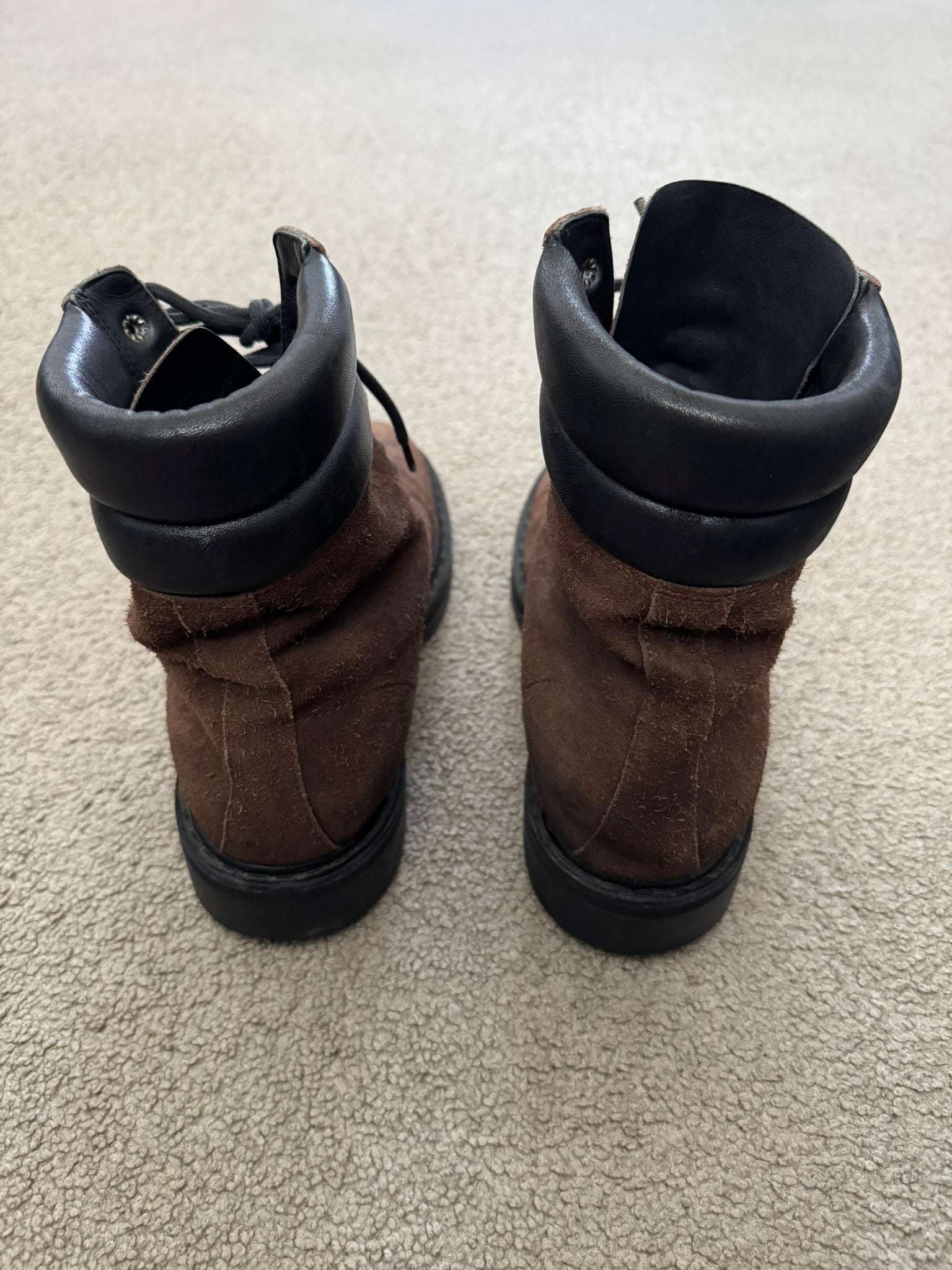 From Hedi Slimane's tenure at Saint Laurent and his FW15 collection. These combat/army boots in their "Ranger" style feature a durable brown suede outer, a black leather padded collar, black woven laces, and a lug sole. Originally retailed for 995 USD. In good condition with scuffs, marks, and wear throughout; no other real flaws. Everything as pictured. No box. Made in Italy. Tagged as size 41, fits around a U.S. size 8-8.5.