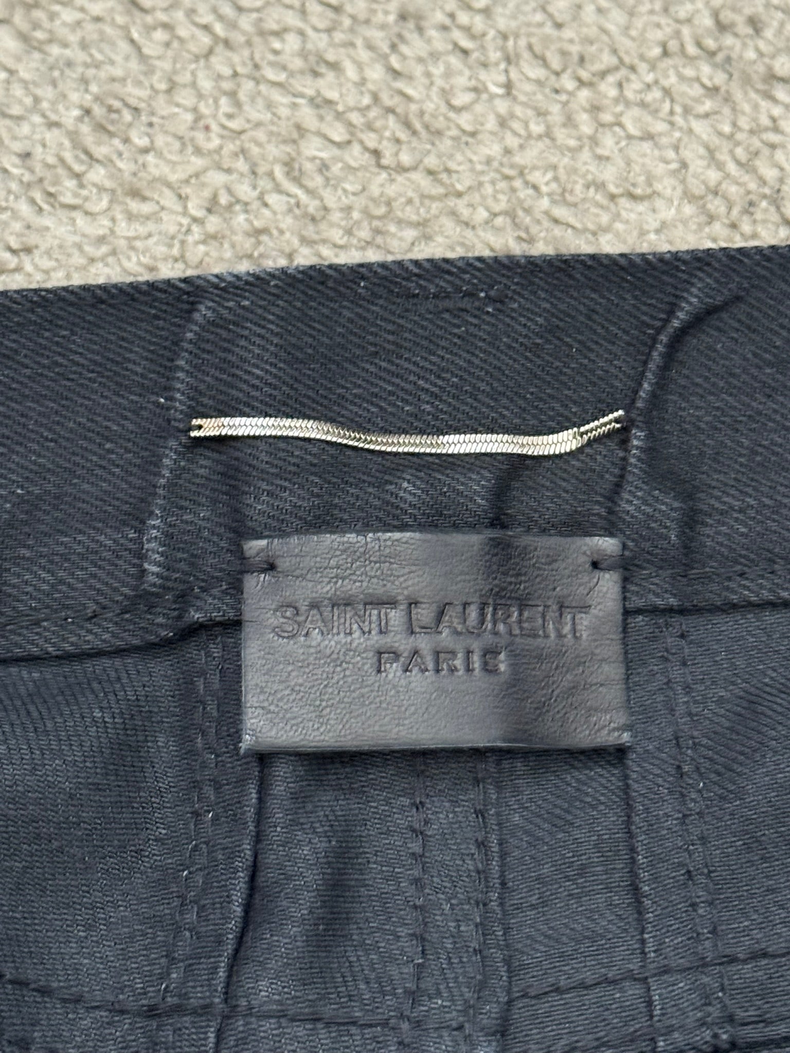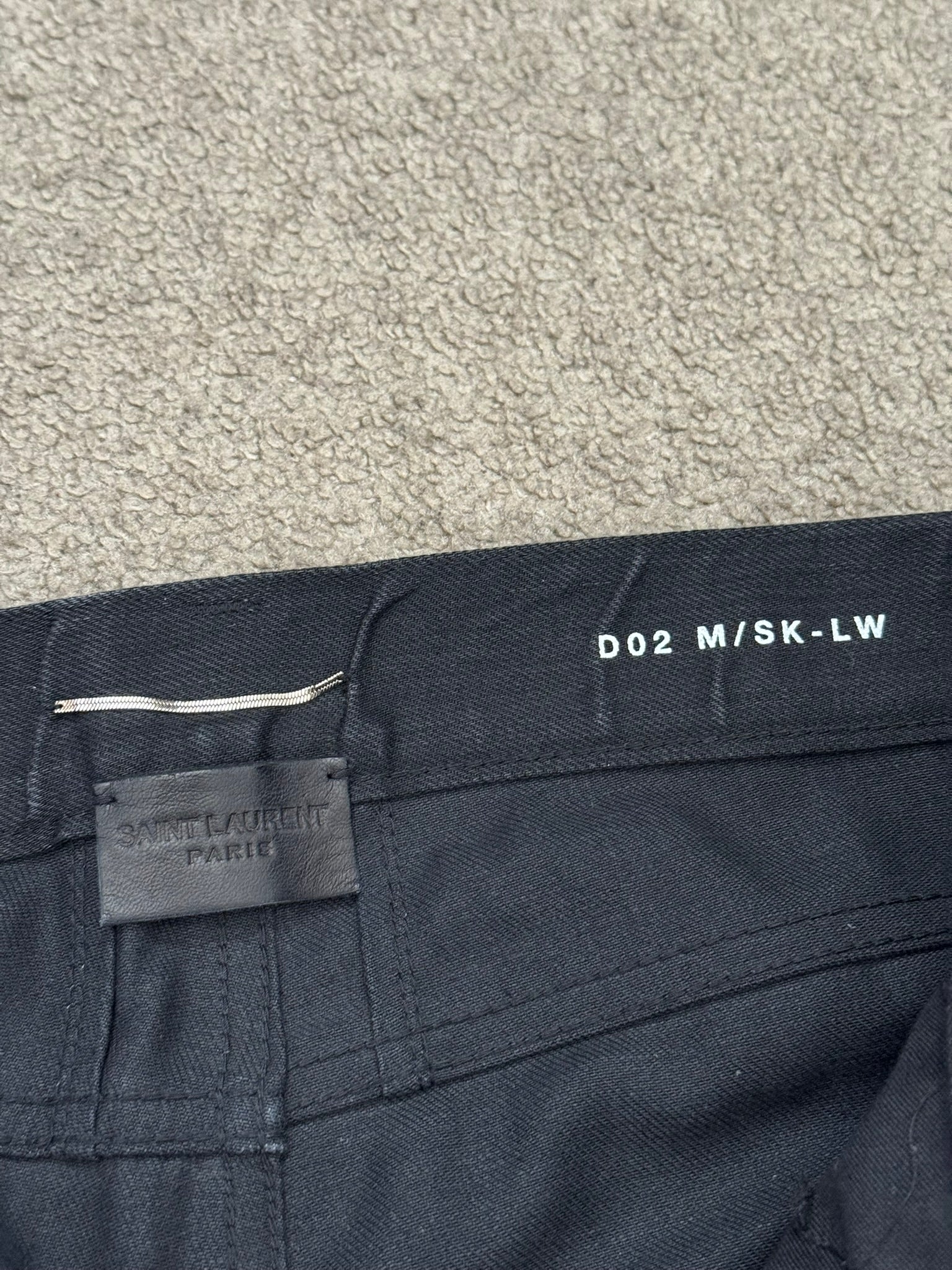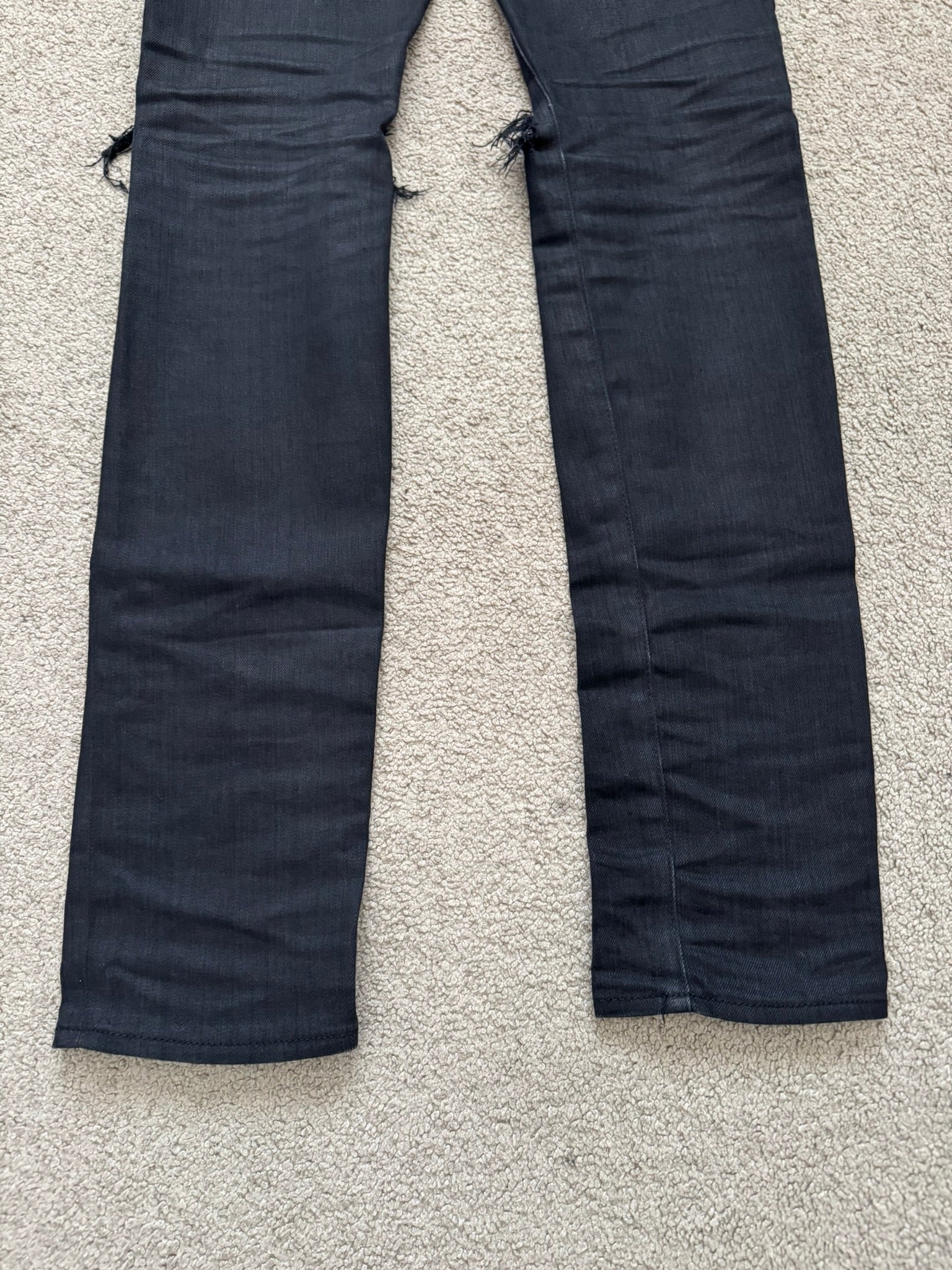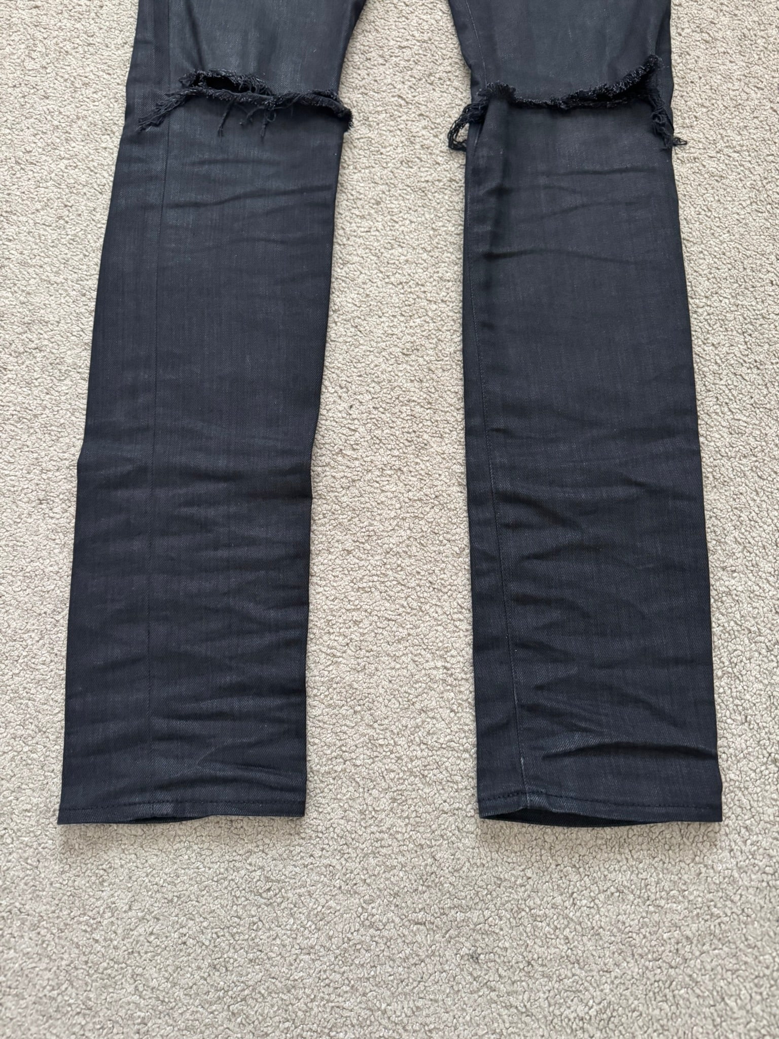 From Hedi Slimane's tenure at Saint Laurent and his FW15 collection. These black D02 skinny stretch denim jeans feature a light wax coating throughout, distressed knee slit holes, classic five pocket design, and a button + zipper fly. In great condition, no real flaws. Full length, has not been hemmed. Made in Japan. Tagged a size 28.