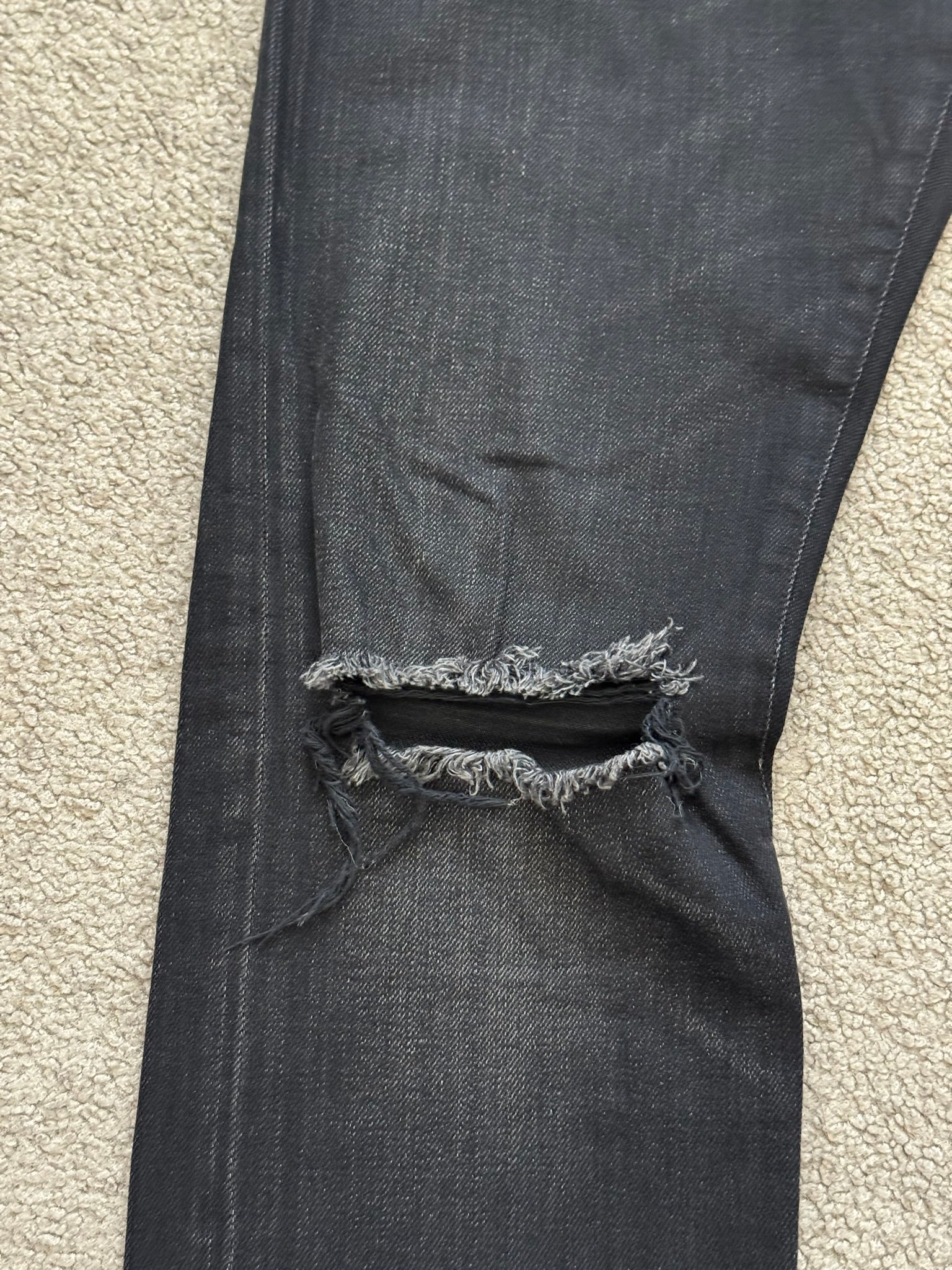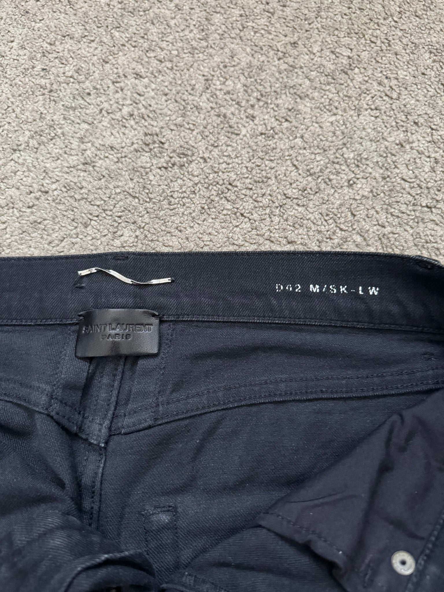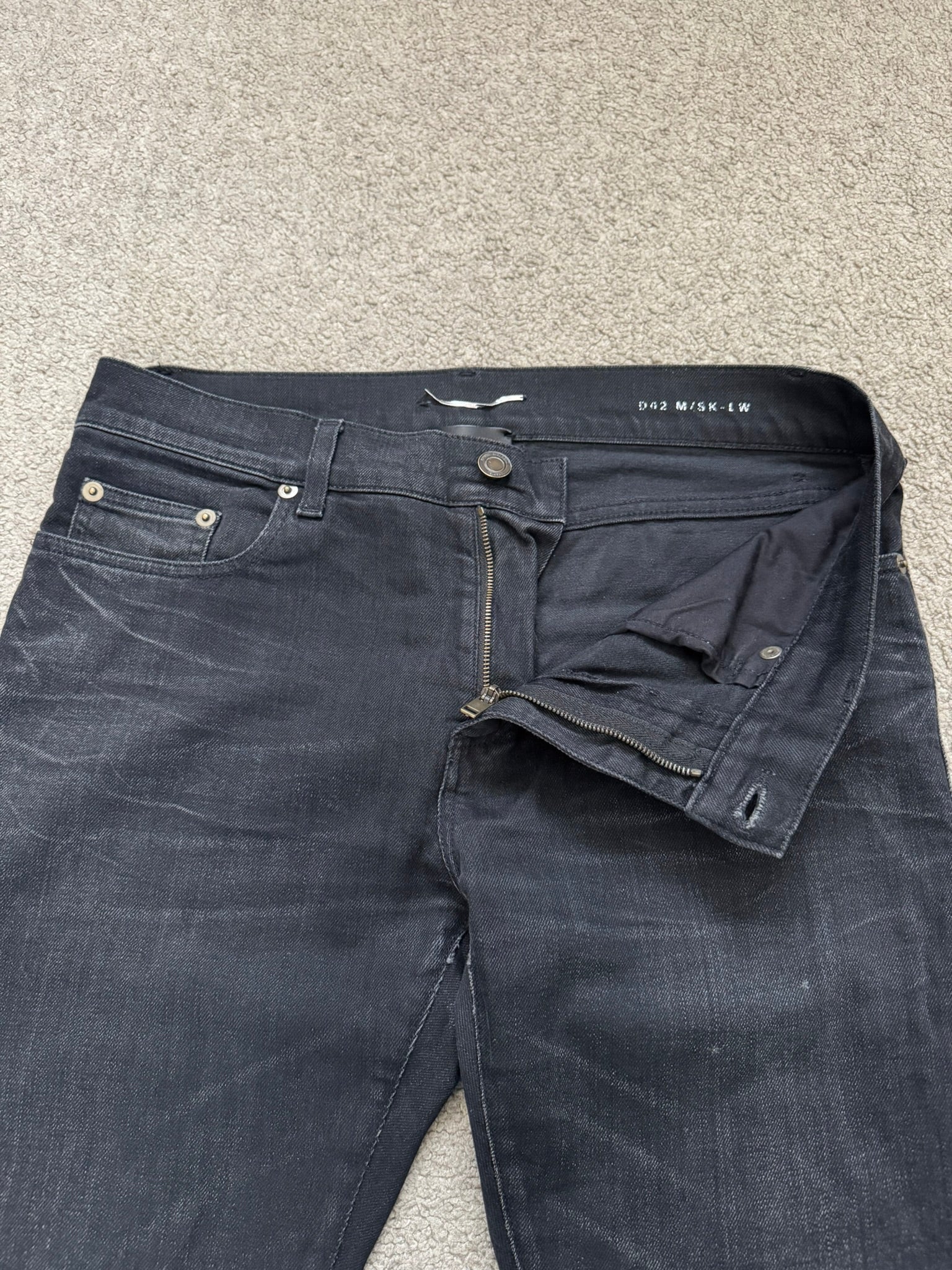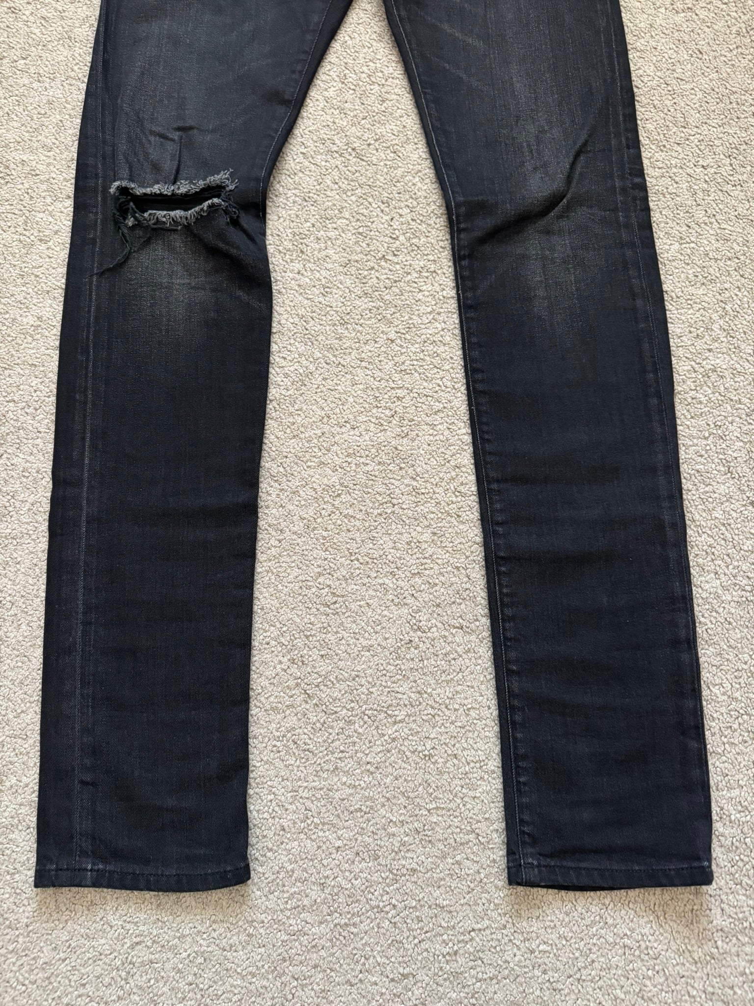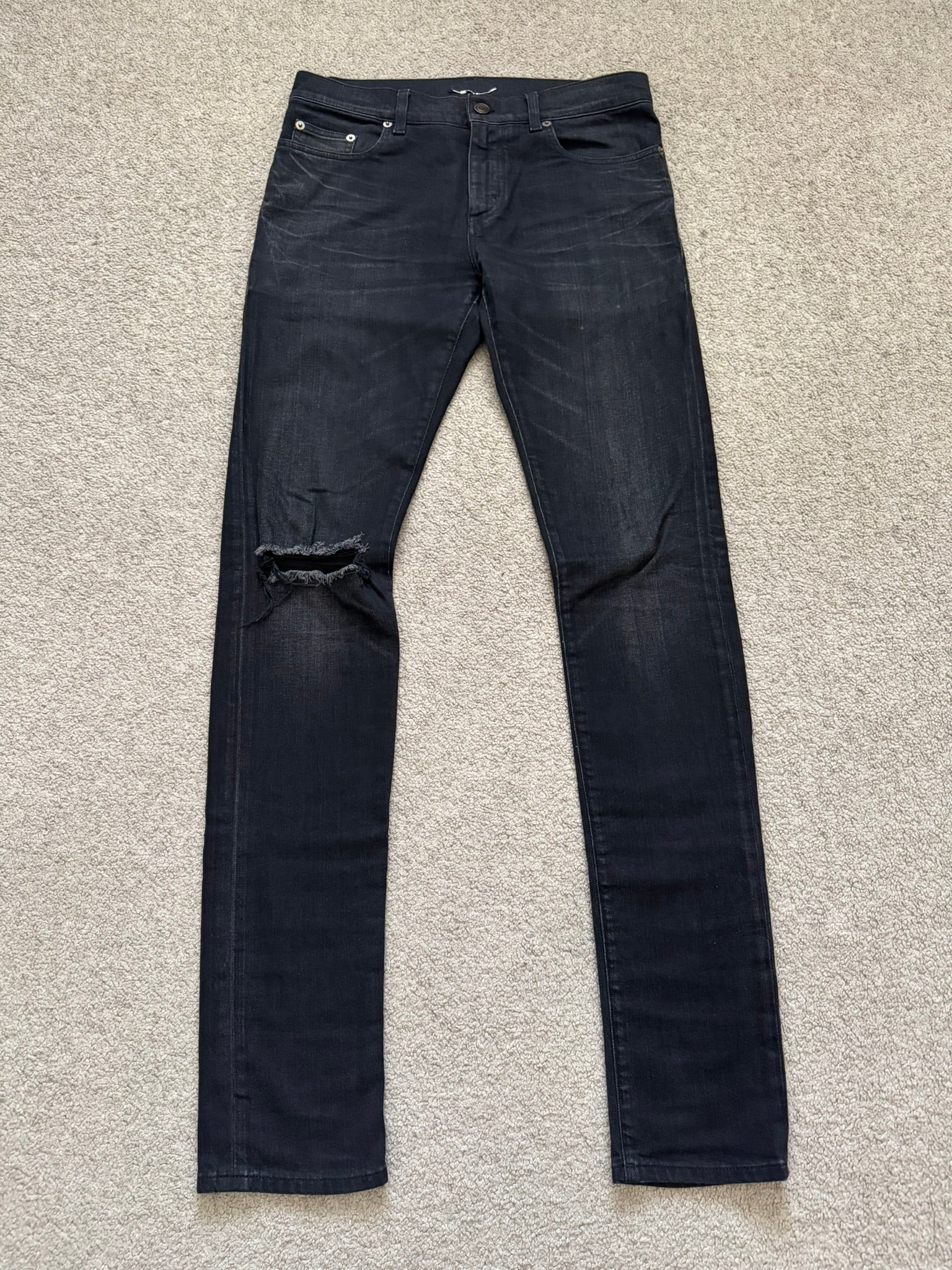 From Hedi Slimane's tenure at Saint Laurent and his FW16 collection. These black D02 skinny stretch denim jeans feature one distressed knee slit hole, a classic five pocket design, a button + zipper fly, and the inner leather tag + chain detail. In great condition, no real flaws. Made in Italy. Tagged a size 28.