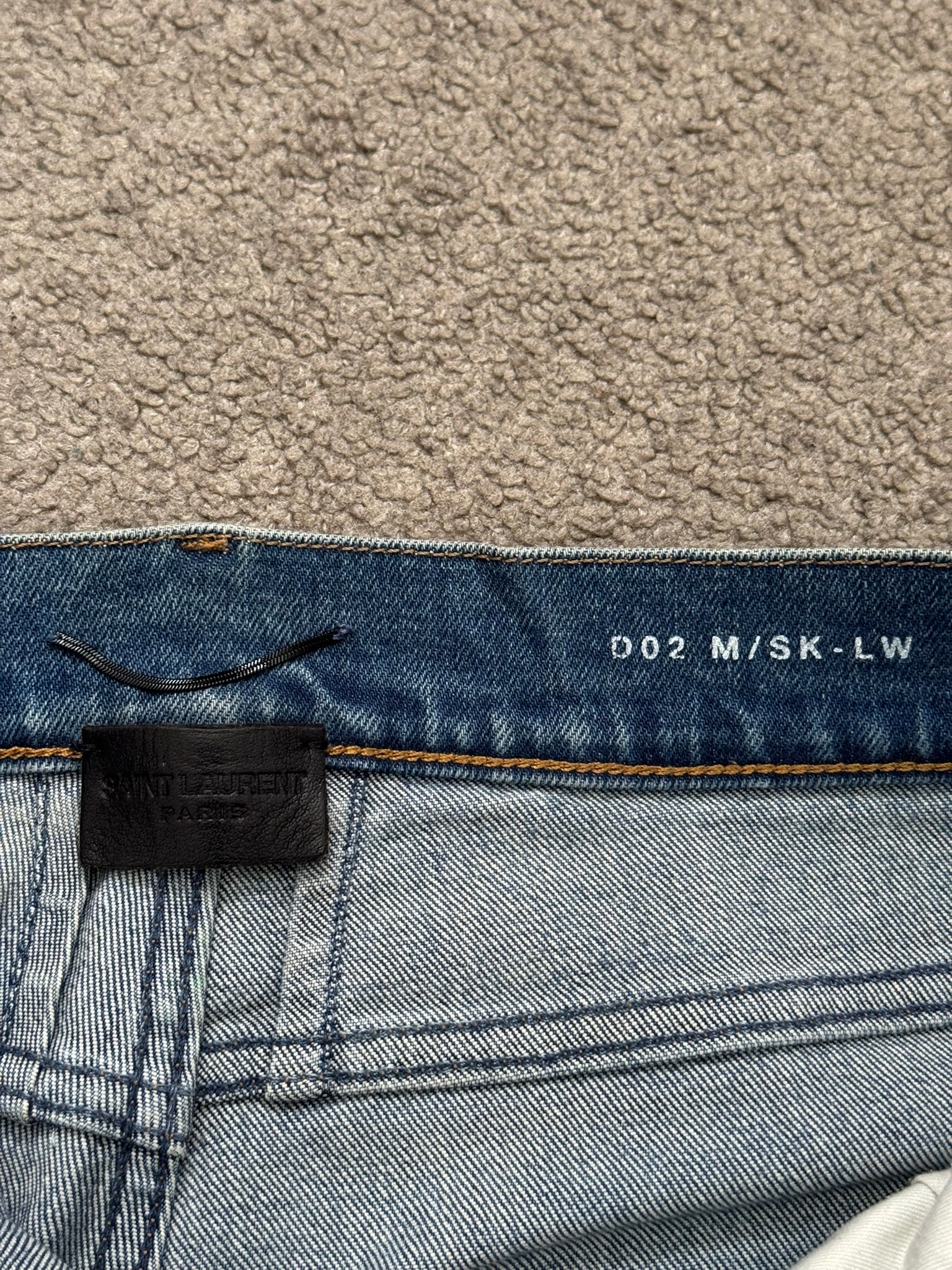 From Hedi Slimane's tenure at Saint Laurent and his FW16 collection. These faded washed blue D02 skinny stretch denim jeans feature a classic five pocket design, a button fly, and the inner leather tag + chain detail. In great condition; no real flaws. Made in Italy. Tagged a size 29.