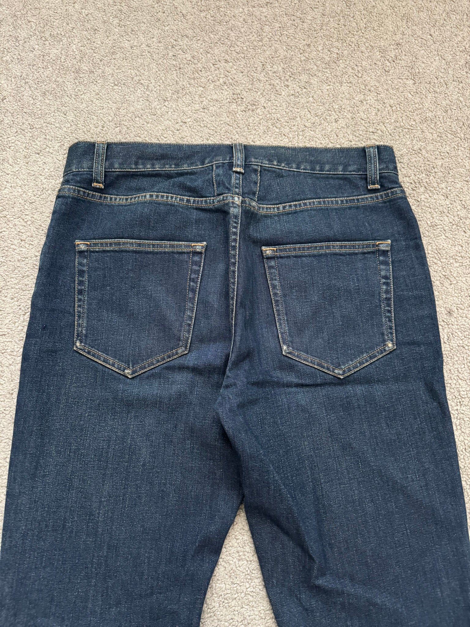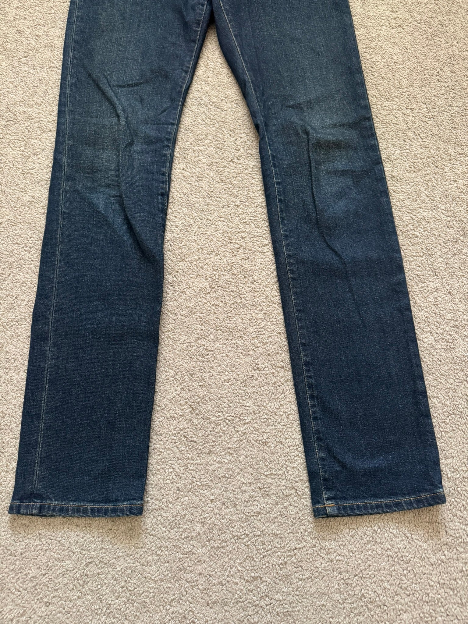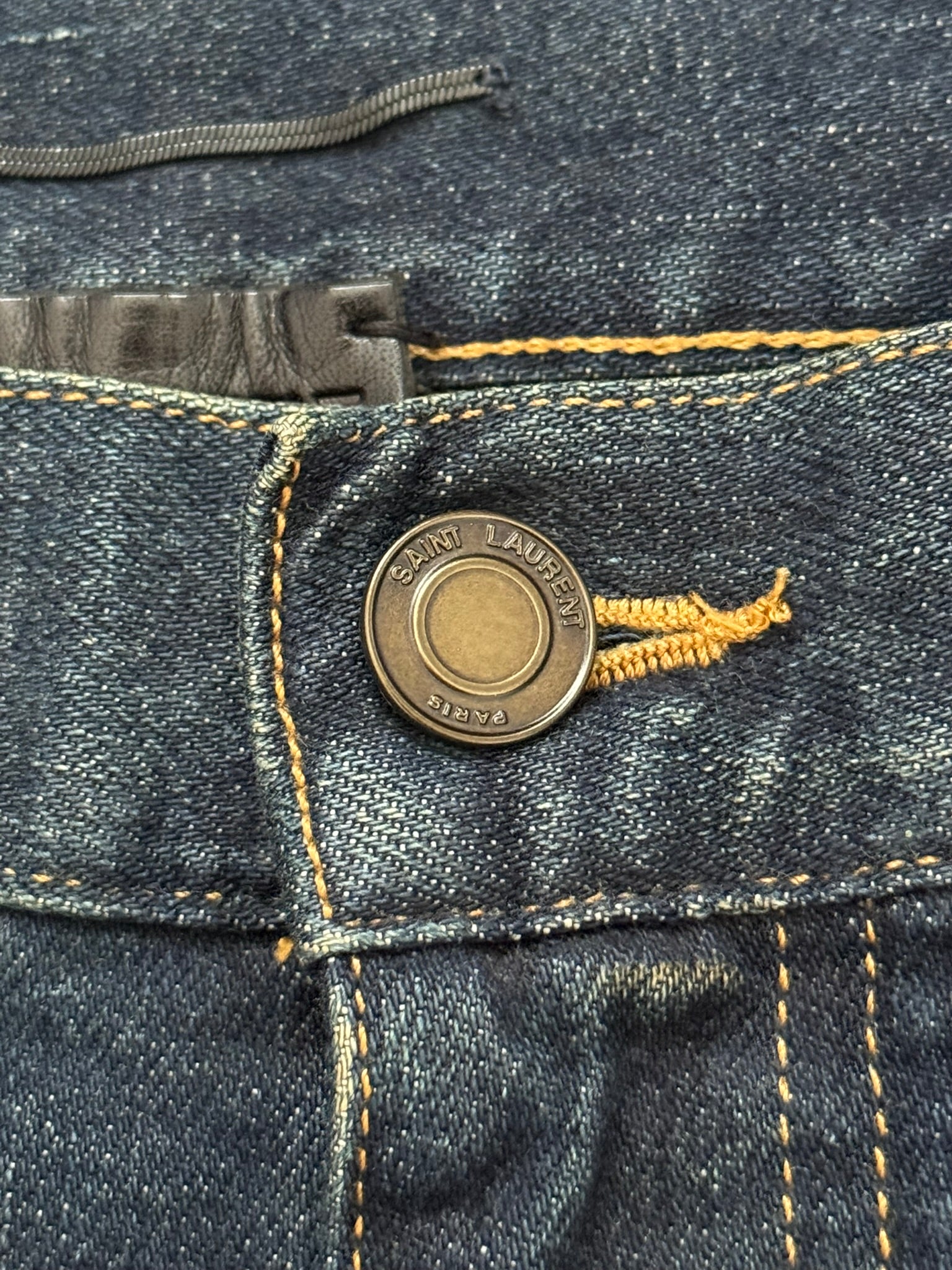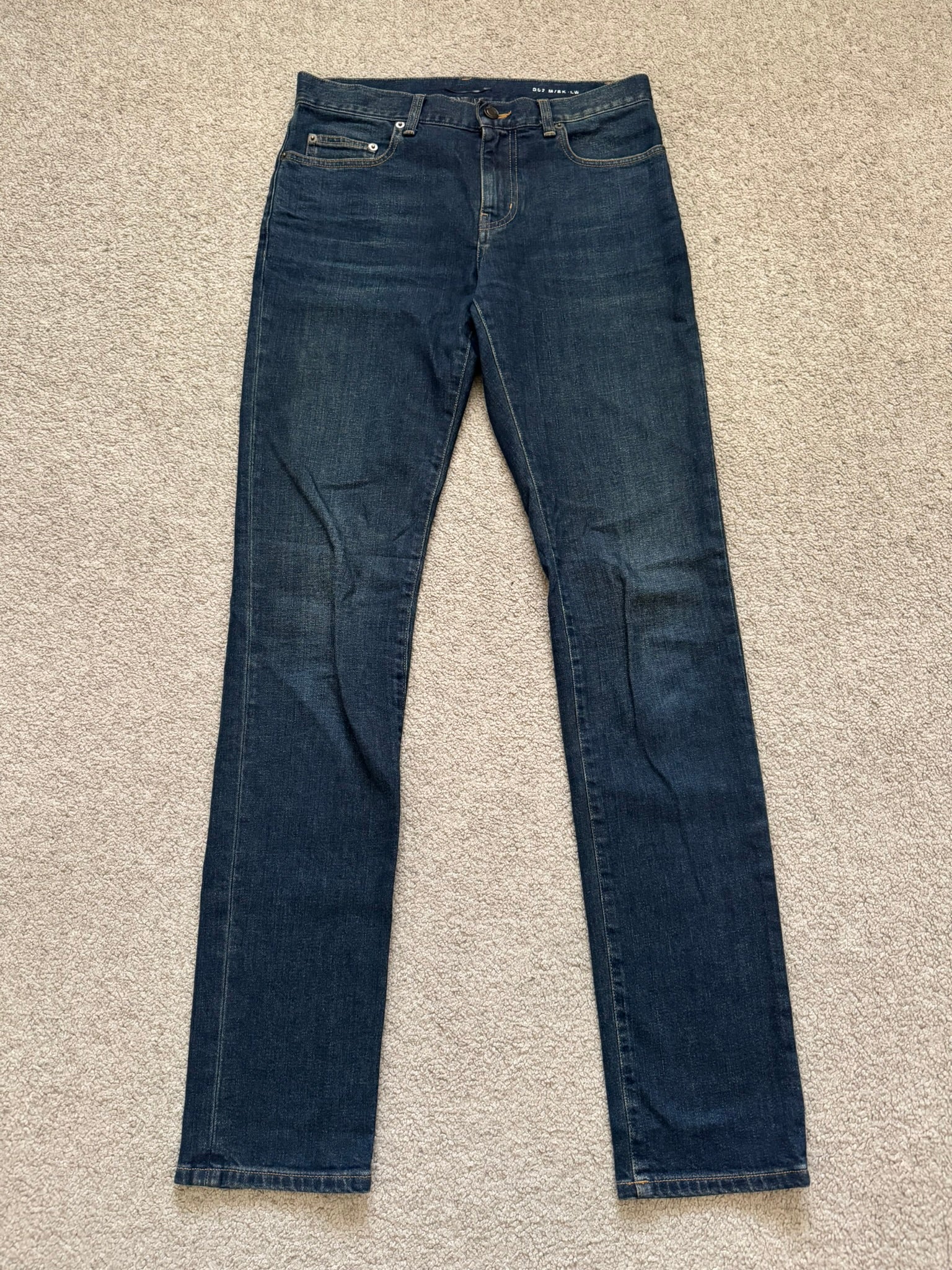 From Hedi Slimane's tenure at Saint Laurent and his FW16 collection. These skinny D02 blue denim jeans in a dirty medium wash feature a classic five pocket design, a button + zipper fly, and the inner leather tag + chain detail. In great condition, intentional wear throughout; no other real flaws. Made in Italy. Tagged a size 29.