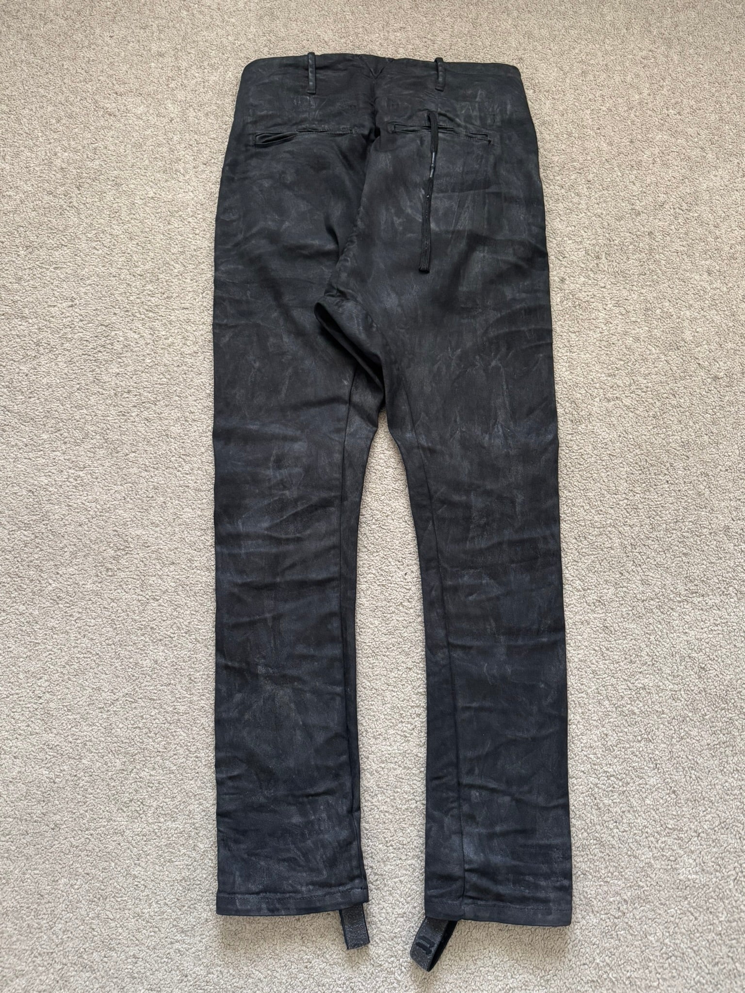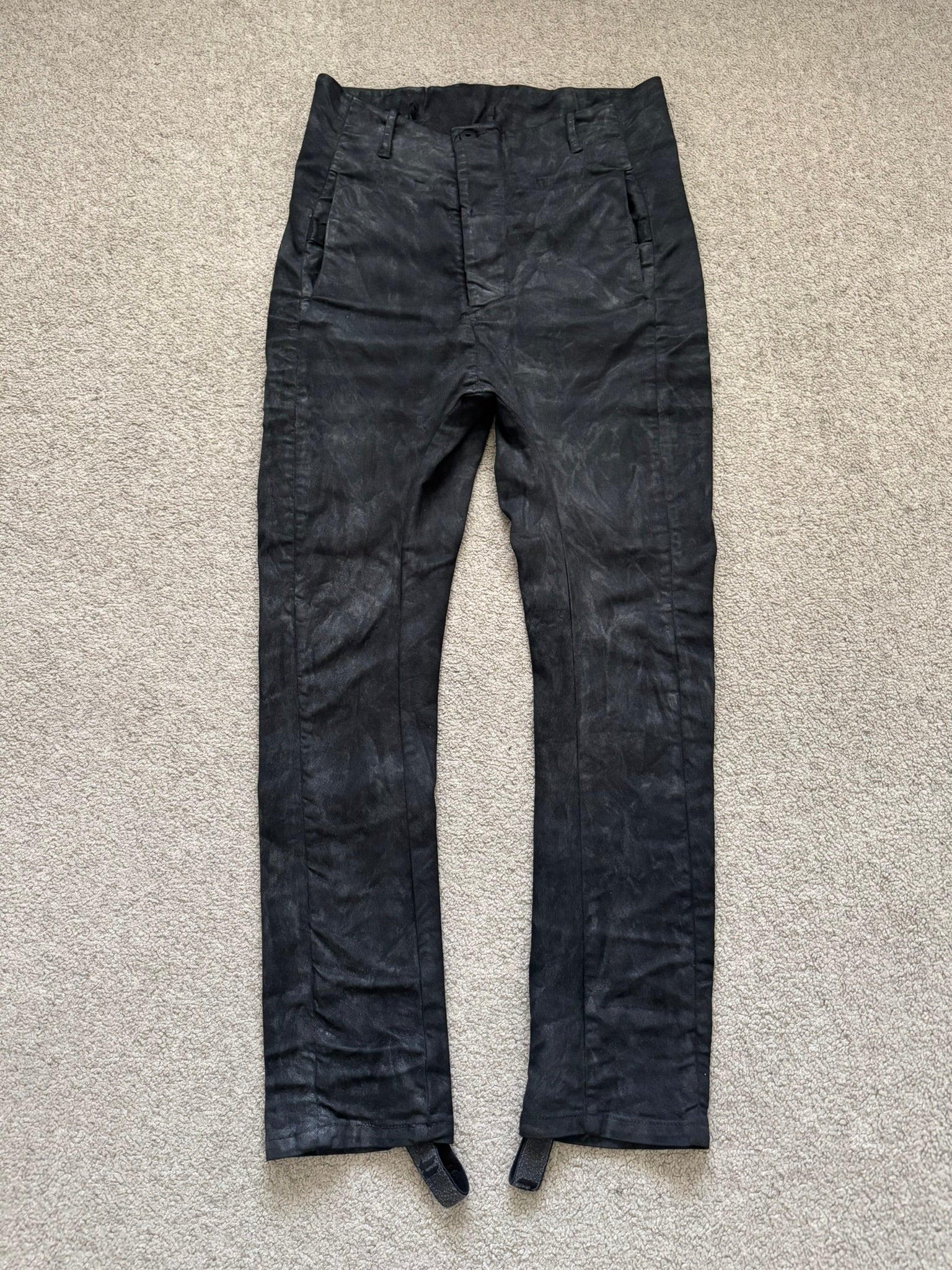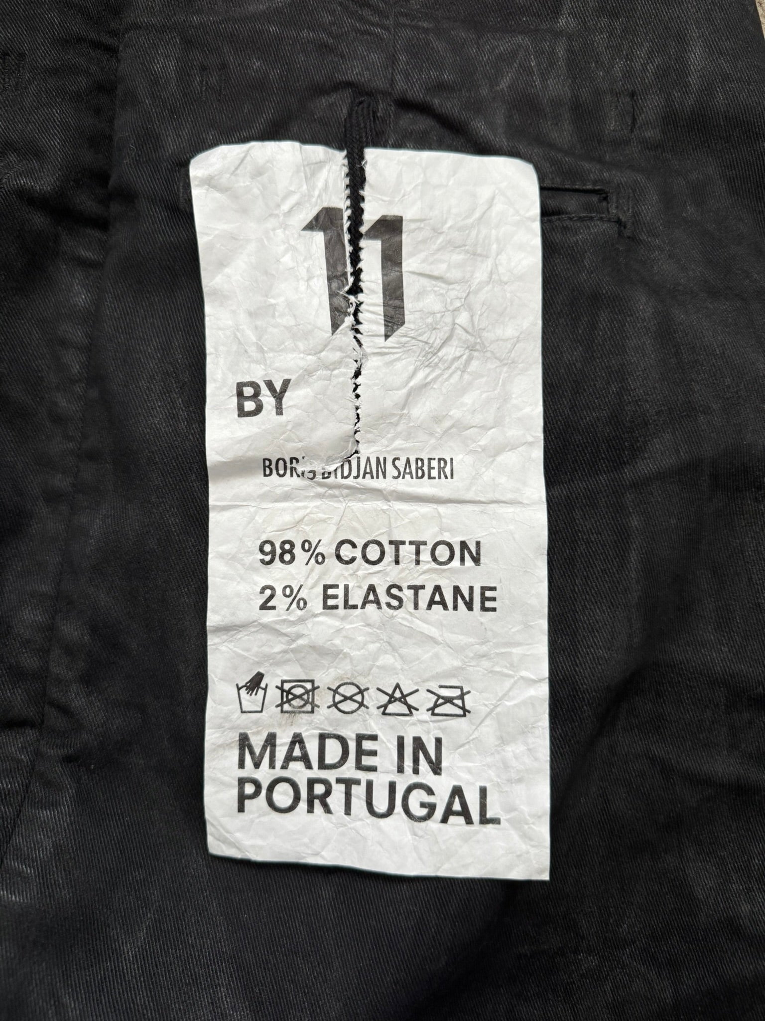 From Boris Bidjan Saberi's "11 By BBS" line and their FW17 collection. These beautiful black jeans in their "P11" model made from a heavy denim stretch material features a special marble wax coating throughout, asymmetrical button fly, 5 pocket snap button construction, elasticized stirrup at hems to either cinch opening at a certain part of the leg or to go under the feet, and an extended tassel tag at the back pocket. Has a J-cut construction that is meant for stacking. In great condition, no real flaws. Made in Portugal. Tagged a size small.
