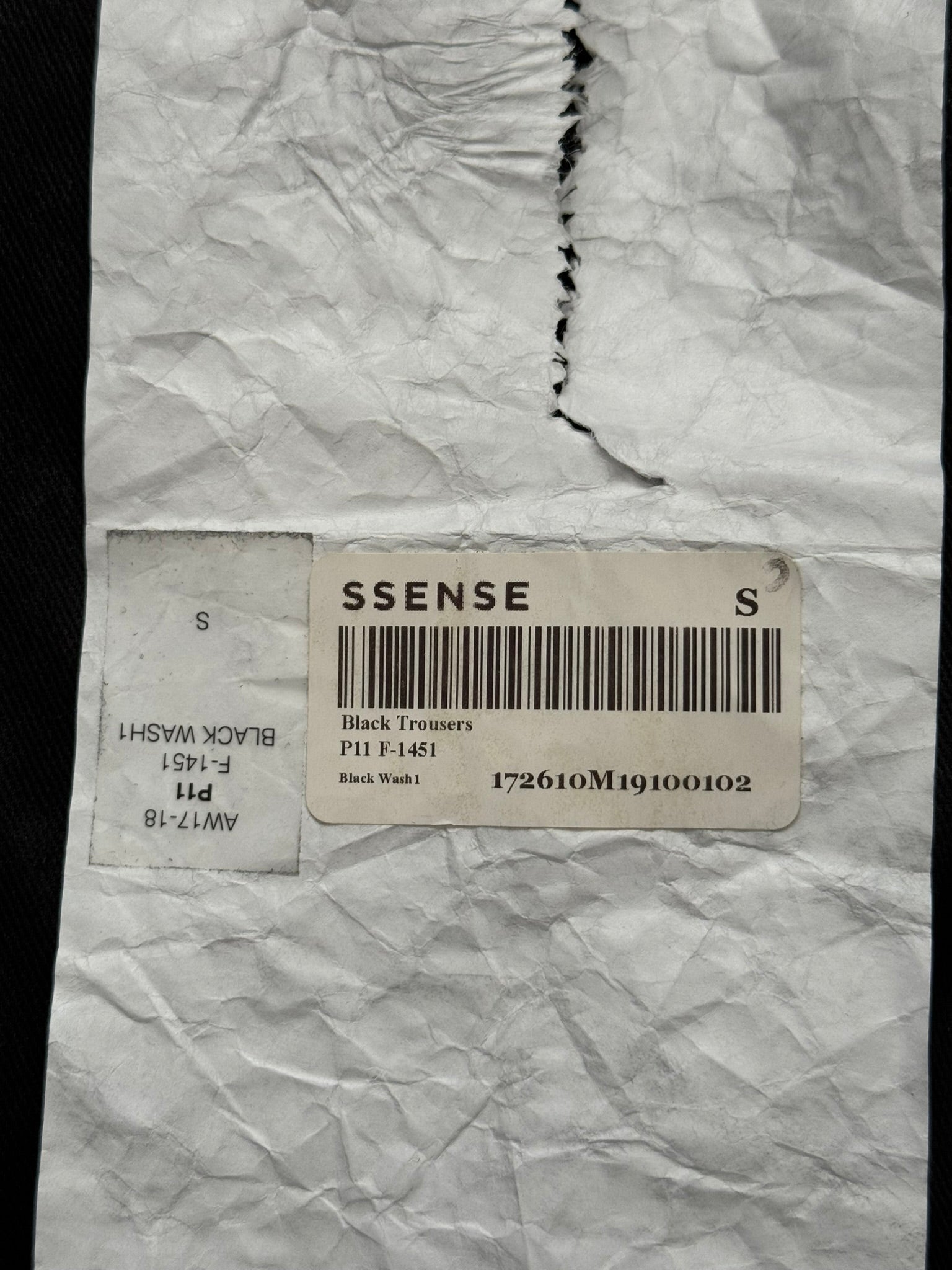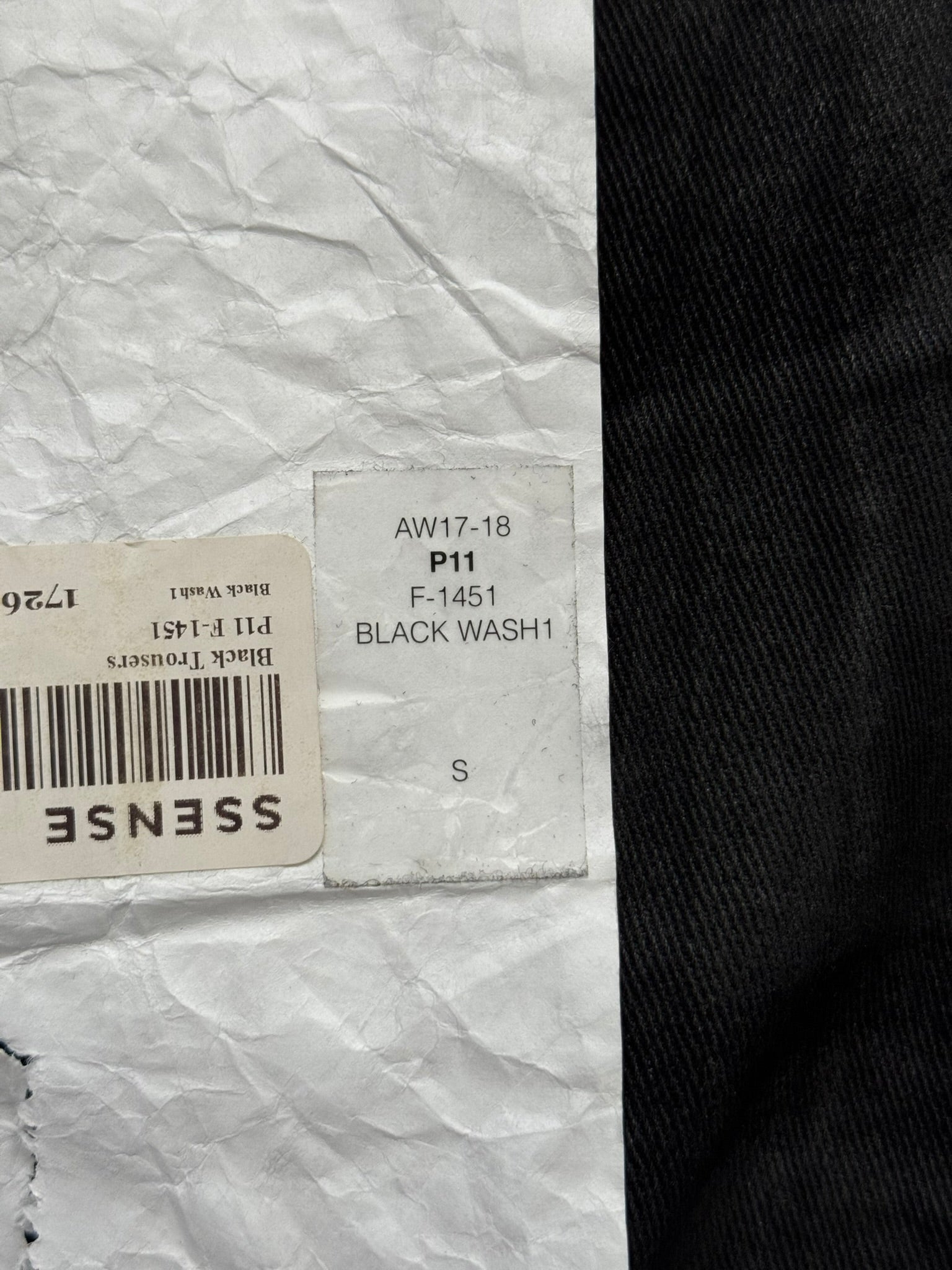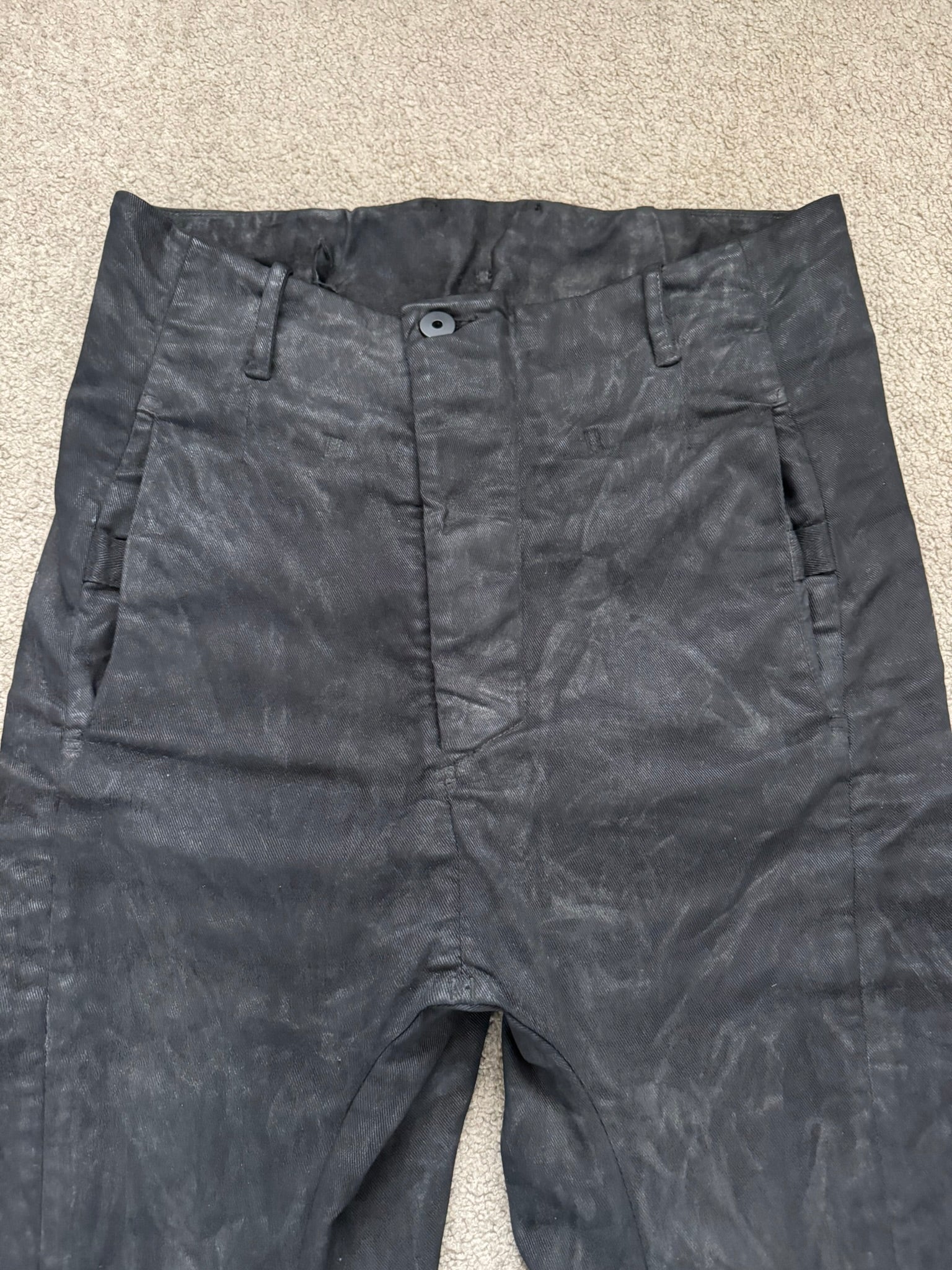 From Boris Bidjan Saberi's "11 By BBS" line and their FW17 collection. These beautiful black jeans in their "P11" model made from a heavy denim stretch material features a special marble wax coating throughout, asymmetrical button fly, 5 pocket snap button construction, elasticized stirrup at hems to either cinch opening at a certain part of the leg or to go under the feet, and an extended tassel tag at the back pocket. Has a J-cut construction that is meant for stacking. In great condition, no real flaws. Made in Portugal. Tagged a size small.