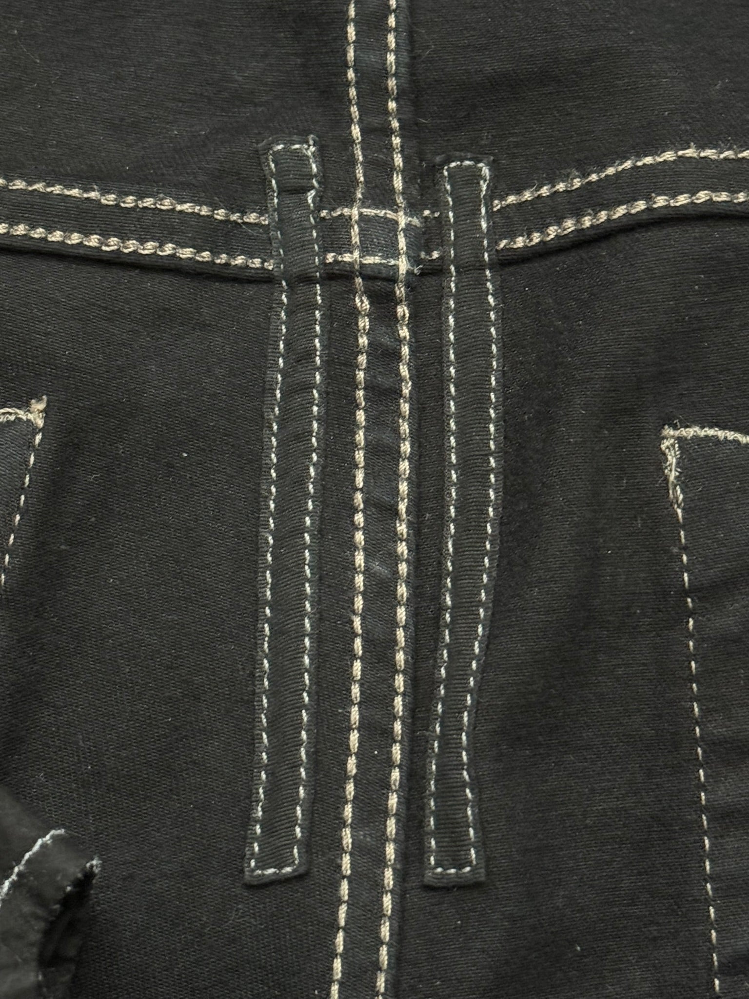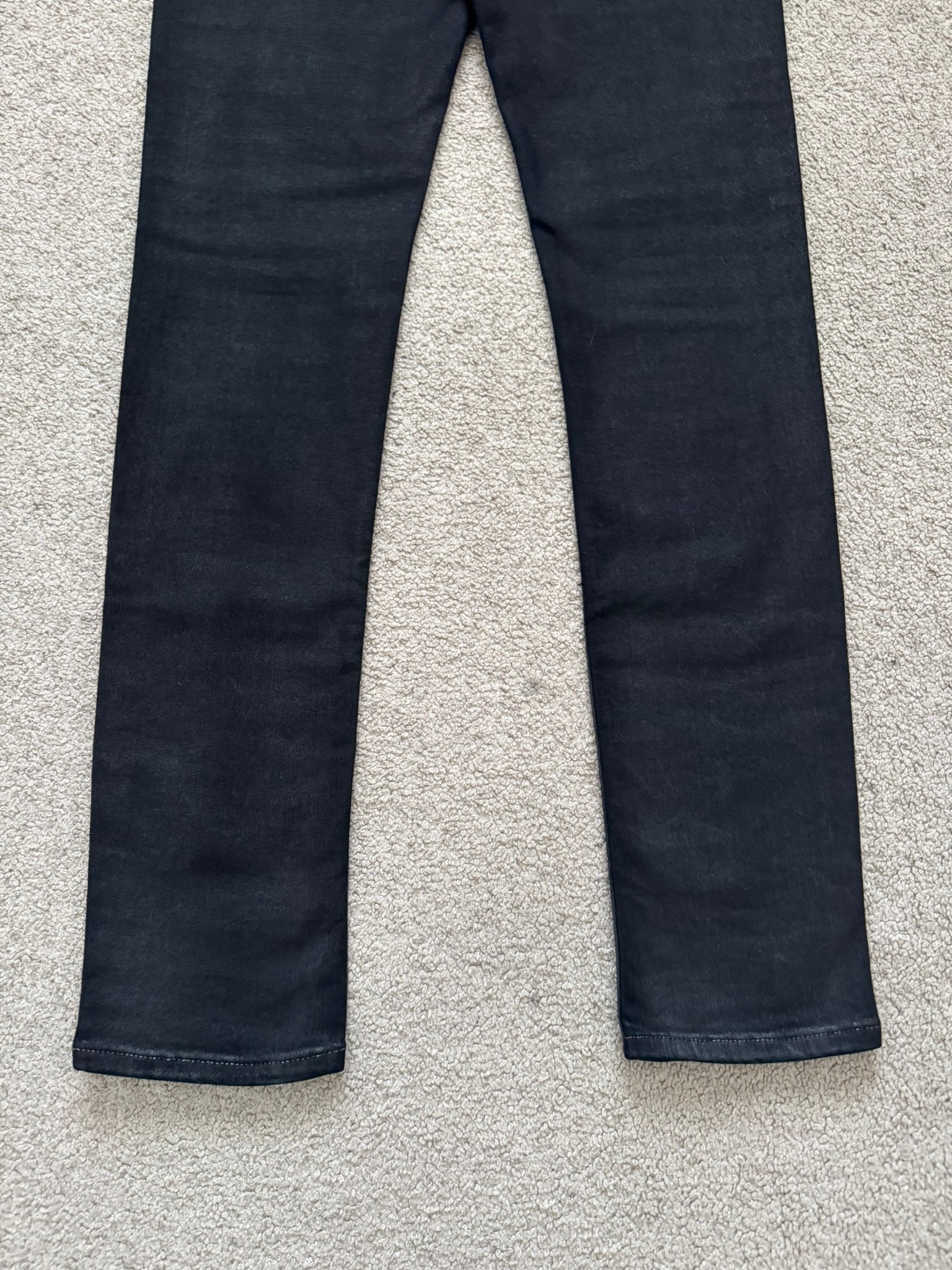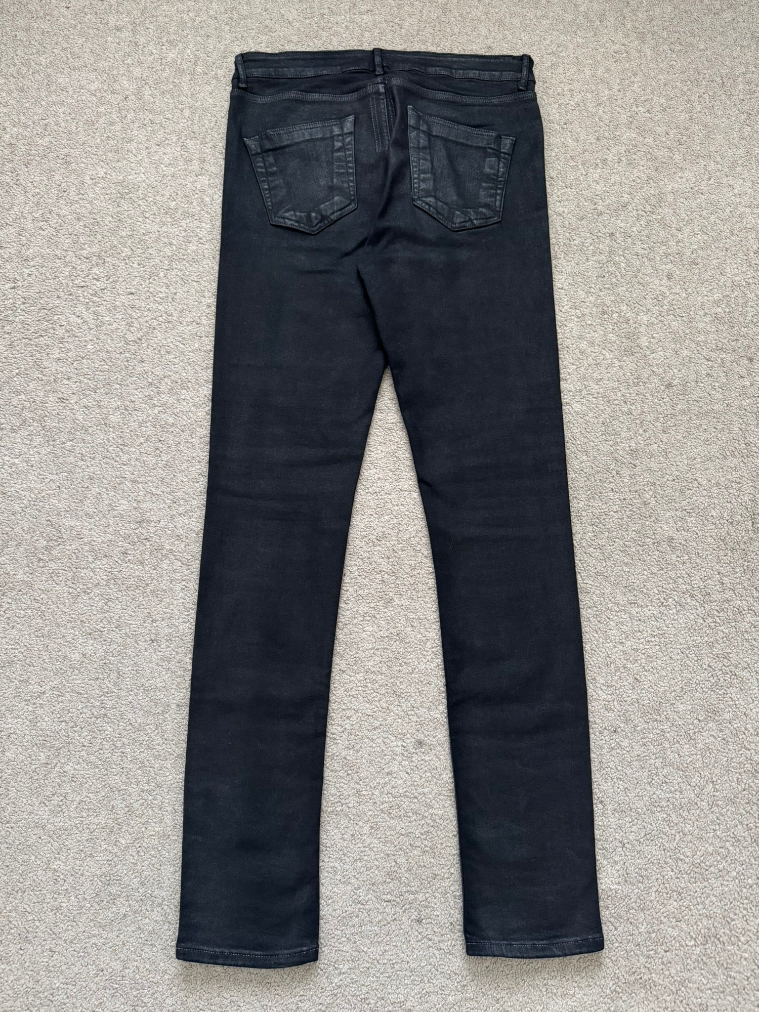 From Rick Owens’s DRKSHDW line and his FW19 collection titled "Larry." These black stretch denim jeans in their skinny fit "Tyrone" cut features a matte wax coating throughout, darting details on the thighs, six pocket layout, and a button fly. In great condition, no real flaws. Made in Italy. Tagged a size 33, can fit many sizes due to stretchiness.