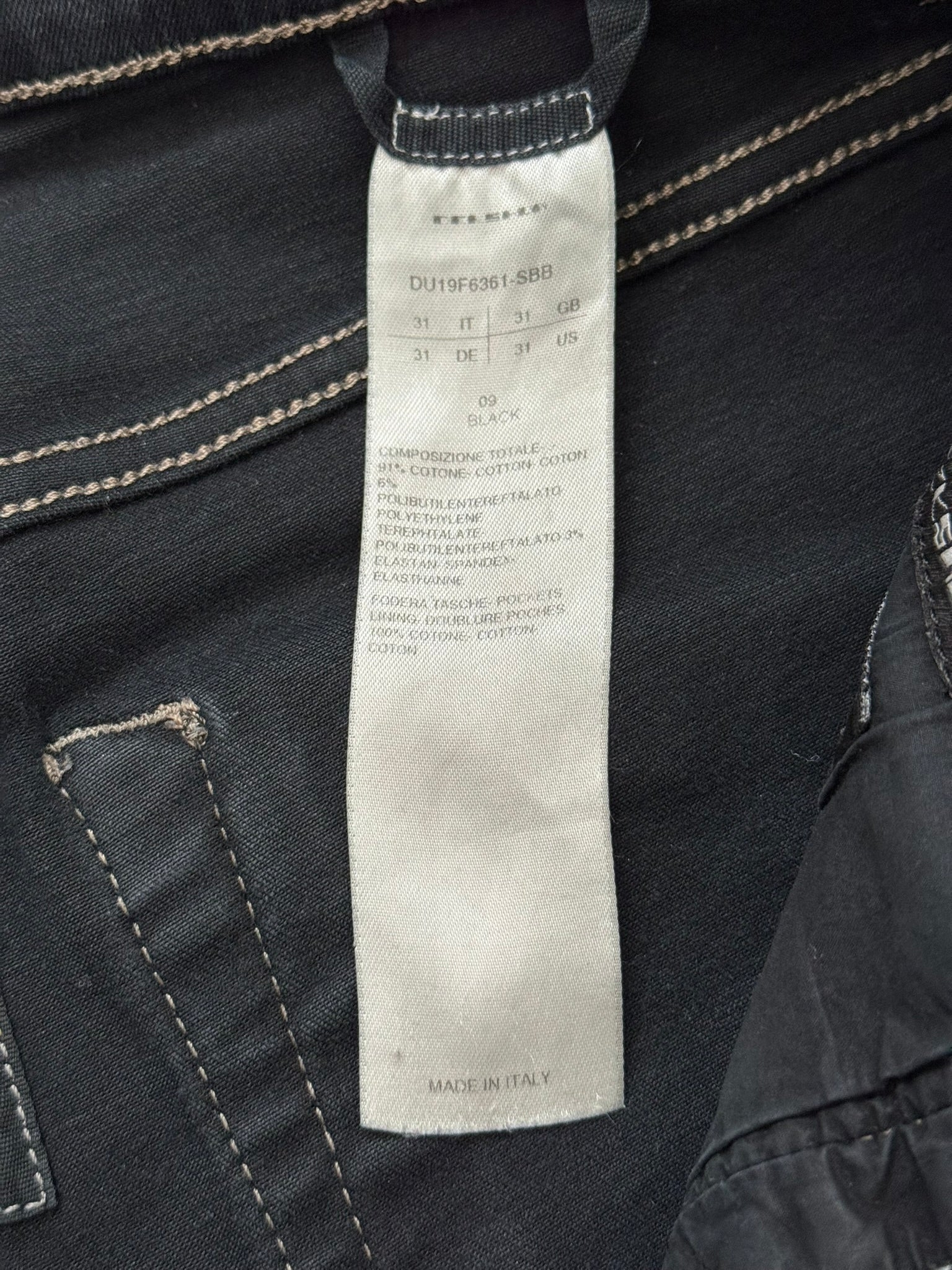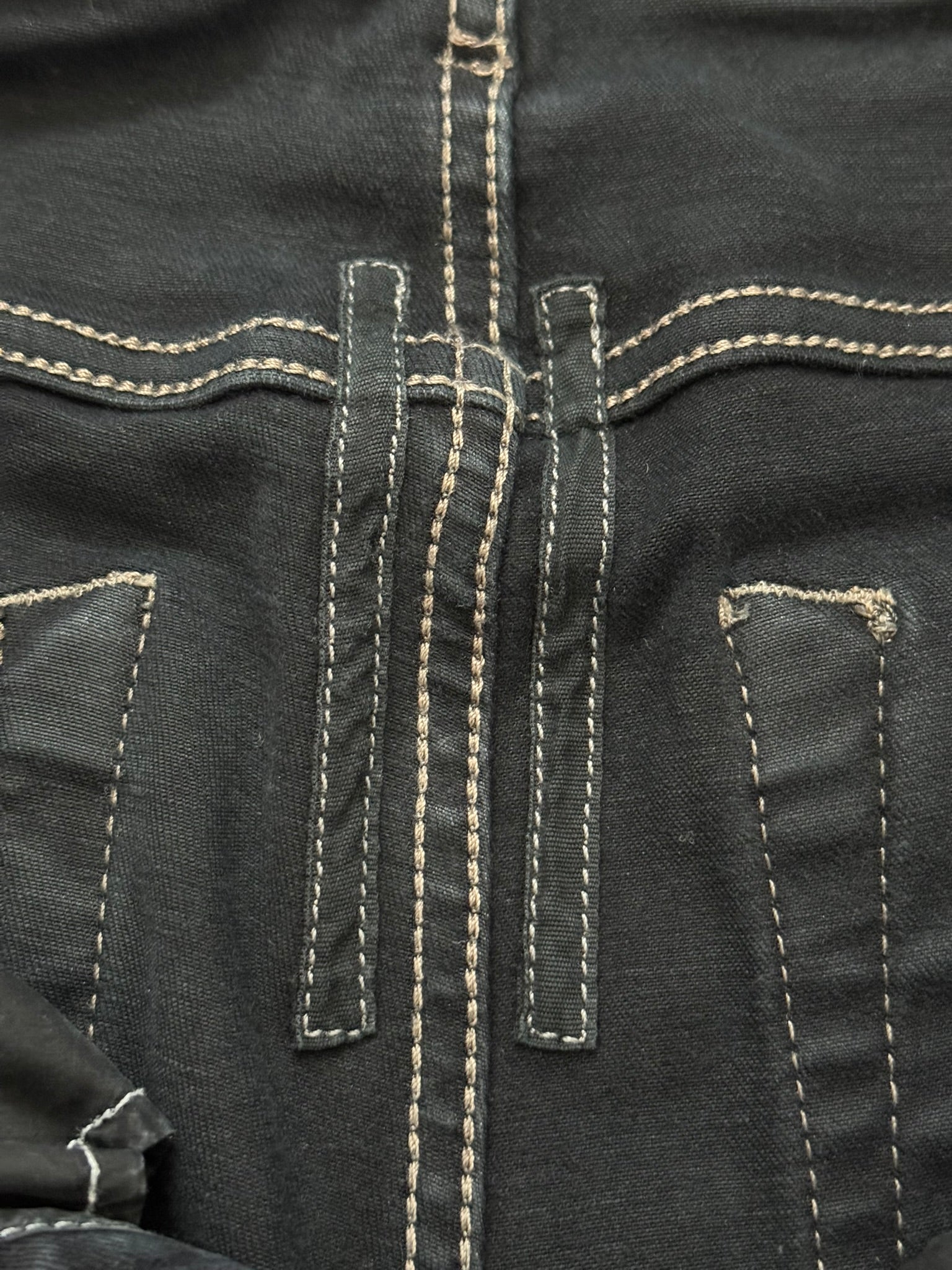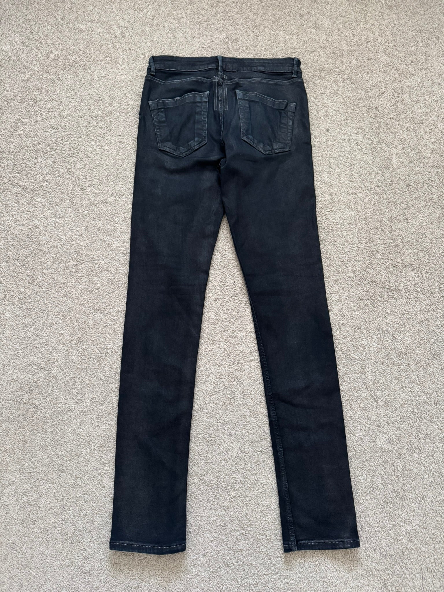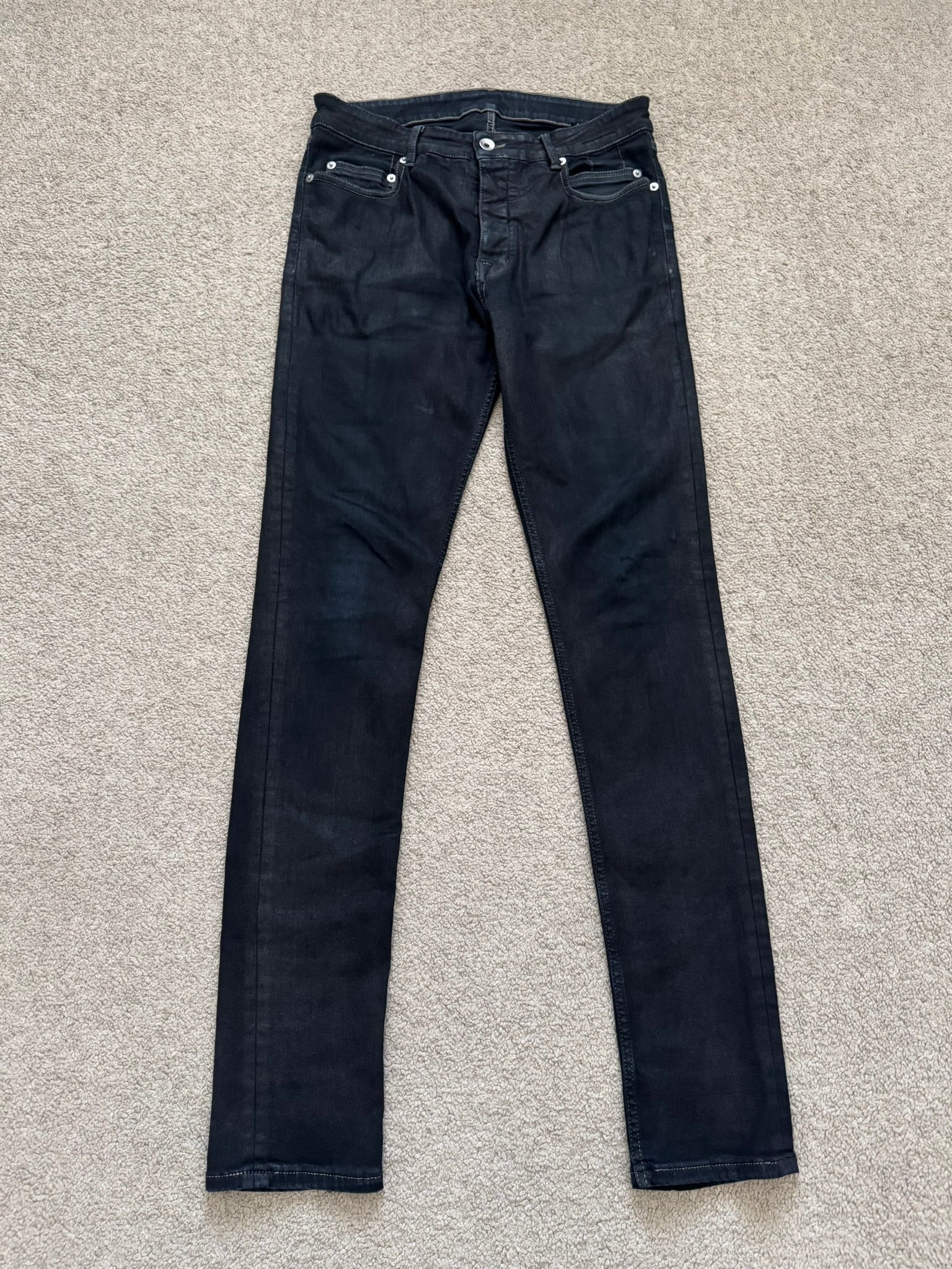 From Rick Owens's DRKSHDW line and his FW19 collection titled "Larry." This pair of skinny black stretch denim jeans in their "Tyrone" cut feature a subtle wax coating throughout the pants, six pocket layout, and a button fly. In good condition, color has faded with hints of navy and has minor repair on back; no other real flaws. Everything as pictured. Made in Italy. Tagged a size 31, can fit bigger sizes due to stretchiness.