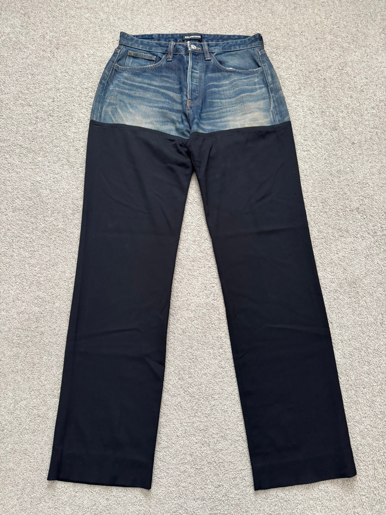 From Demna Gvasalia's Balenciaga and their FW20 collection. These hybrid paneled pants/jeans feature a faded medium mud wash denim at the upper part, black lightweight wool twill at the lower part, a text logo patch at the back, and a button fly with embossed text logos. As featured on the runway in the other version. In great condition, no real flaws. Made in Japan. Tagged a size 30.