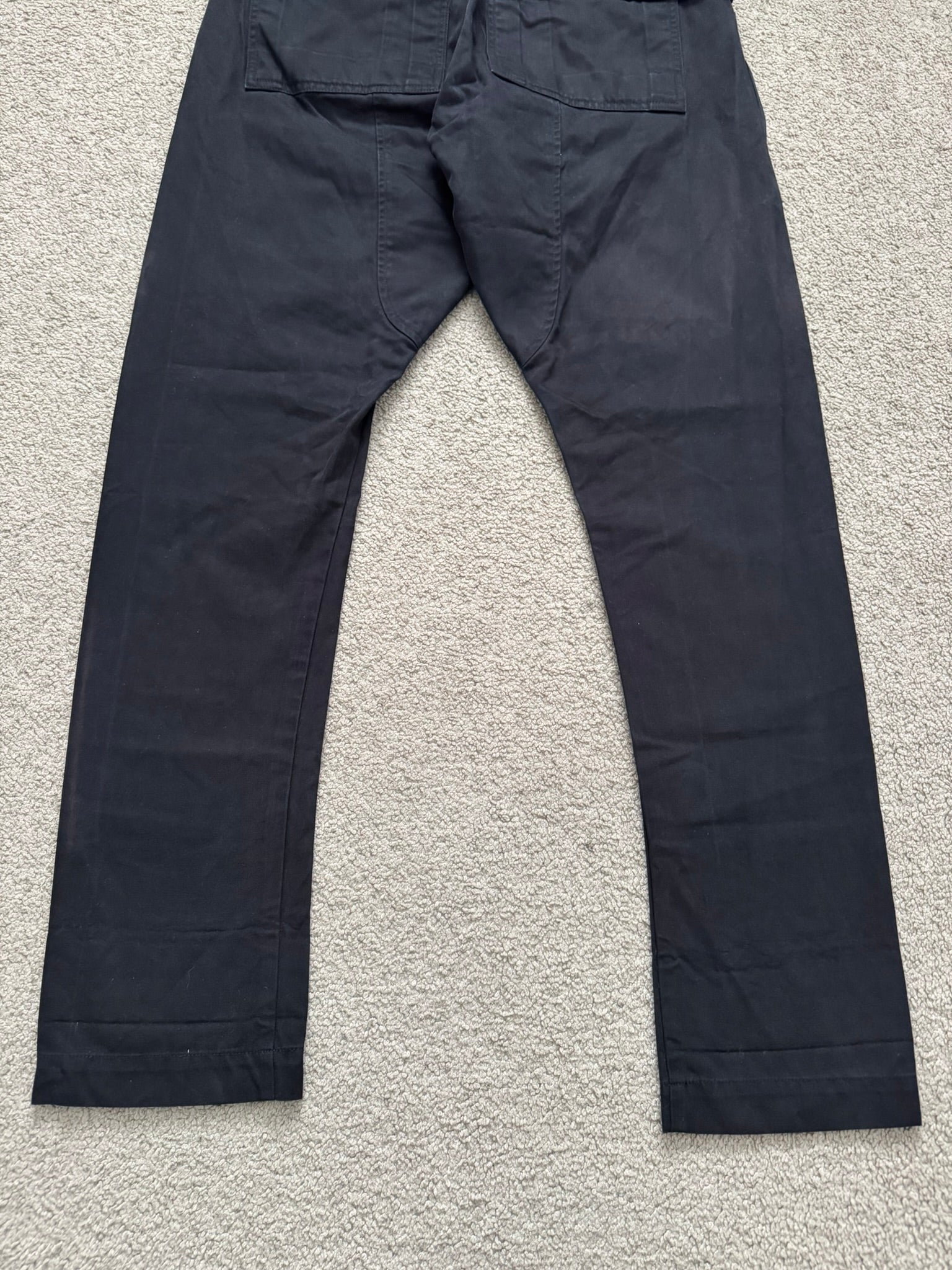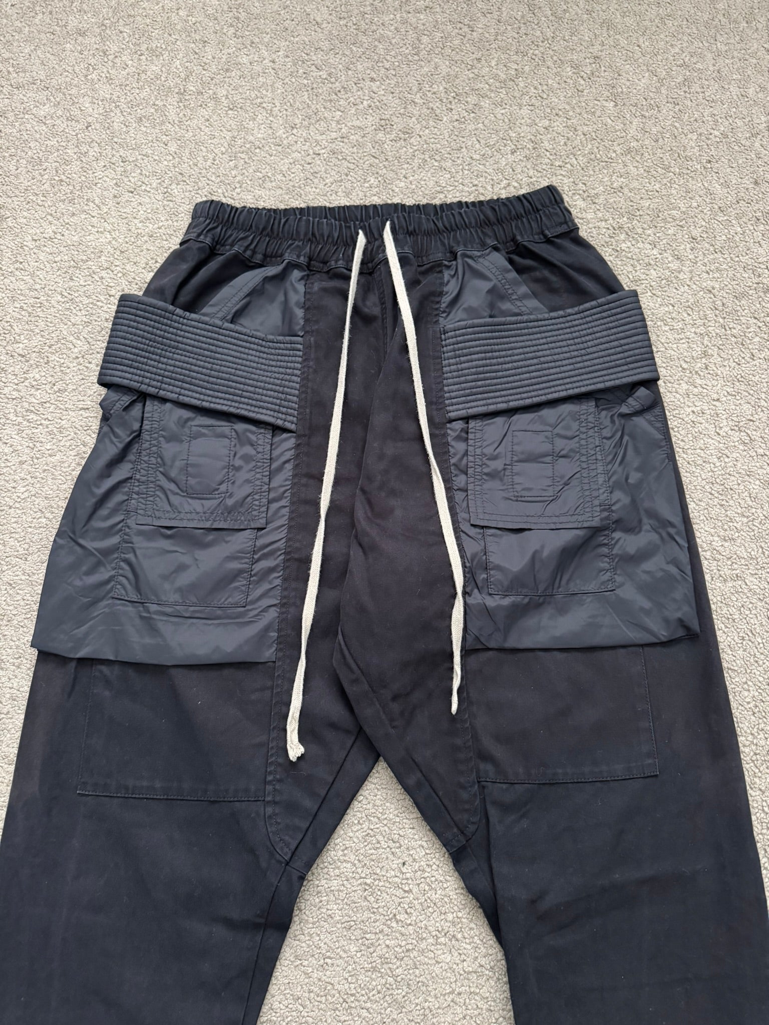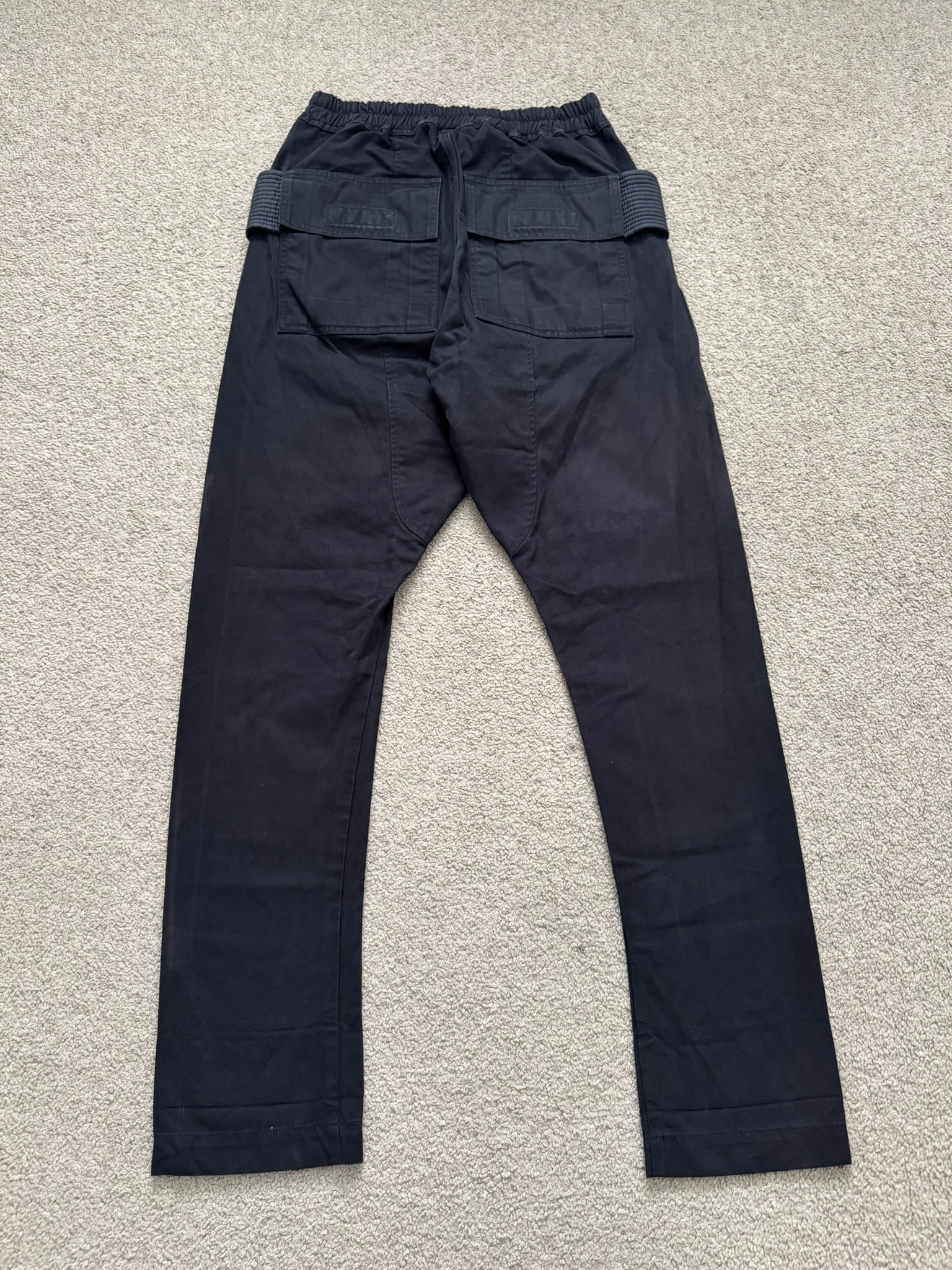 From Rick Owens’s DRKSHDW line and his FW20 collection titled “Performa.” These black “Creatch” cargo pants mainly made from a cotton twill material features an elasticated waistband that can be adjusted by its elongated drawstrings, two front side pockets, two front cargo pockets made from nylon with Velcro closures, and two back Velcro flap pockets. In great condition, no real flaws besides minor fading at side. Everything as pictured. Made in Italy. Tagged a size extra small, fits many sizes due to waistband. Waist is measured at untightened state.