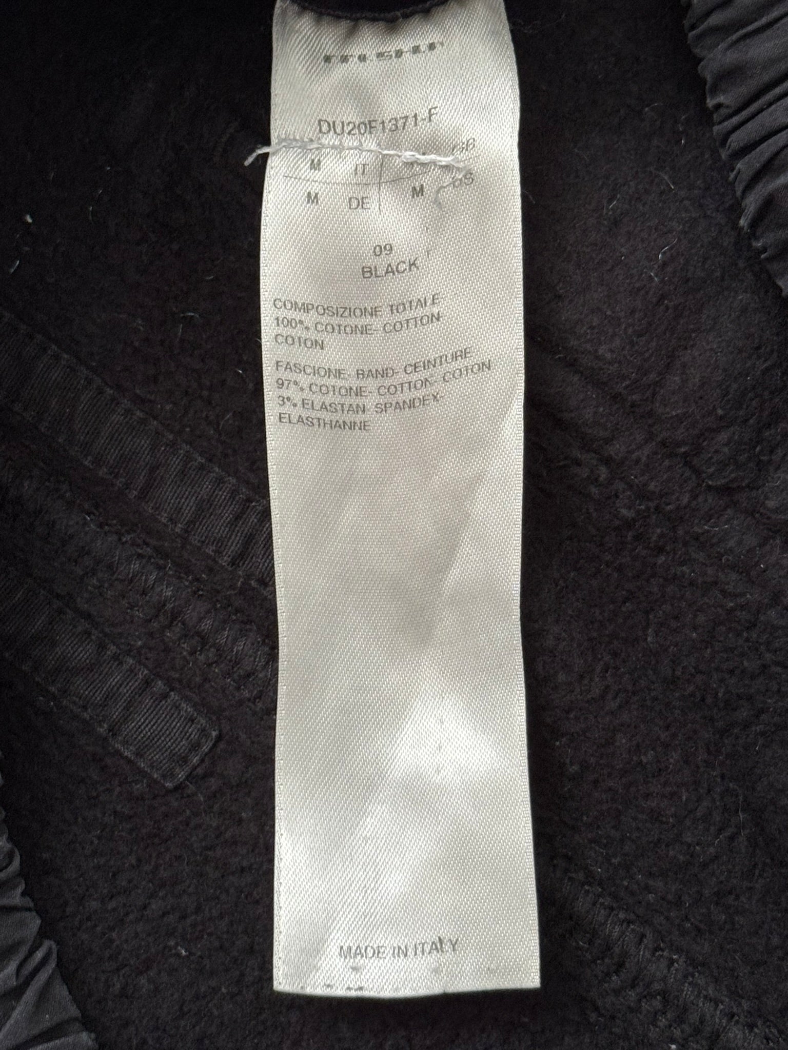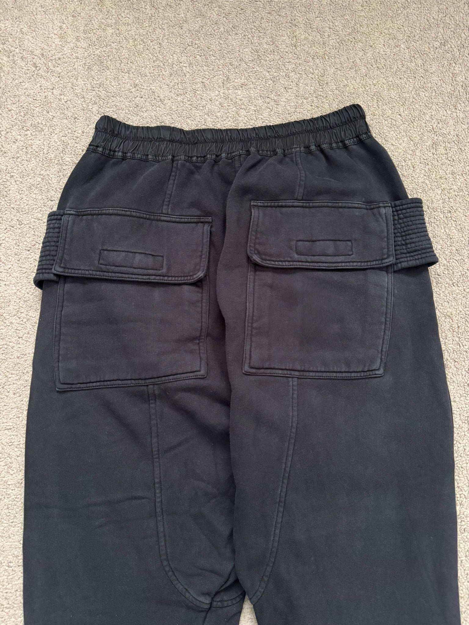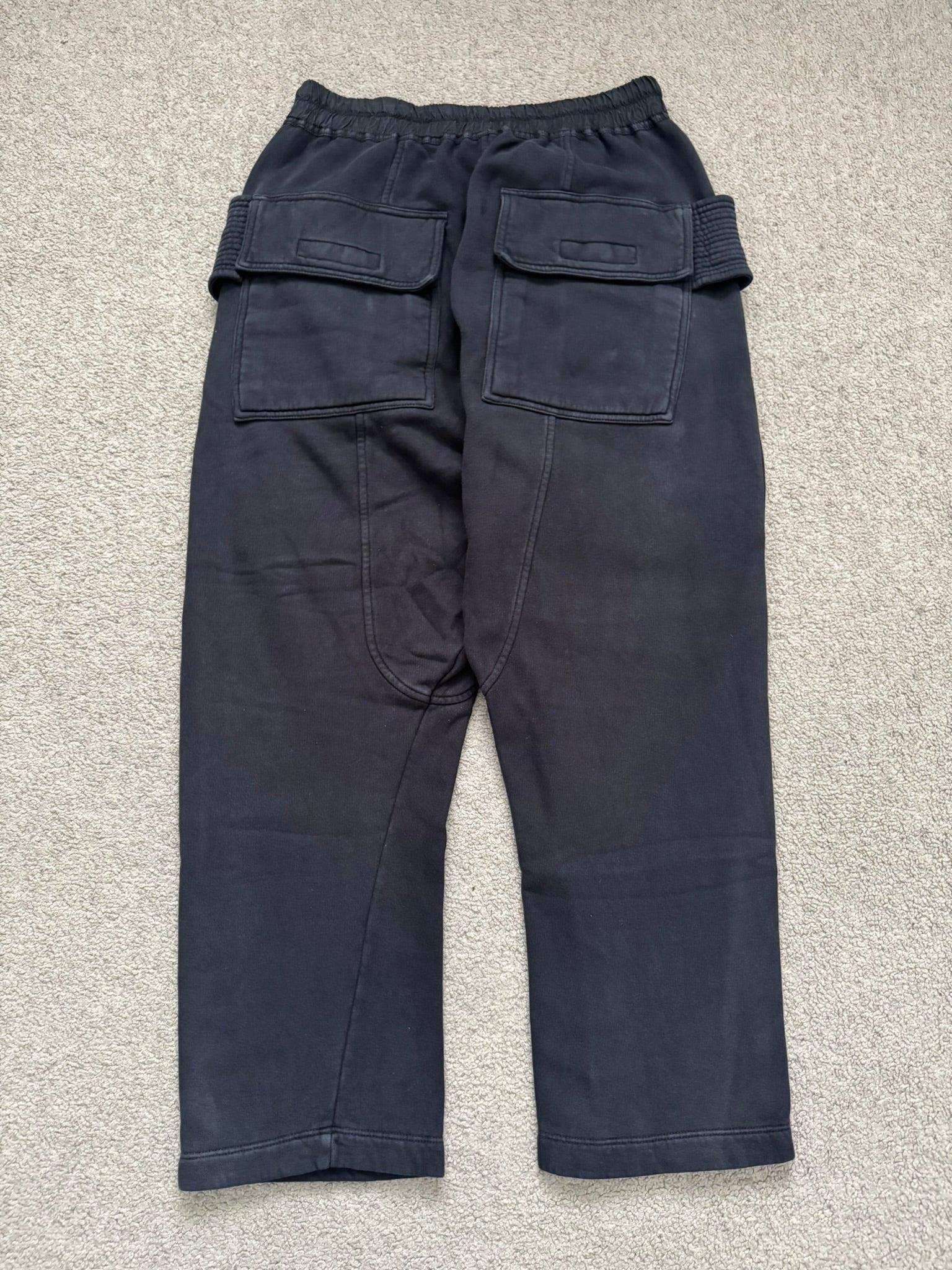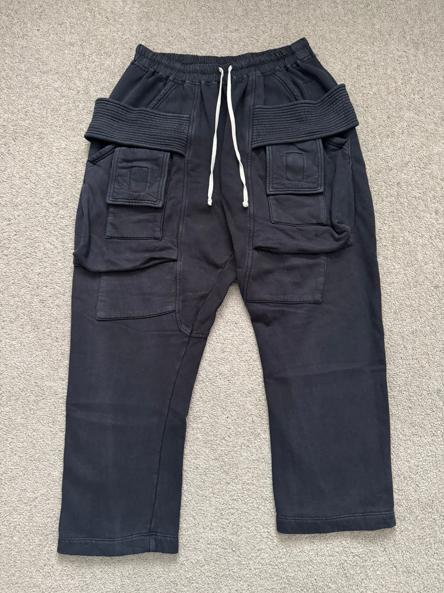 From Rick Owens’s DRKSHDW line and his FW20 collection titled “Performa.” These cropped black “Creatch” cargo pants made from their heavyweight "felpa" cotton material features an elasticated waistband that can be adjusted by its elongated drawstrings, two front pockets, two front cargo pockets with Velcro closures, and two back Velcro flap pockets. In great condition, no real flaws. Made in Italy. Tagged a size medium, fits many sizes due to waistband. Waist is measured at untightened state.