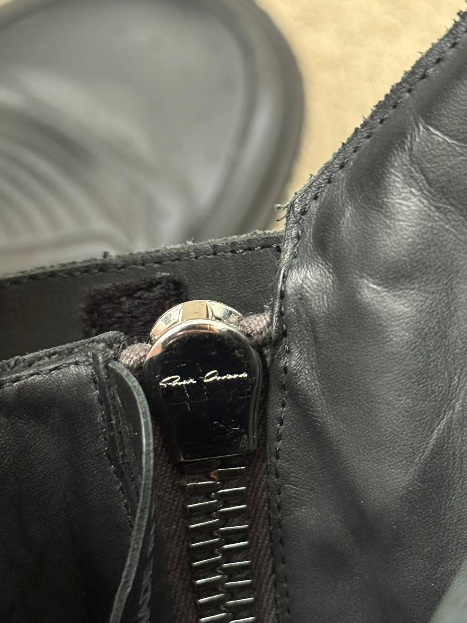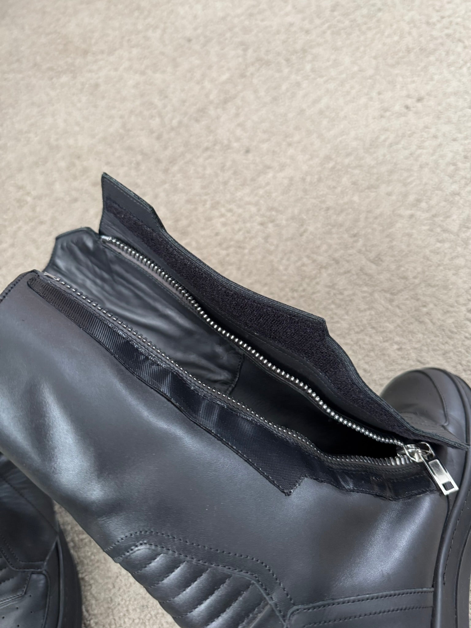 From Rick Owen’s namesake mainline label and their FW23 collection titled "Luxor." These extremely rare laceless biker/moto style "Dunk" sneakers in an all black calf leather features ribbed details at the front, a long shaft with an extended tongue, hidden silver Raccagni side zippers on each shoe with Velcro fasteners, the classic rubber sharktooth soles, and a removable insole. In amazing condition, hardly any wear at all with no real flaws. Almost brand new. Comes in the original box. Made in Italy. Tagged a size 42, fits around a size U.S. 9 to 10.