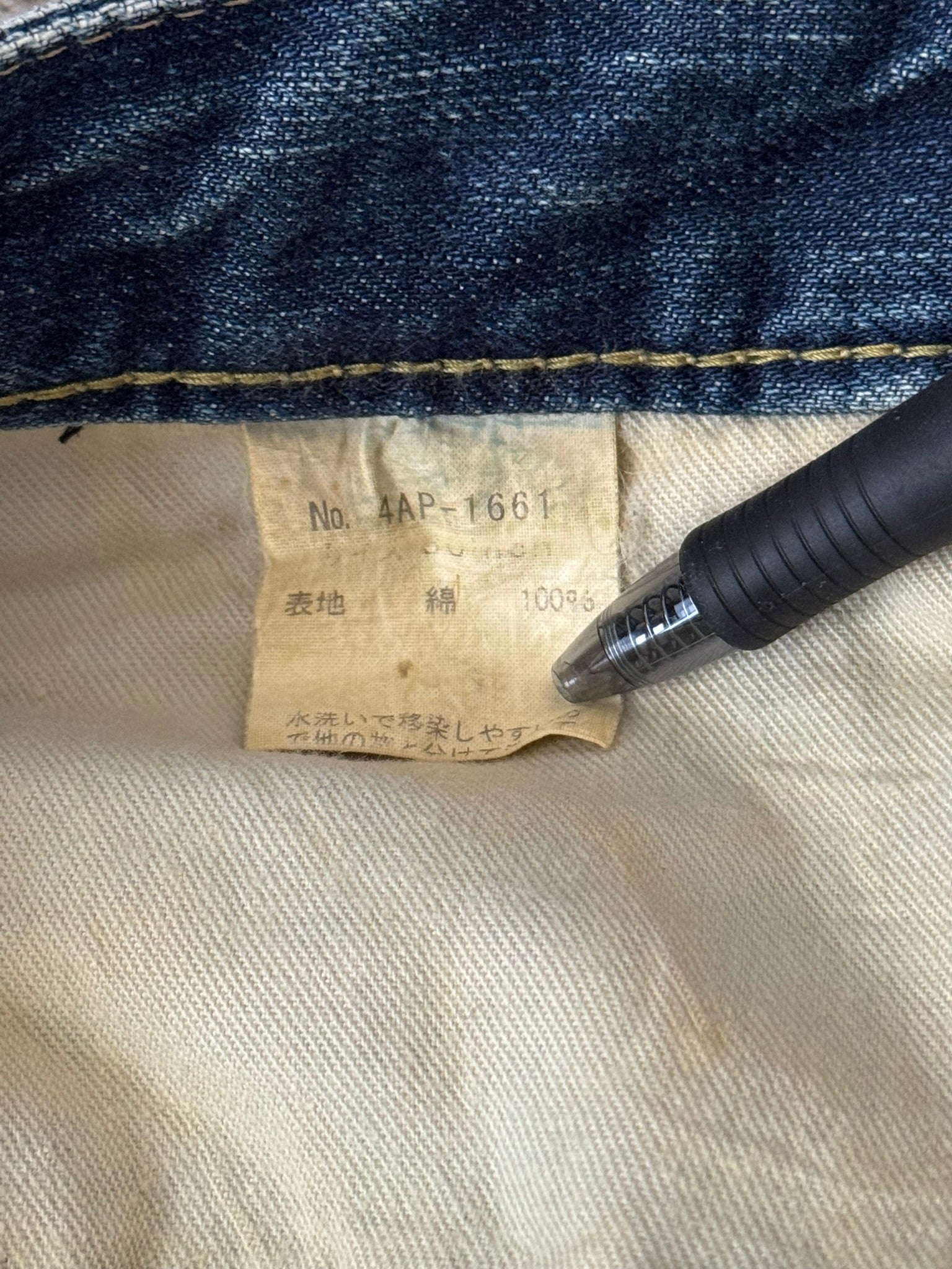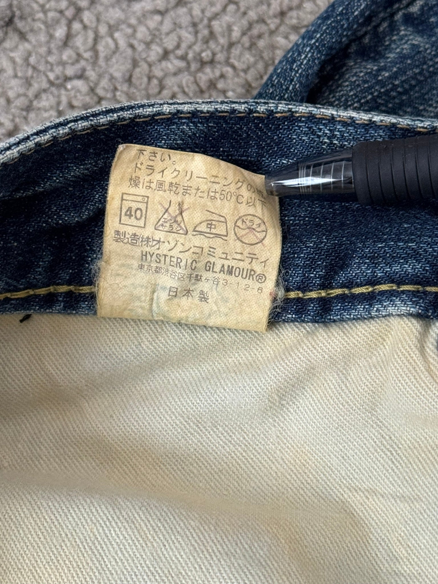 From Nobuhiko Kitamura's Hysteric Glamour. These blue denim jeans are a staple offering from the brand and feature their signature studs around one of the pockets, a slight flare, intentional fading, distressing, and repairs throughout, button fly closure with embossed logos, rivets also with embossed logos, and a branded leather patch on the back. In great condition, no real flaws as all wear is intended. Made in Japan. Tagged a size 30.