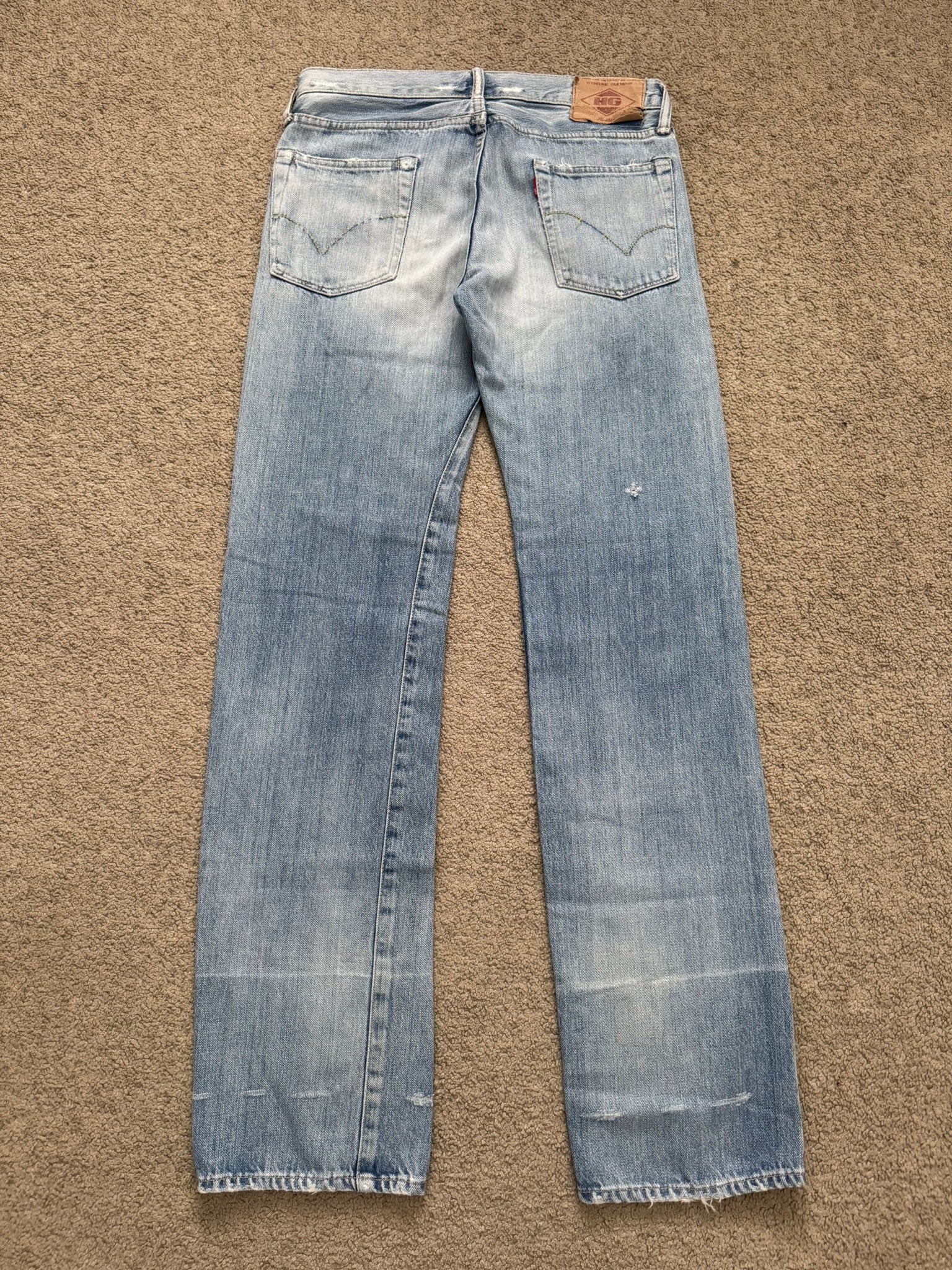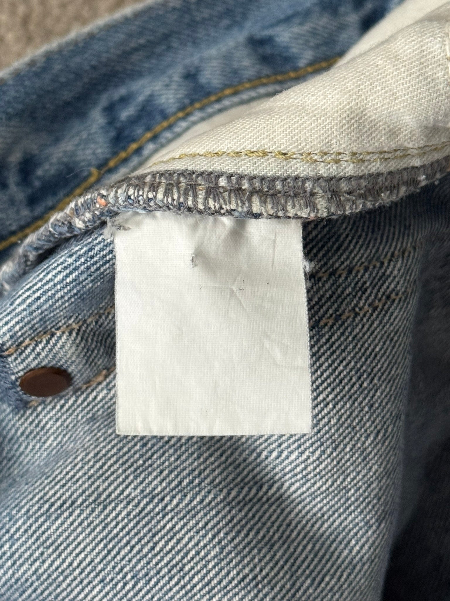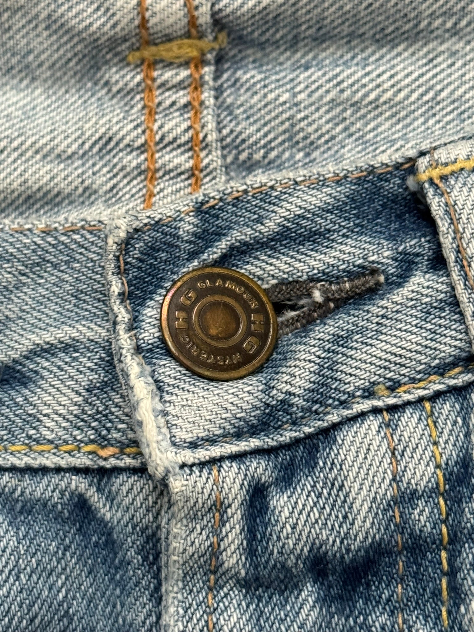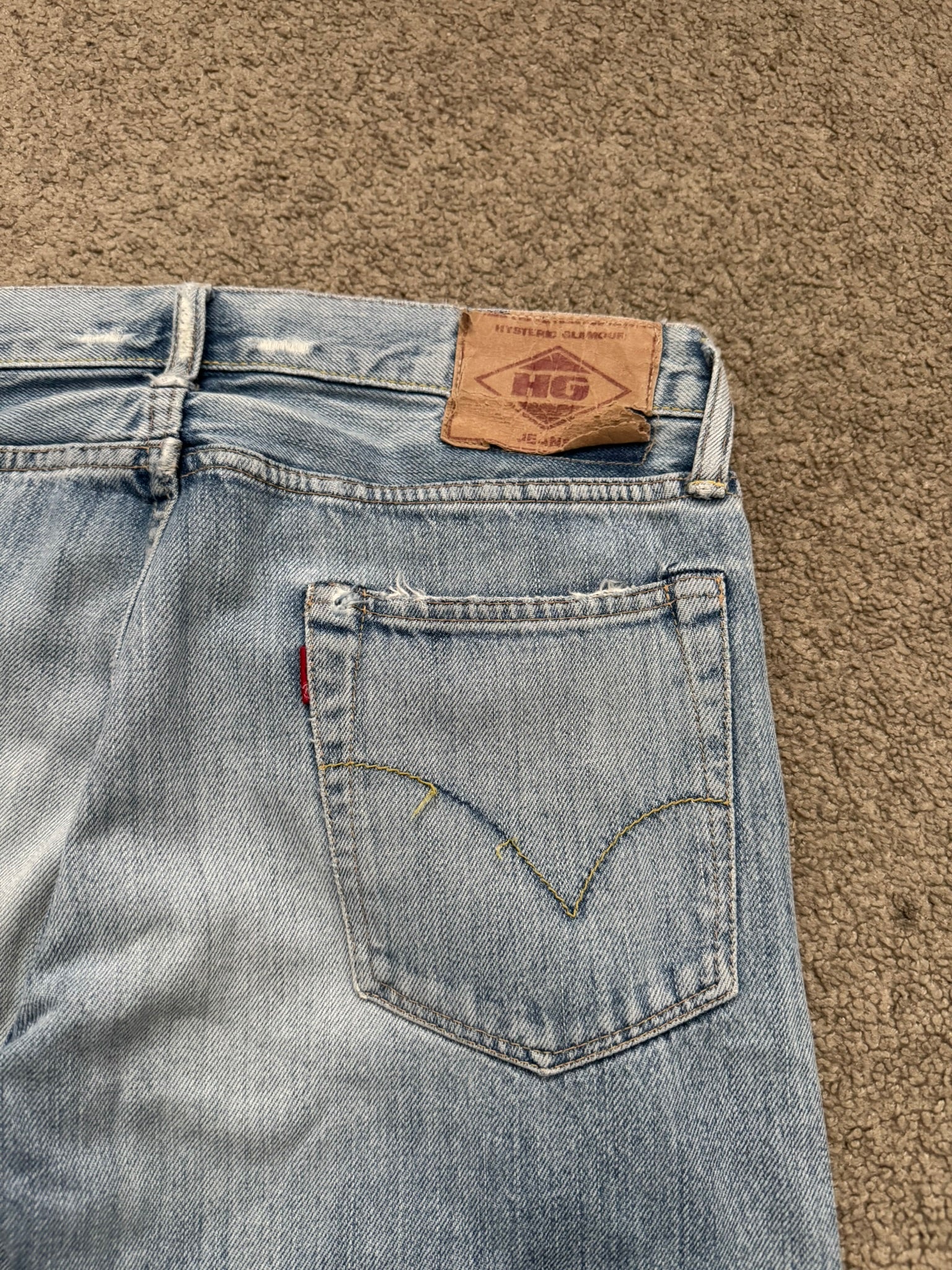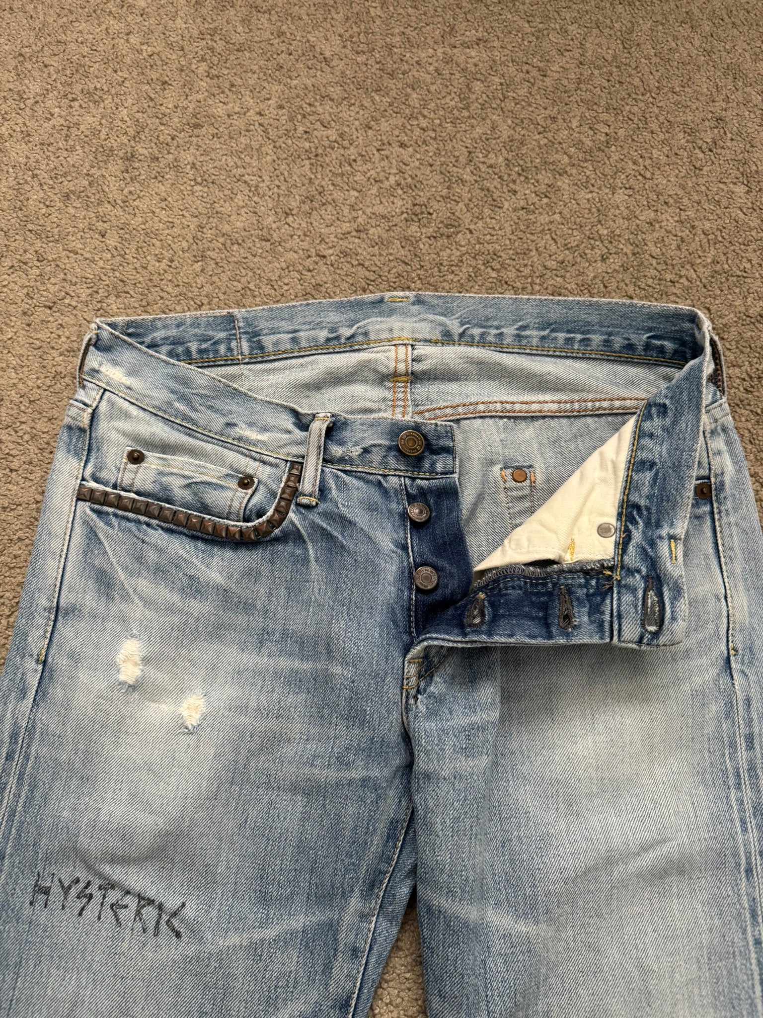 From Nobuhiko Kitamura's Hysteric Glamour. These light wash selvedge denim jeans are a staple offering from the brand and feature their signature studs around one of the pockets, intentional fading, distressing, and repairs throughout, "HYSTERIC" sharpie scribble graphic on front thigh, button fly closure with embossed logos, rivets also with embossed logos, and a branded leather patch on the back. In great condition, no real flaws as all wear is intended. Made in Japan. Tagged a size 30.